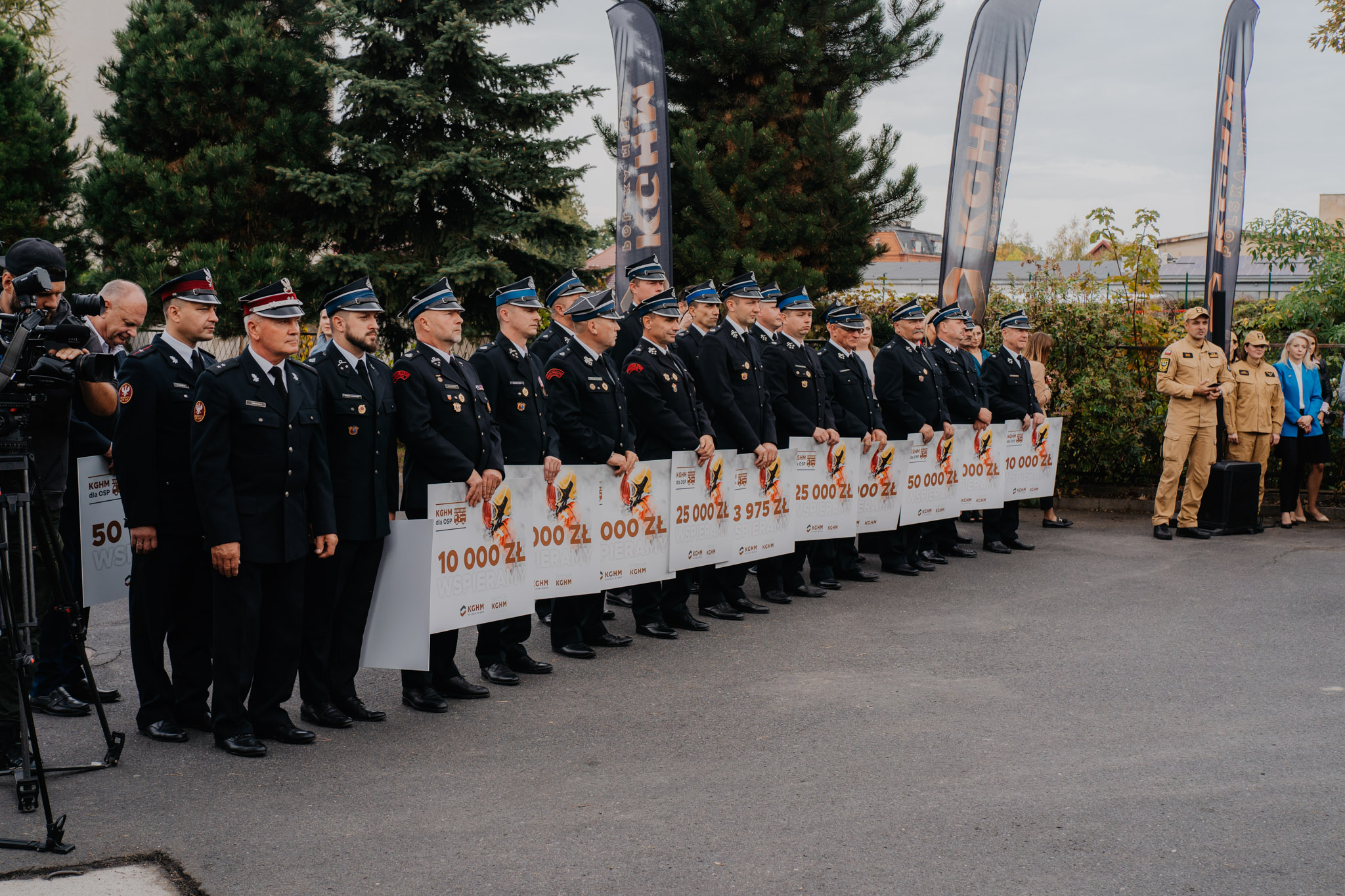 Oczywiście nie zabrakło beneficjentów konkursu – przedstawicieli jednostek Ochotniczych Straży Pożarnych, którzy z rąk Marszałek Sejmu Rzeczypospolitej Polska Pani Elżbiety Witek, Prezesa KGHM Polska Miedź S. A. Pana Tomasza Zdzikota, Prezes Fundacji KGHM Polska Miedź S. A. Pani Heleny Krupskiej, Zastępcy Komendanta Głównego Państwowej Straży Pożarnej nadbryg. Adama Koniecznego oraz Posłanki Pani Ewy Szymańskiej i Senatora Krzysztofa Mroza odebrali pamiątkowe czeki. Z terenu powiatu jaworskiego szansę na zakup wspomnianego sprzętu otrzymały jednostki: