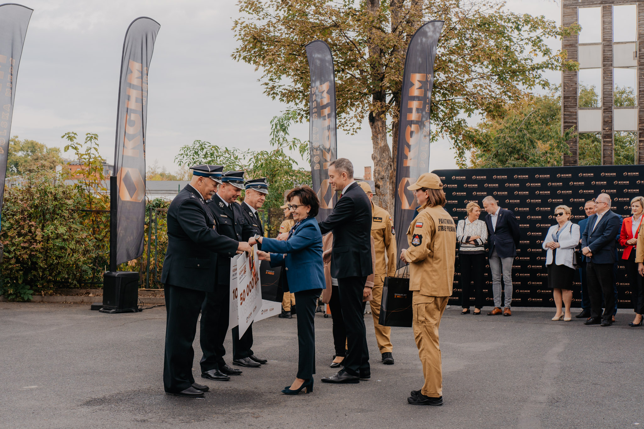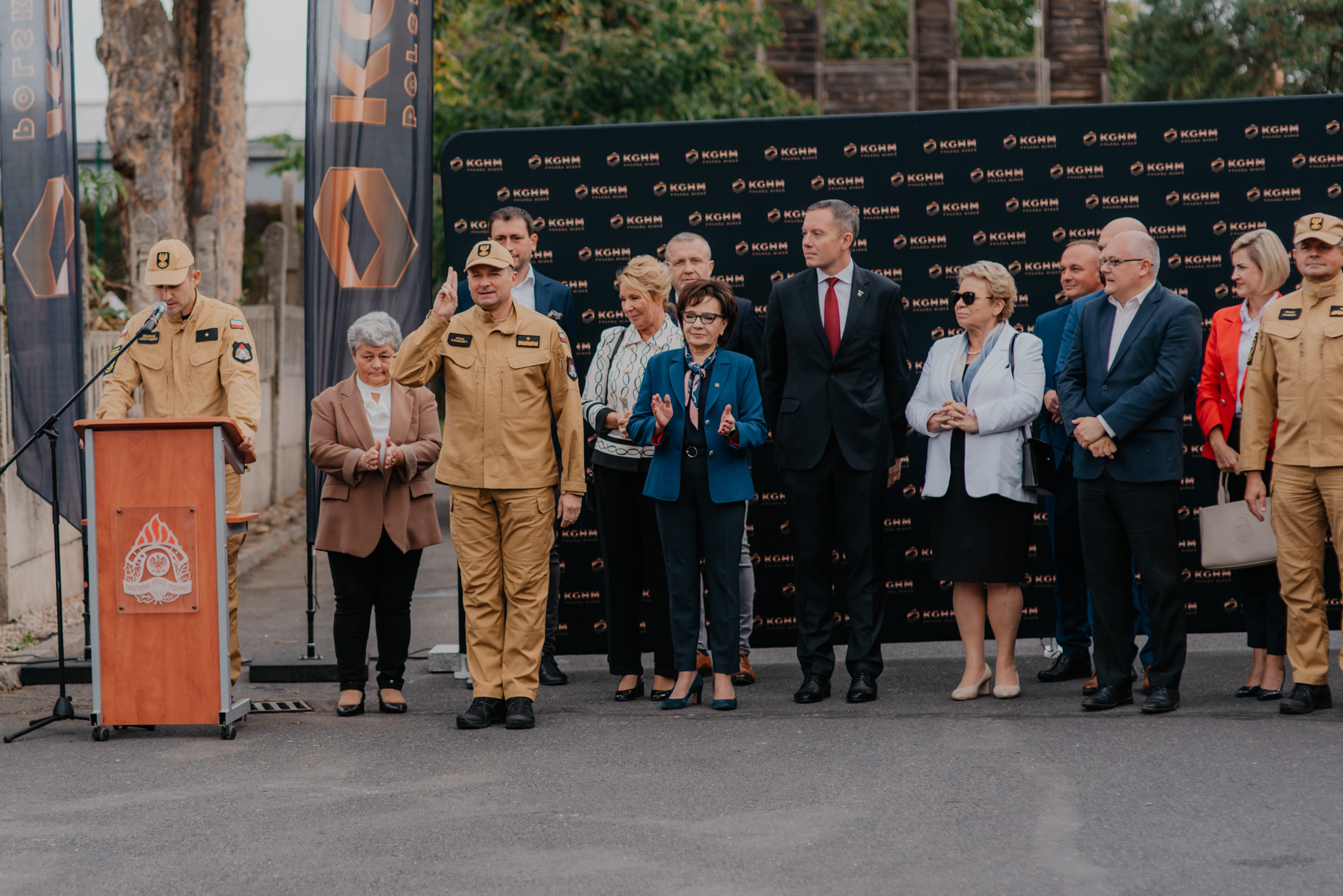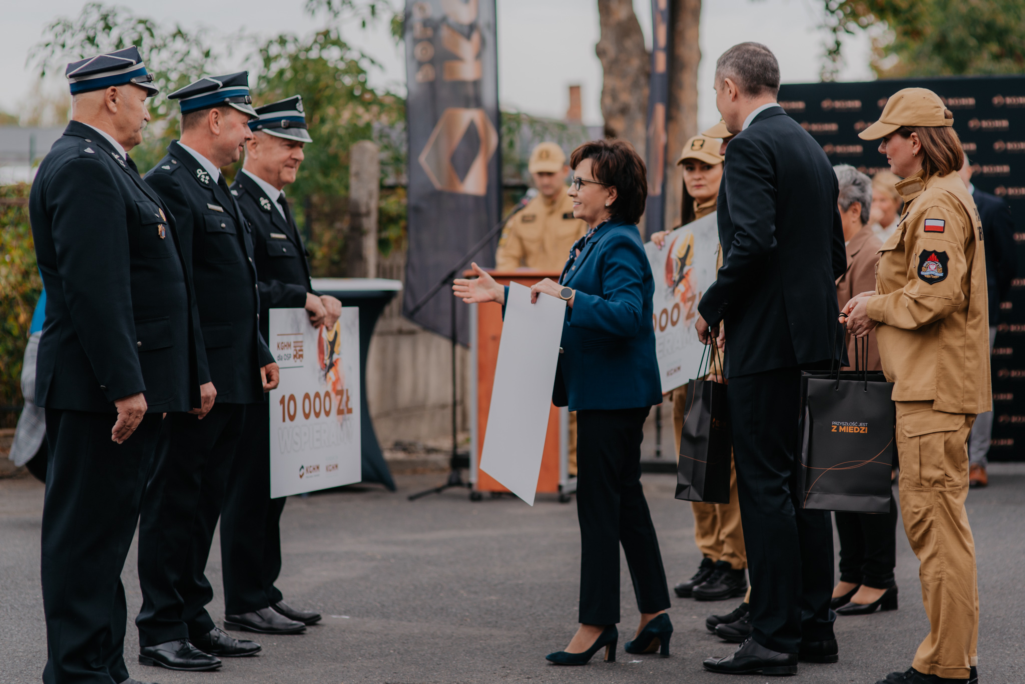 W uroczystości wręczenia symbolicznych czeków na zakup sprzętu wzięli udział: Marszałek Sejmu Rzeczypospolitej Polska Pani Elżbieta Witek, Poseł na Sejm Pani Ewa Szymańska, Senator RP Pan Krzysztof Mróz, Prezes KGHM Polska Miedź S. A. Pan Tomasz Zdzikot, Przewodnicząca Rady Nadzorczej KGHM Polska Miedź S. A. Pani Agnieszka Winnik – Kalemba, Prezes Fundacji KGHM Polska Miedź S. A. Pani Helena Krupska, Zastępca Komendanta Głównego Państwowej Straży Pożarnej nadbryg. Adam Konieczny, Dolnośląski Komendant Wojewódzki Państwowej Straży Pożarnej st. bryg. Marek Kamiński, Starosta Powiatu Jaworskiego Pani Aneta Kucharzyk, Dyrektor Biura Poselskiego Elżbiety Witek Pani Aneta Trela oraz Komendant Powiatowy Państwowej Straży Pożarnej w Jaworze kpt. Mirosław Walaszczyk wraz ze swoim Zastępcą mł. kpt. Łukaszem Fuławka.