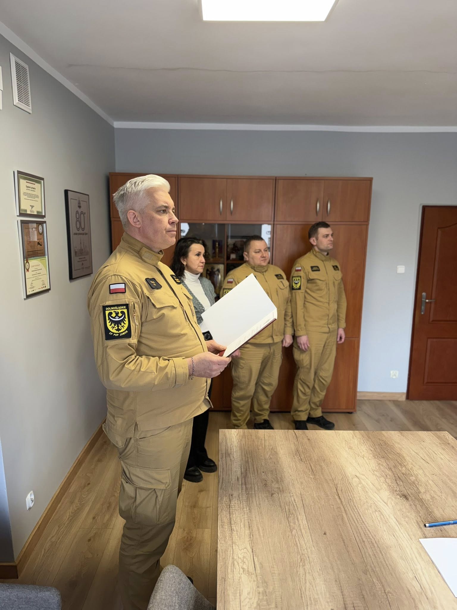 W uroczystej zbiórce udział brali również mł. bryg. Daniel Malinowski - Z-ca Komendanta Powiatowego PSP, mł. bryg. Łukasz Starowicz - Naczelnik Wydziału Operacyjno-Kontrolno-Rozpoznawczego, st. kpt. Andrzej Mitek - Dowódca Jednostki Ratowniczo-Gaśniczej w Jaworze oraz pracownik cywilny Wydziału Kadr.