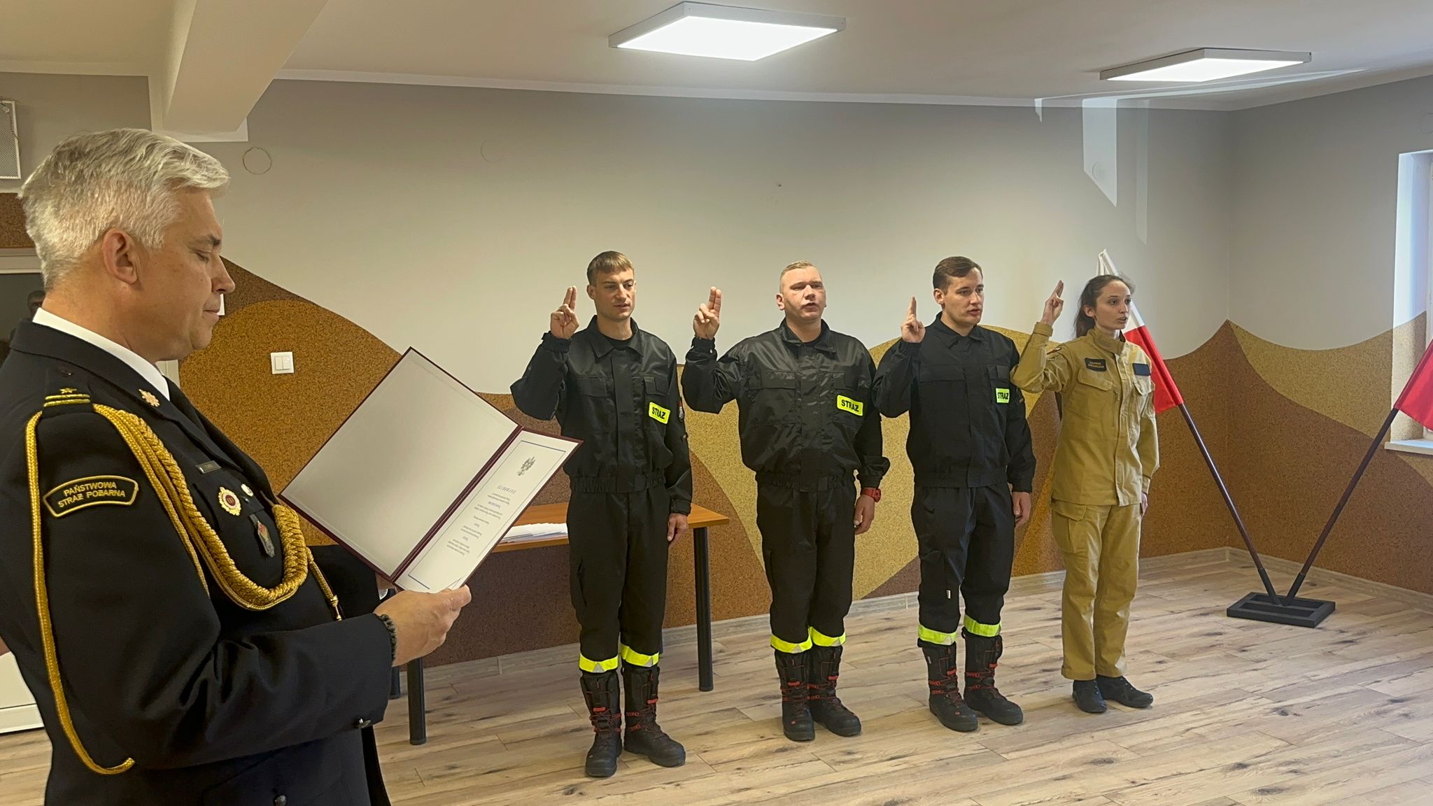 W dalszej części akademii, w obecności Komendanta, dowódcy Jednostki Ratowniczo-Gaśniczej oraz funkcjonariuszy jaworskiej Komendy, czterech nowo przyjętych strażaków: