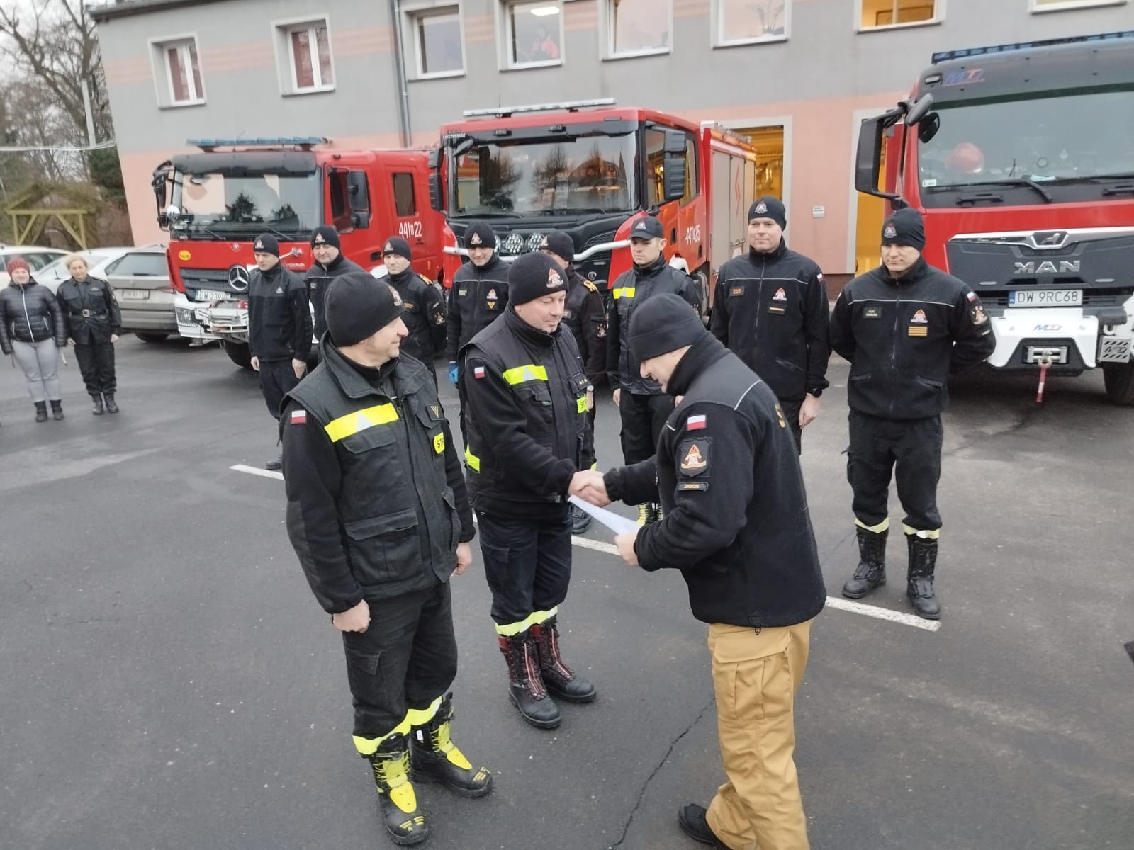Zmiana służby miała dla Mariusz i Waldka wyjątkowy charakter, ponieważ strażakom towarzyszyli w niej koleżanki i koledzy z jaworskiej komendy na czele z Komendantem Powiatowym PSP w Jaworze bryg. Waldemarem Sarlejem.