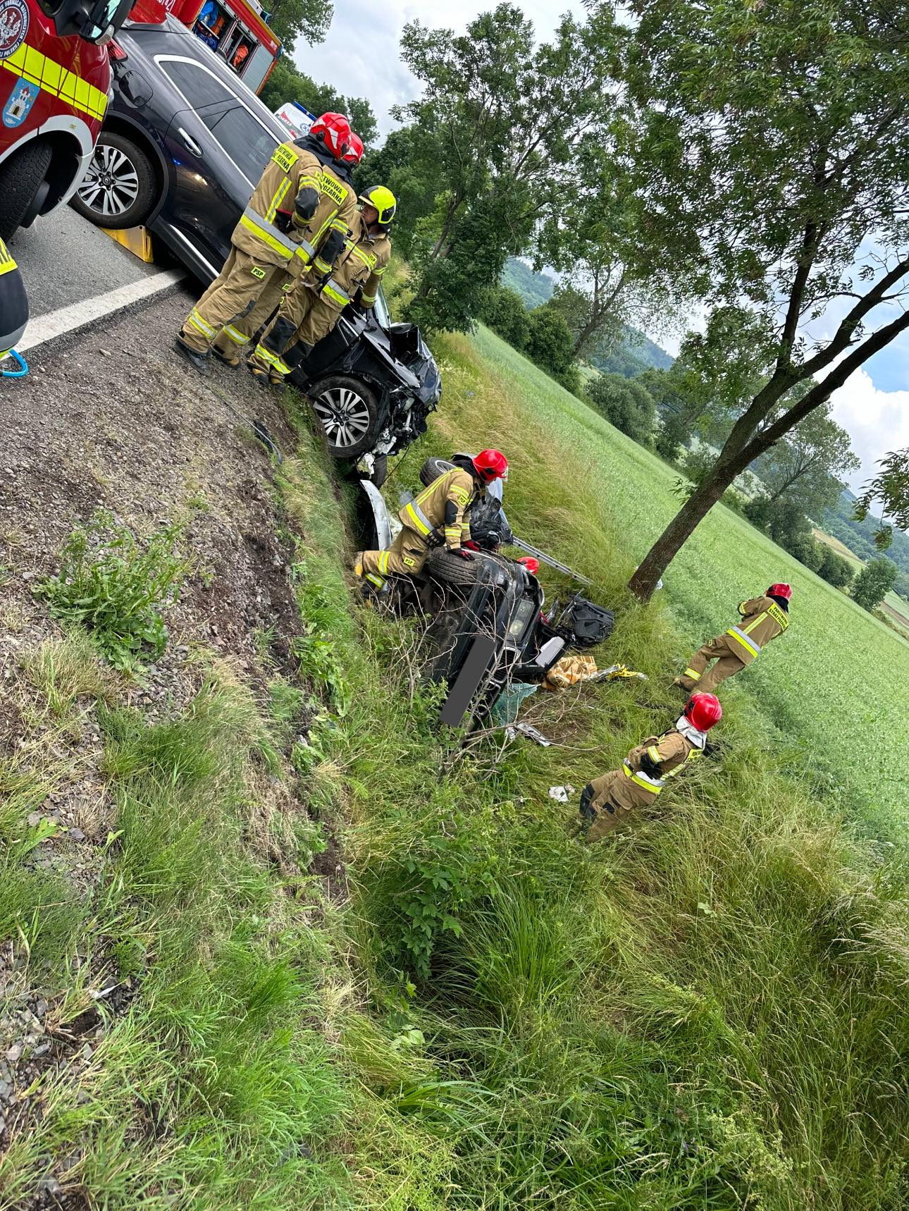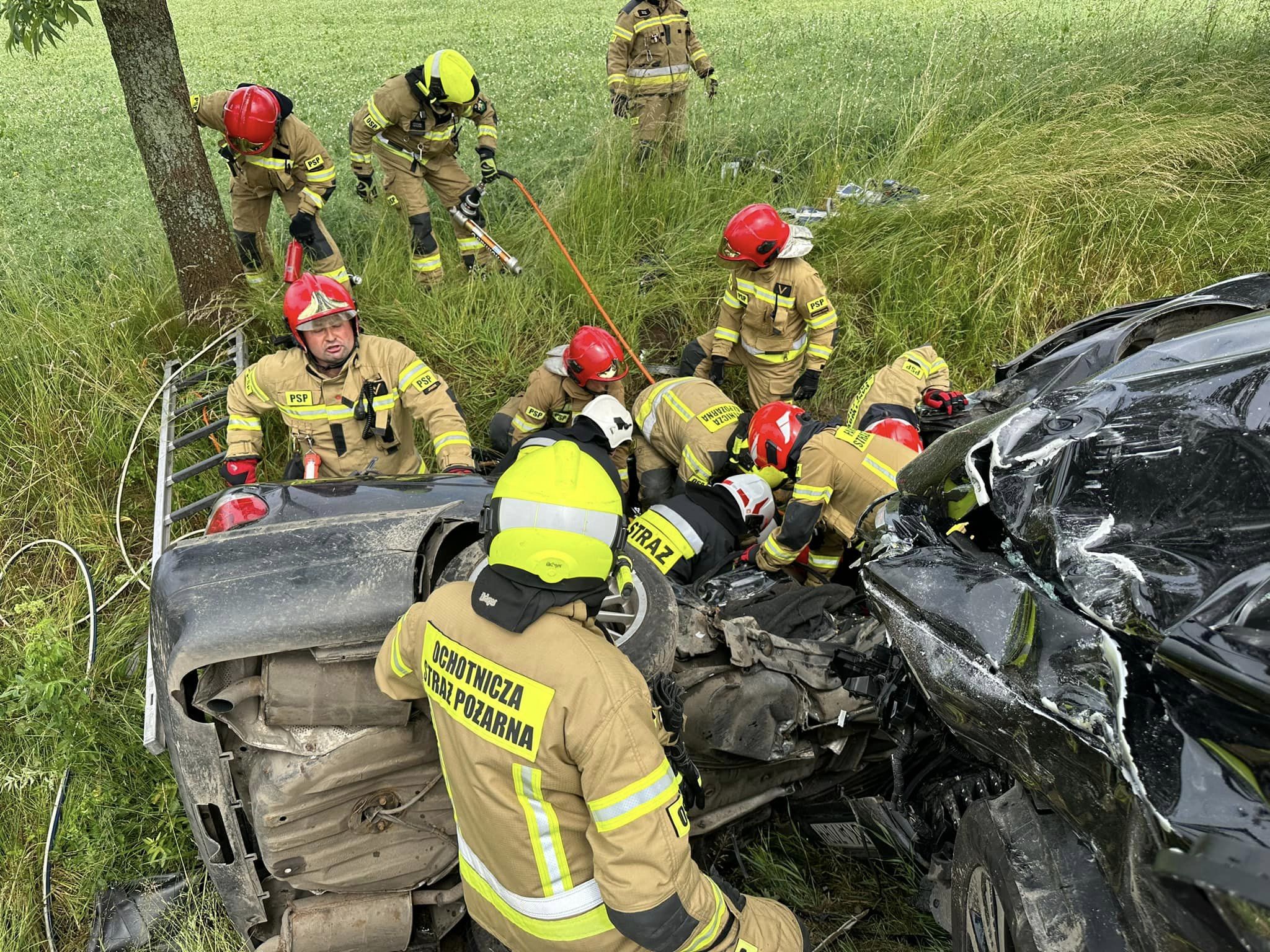 Siła uderzenia była tak duża, że jeden z pojazdów wpadł do przydrożnego rowu. W pojeździe znajdowała się jedna osoba poszkodowana do której strażacy musieli wykonać dostęp przy użyciu sprzętu hydraulicznego. Następnie kierujący został przekazany pod opiekę ratowników medycznych. Z uwagi na stan poszkodowanego na miejsce został zadysponowany śmigłowiec LPR Ratownik 13. Pomimo dużych starań lekarzom, ratownikom i strażakom nie udał się uratować życia mężczyźnie. Trzy kolejne poszkodowane osoby zostały przetransportowane do lokalnych szpitali.