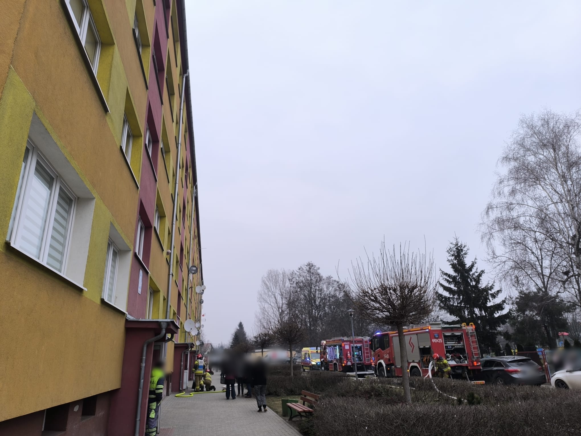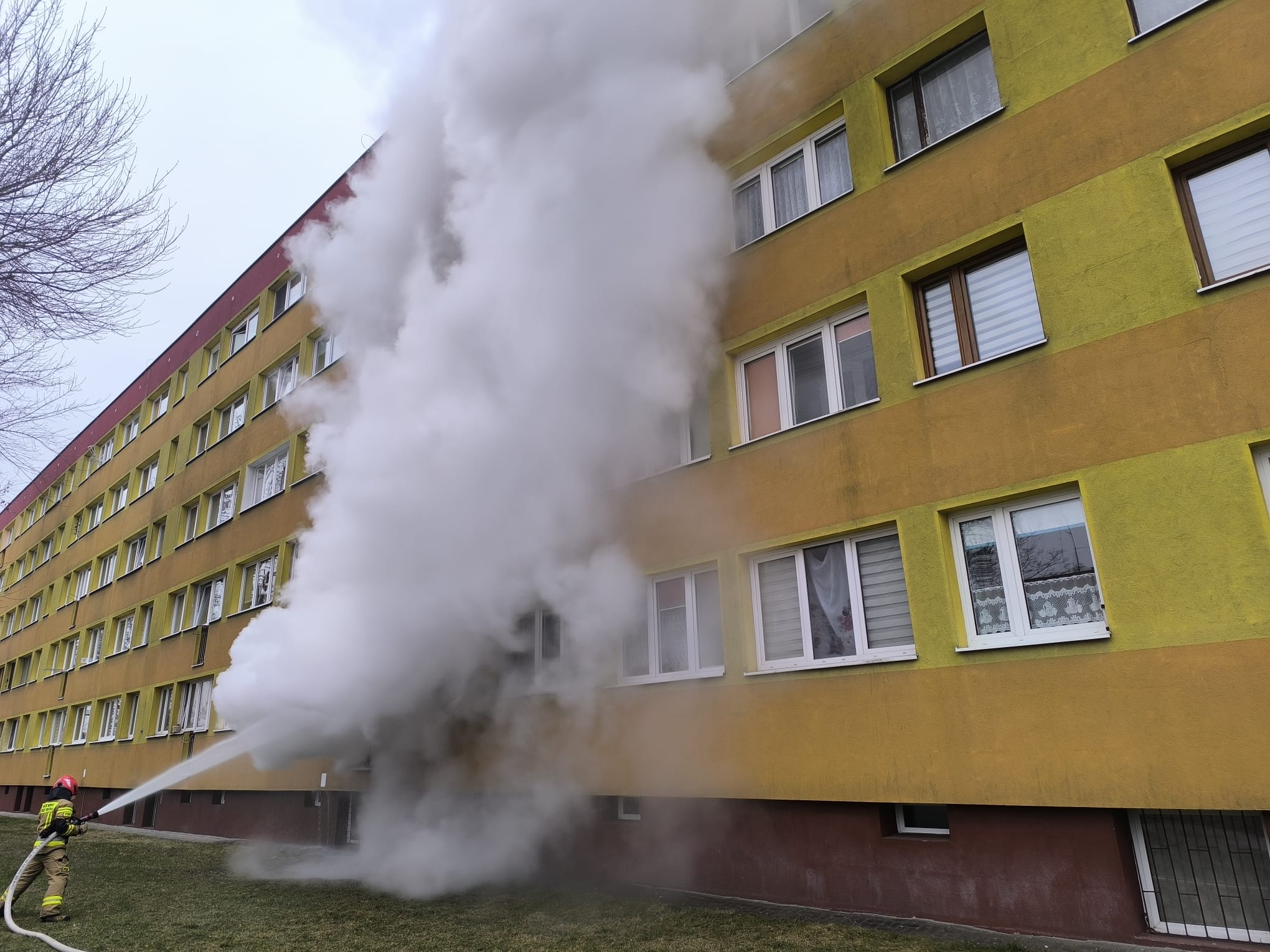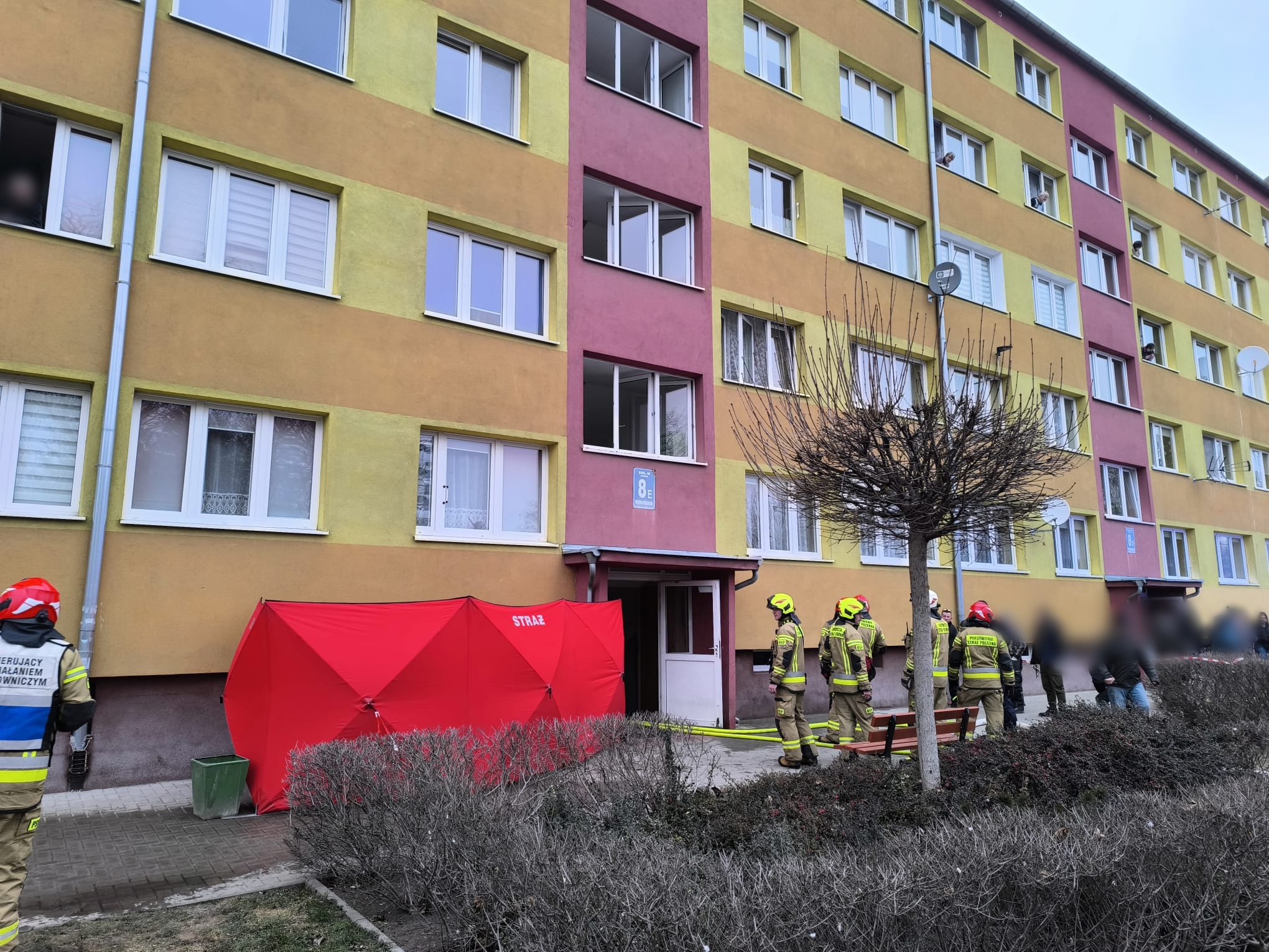 Po dojeździe na miejsce pierwszych zastępów straży pożarnej potwierdzono w pełni rozwinięty pożar w jednym z lokali, z którego płomienie wydostawały się na zewnątrz mieszkania.