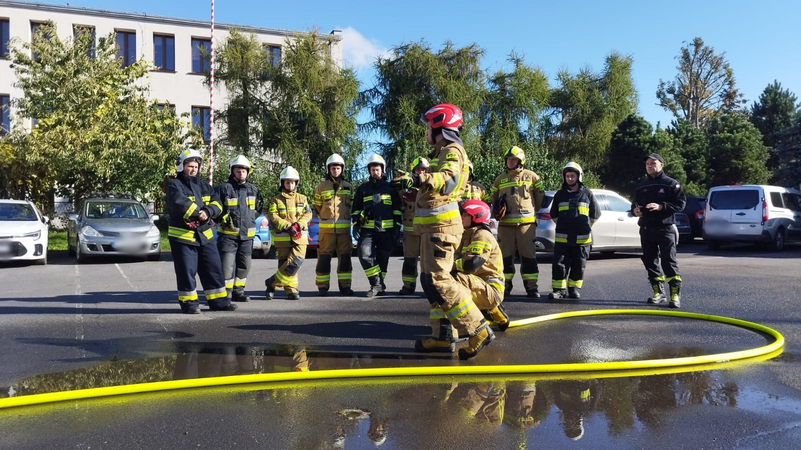 Na pierwszym stanowisku szkoleniowym instruktorzy pokazali poprawne operowanie prądami gaśniczymi, a także pokazali odpowiednie techniki poruszania się z nawodniona linią wężową. Następnie wszyscy uczestnicy rozpoczęli ćwiczenia na przygotowanym stanowisku, gdzie mogli skupić się na poprawnym używaniu prądów gaśniczych.