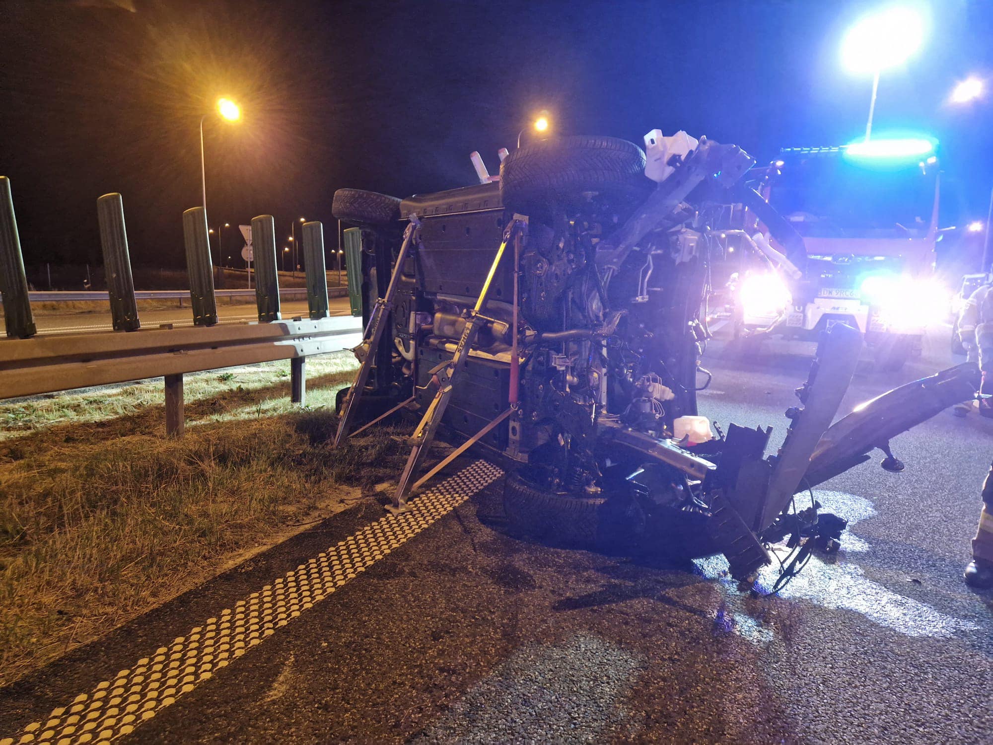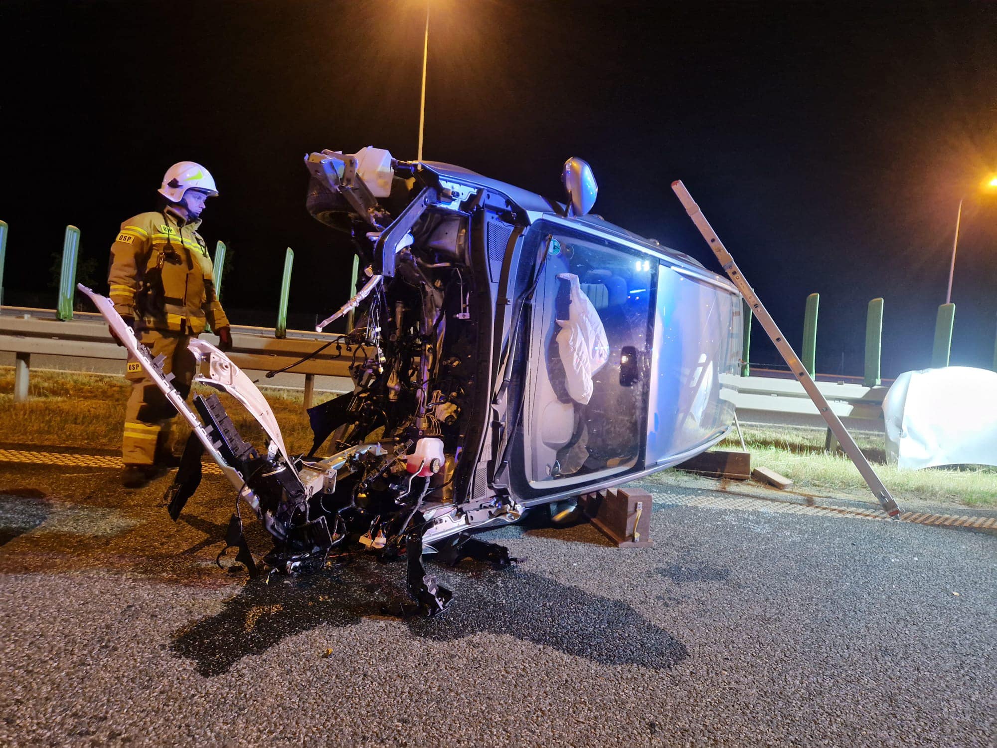 Pojazd osobowy uderzył w barierę ochronną rozdzielającą dwa pasy jezdni na zjeździe Jawor Wschód. Siła uderzenia była tak duża, że z pojazdu osobowego został wyrwany silnik. Sam pojazd leżał na boku. Strażacy przy pomocy podpór ratowniczych ustabilizowali auto. Następnie wykonano dostęp do wnętrza pojazdu do którego wszedł strażak uwalniając poszkodowana osobę.