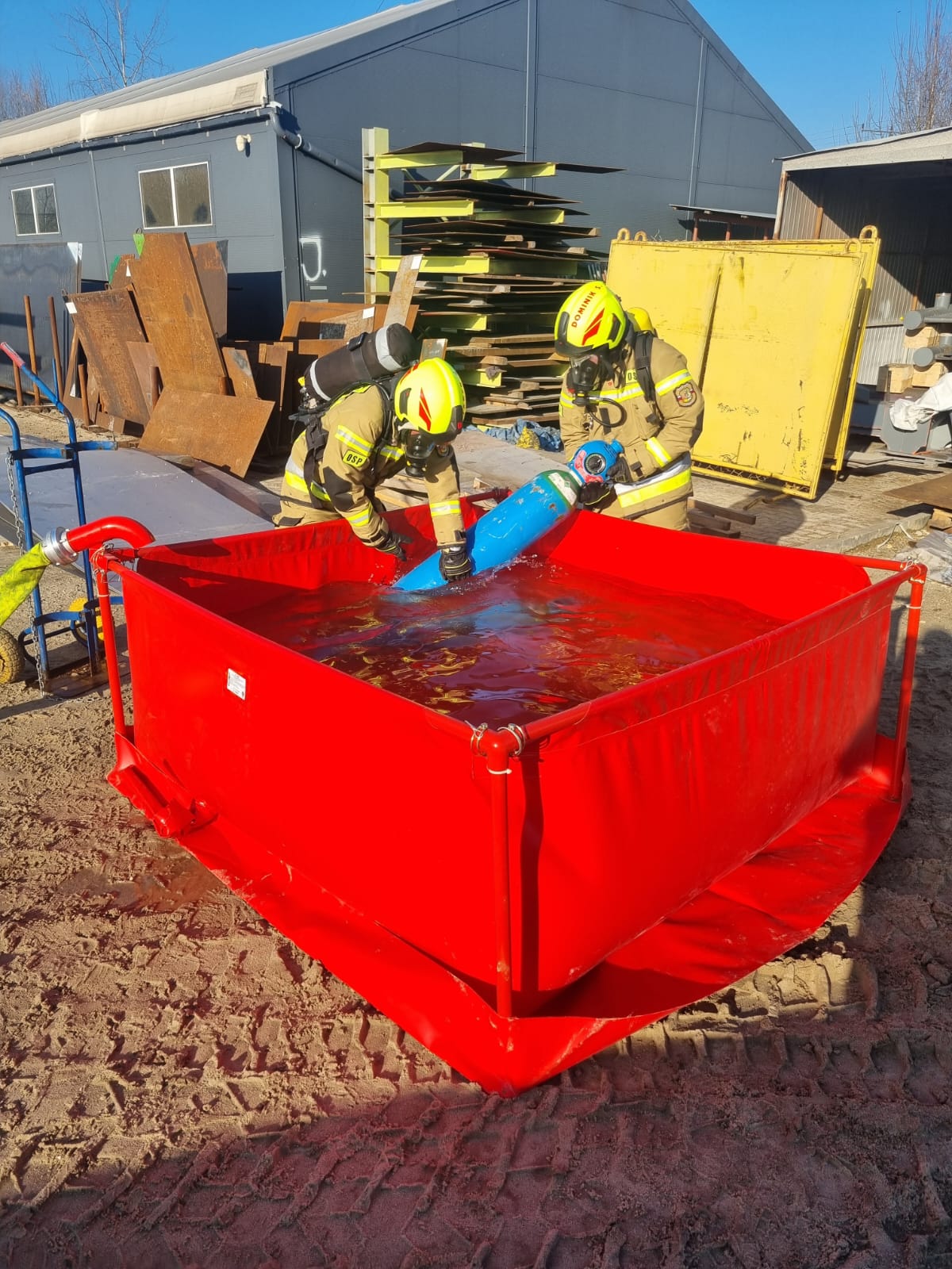 Kolejnym etapem ćwiczeń było przeprowadzenie działań związanych z zagrożeniem stwarzanym przez butle z acetylenem. Strażacy mieli za zadanie zastosować odpowiednie procedury zabezpieczające, schładzanie butli oraz monitorowanie strefy zagrożenia, co pozwoliło na sprawdzenie i doskonalenie umiejętności postępowania w tego typu sytuacjach.