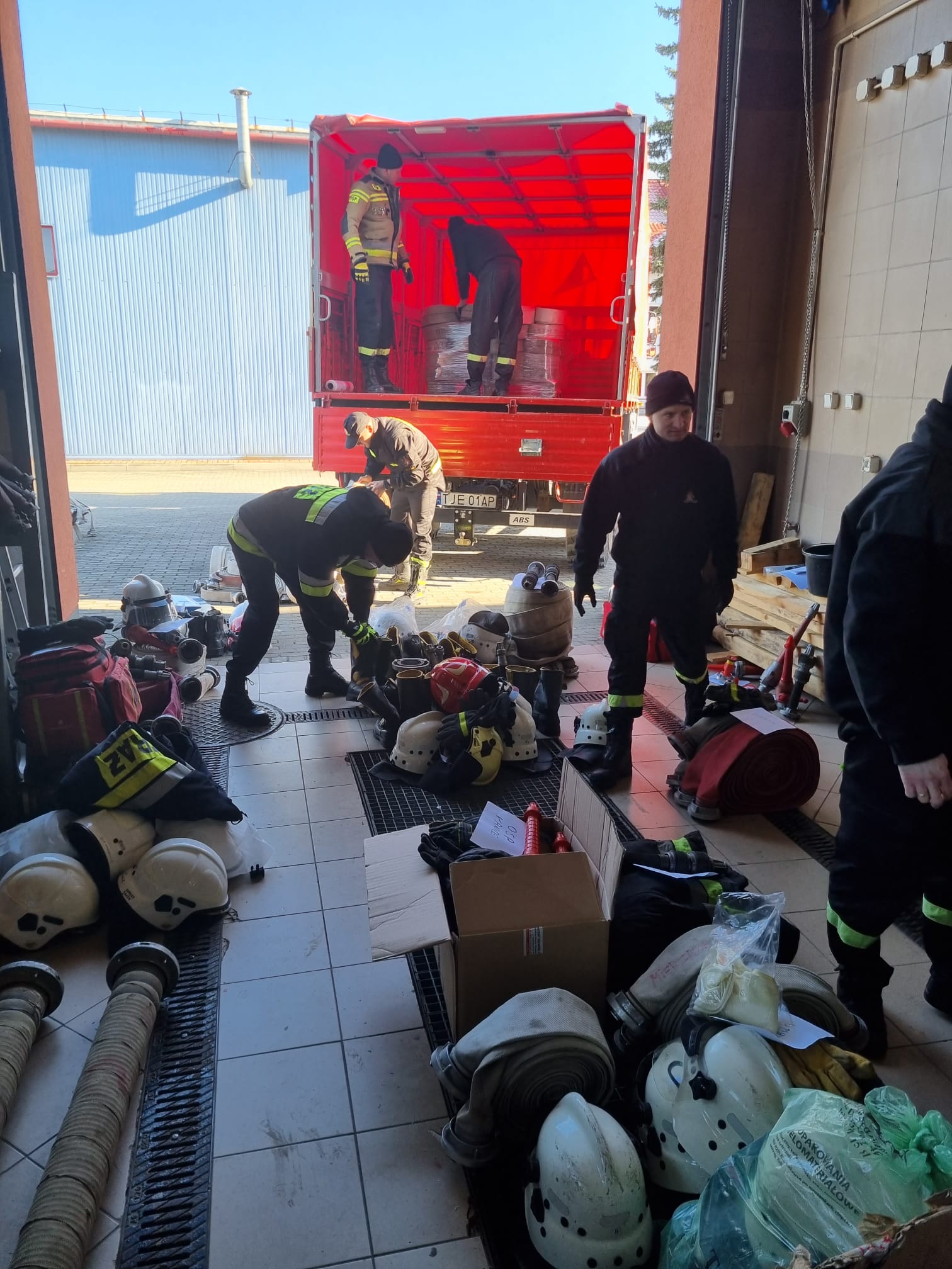 Strażacy z jednostek ochotniczych straży pożarnych z terenu całego powiatu jędrzejowskiego przekazali ogromne ilości węży pożarniczych, prądownic, ubrań specjalnych, hełmów, rękawic oraz kominiarek, które zostały niezwłocznie przetransportowane do Komendy Wojewódzkiej PSP w Kielcach.
