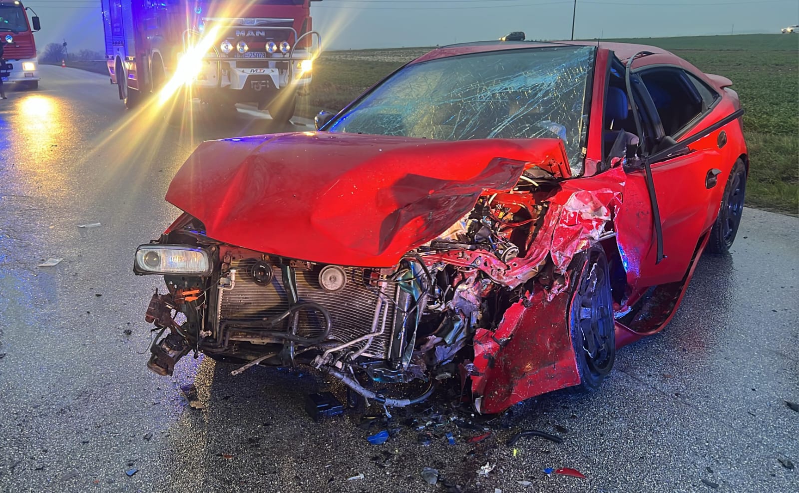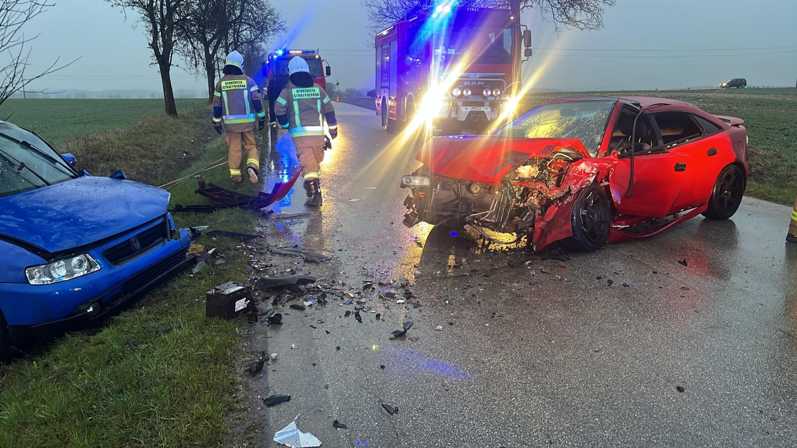Dalsze działania straży polegały na dokonaniu sorpcji płynów eksploatacyjnych, które wyciekły z pojazdów. Na czas prowadzonych działań droga powiatowa była całkowicie zablokowana.