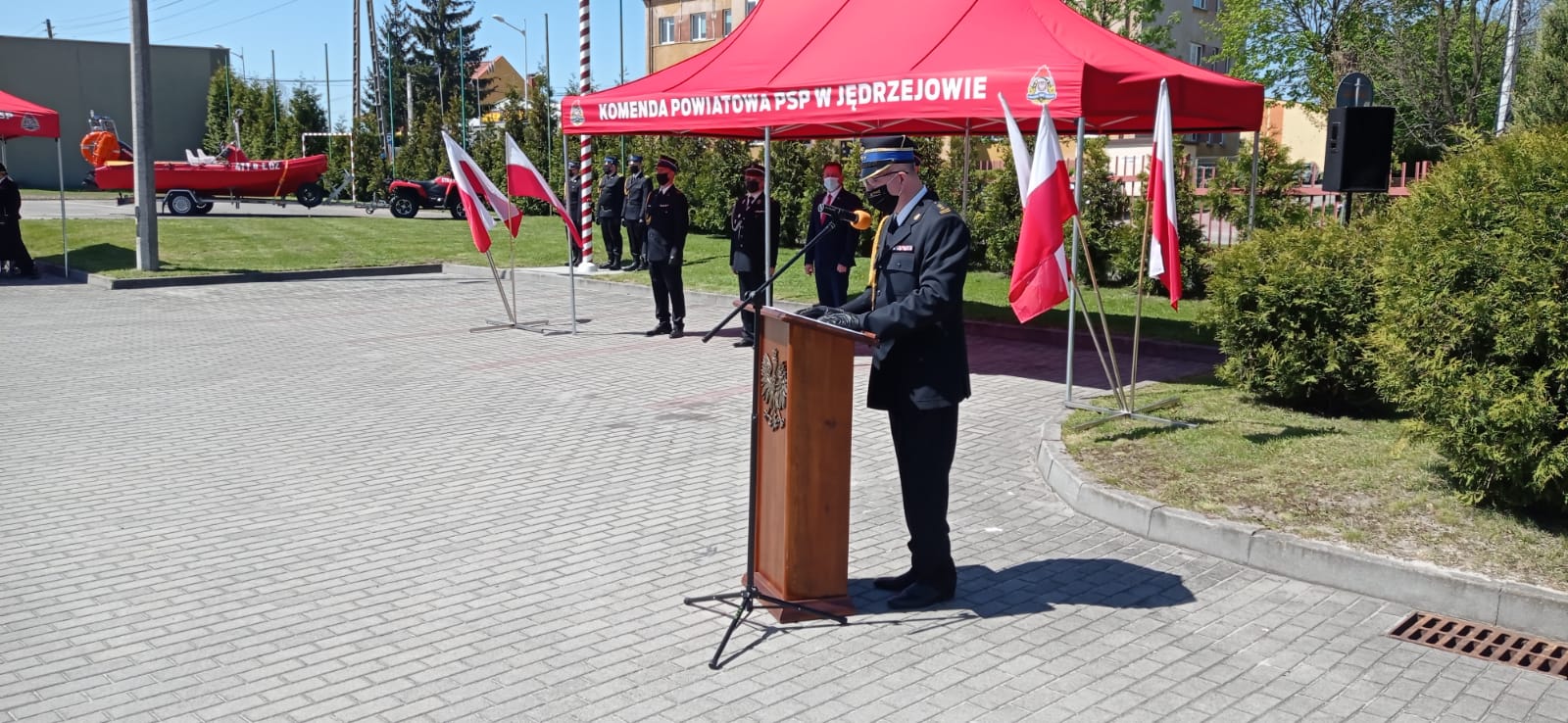 11 maja 2021r. w Komendzie Powiatowej Państwowej Straży Pożarnej w Jędrzejowie odbyły się Powiatowe Obchody Dnia Strażaka. Z powodu ograniczeń spowodowanych stanem pandemii uroczystości miały skromny wymiar i zostały przeprowadzone z zachowaniem zasad reżimu sanitarnego. W uroczystości uczestniczyli: Świętokrzyski Komendant Wojewódzki Państwowej Straży Pożarnej w Kielcach st. bryg. Krzysztof Ciosek, Starosta Powiatu Jędrzejowskiego Paweł Faryna oraz Prezes Zarządu Oddziału Wojewódzkiego Związku Ochotniczych Straży Pożarnych RP w Jędrzejowie dh Janusz Grabek. Komendant Powiatowy Państwowej Straży Pożarnej w Jędrzejowie – st. bryg. Paweł Jakubowski dokonał otwarcia uroczystego apelu oraz powitał przybyłych gości.