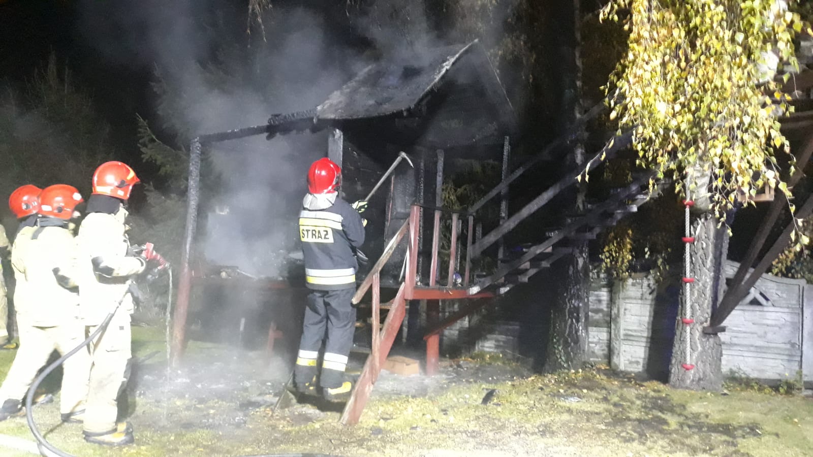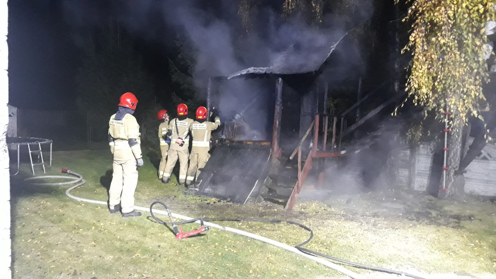 Po przybyciu na miejsce zastępów straży stwierdzono pożar drewnianego domku dla dzieci na prywatnej posesji. Działania straży polegały na zabezpieczeniu i oświetleniu miejsca zdarzenia oraz podaniu 2 prądów wody w natarciu na palący się domek. Po zlokalizowaniu pożaru przystąpiono do rozbiórki drewnianych elementów oraz dogaszania zgliszcz. Nadpalone fragmenty konstrukcji przeniesiono w bezpieczne miejsce i przelano wodą. Po dogaszeniu całe pogorzelisko sprawdzono kamerą termowizyjną nie stwierdzając dodatkowego zagrożenia.