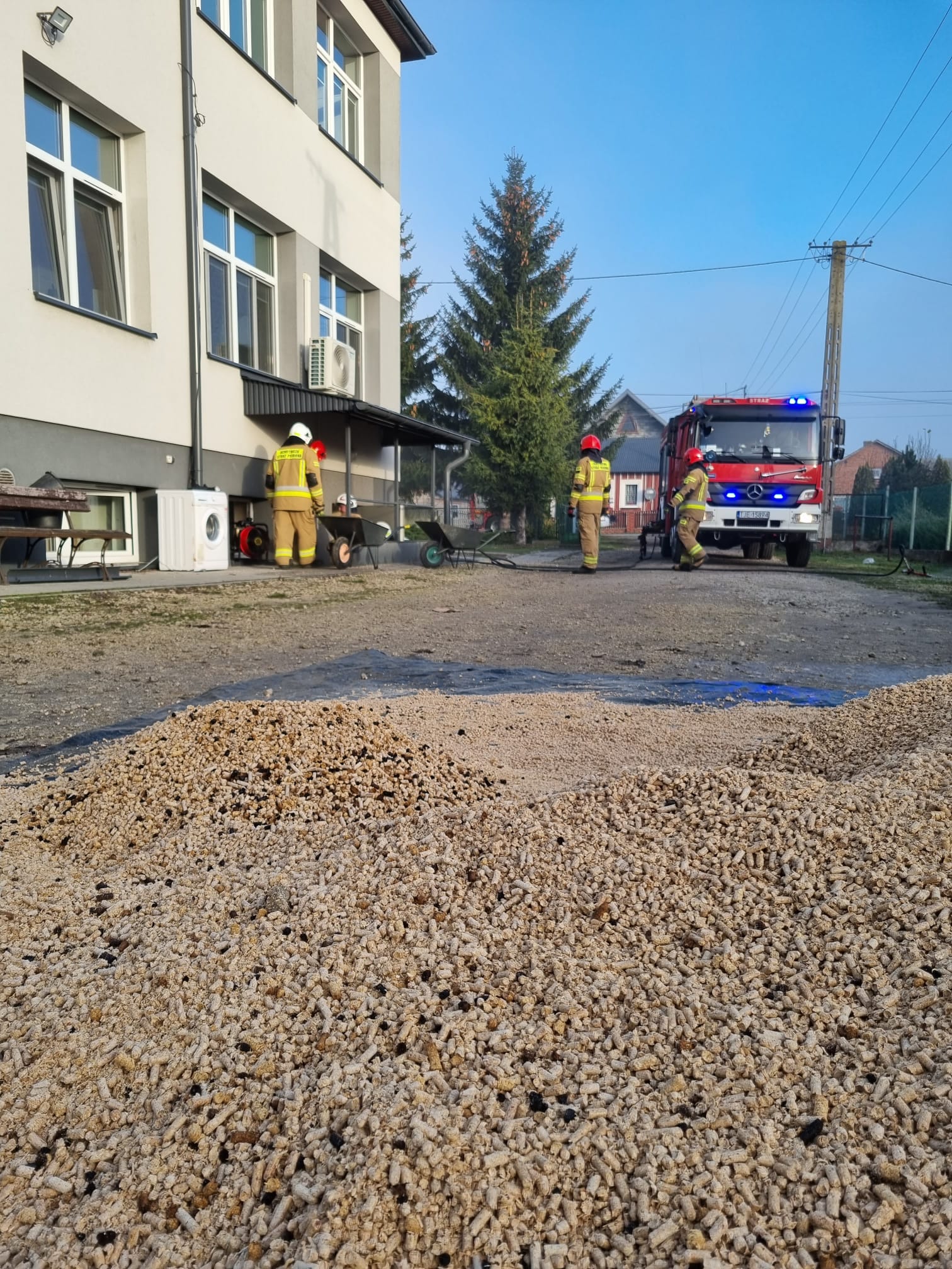 Działania strażaków polegały na zabezpieczeniu miejsca zdarzenia oraz podaniu jednego prądu wody w natarciu na palący się opał. W następnej fazie działań strażacy przystąpili do wynoszenia tlącego się materiału opałowego na zewnątrz budynku, gdzie sukcesywnie przelewali go wodą. Po dogaszeniu całe pogorzelisko sprawdzono kamerą termowizyjną nie stwierdzając dodatkowego zagrożenia.