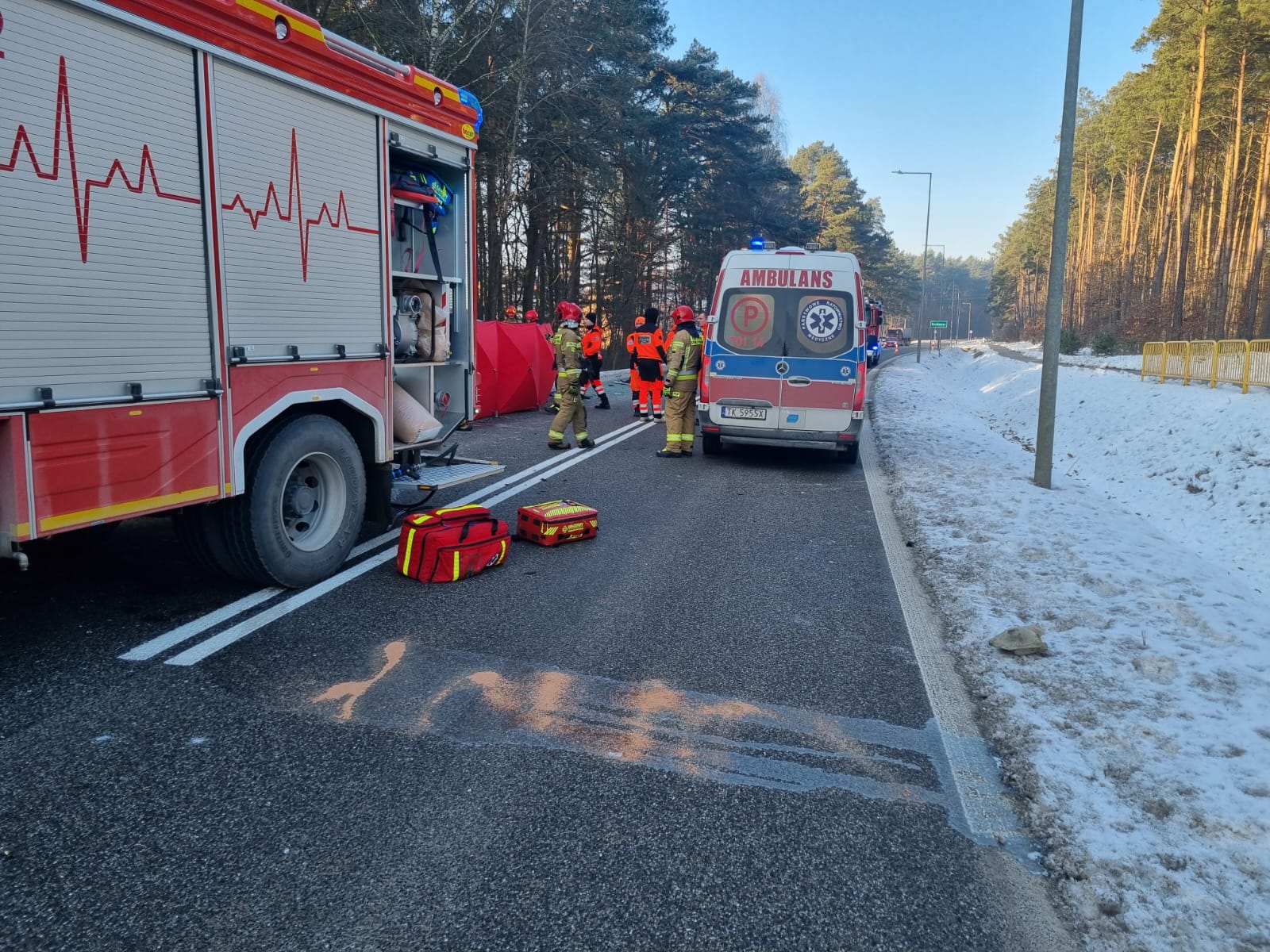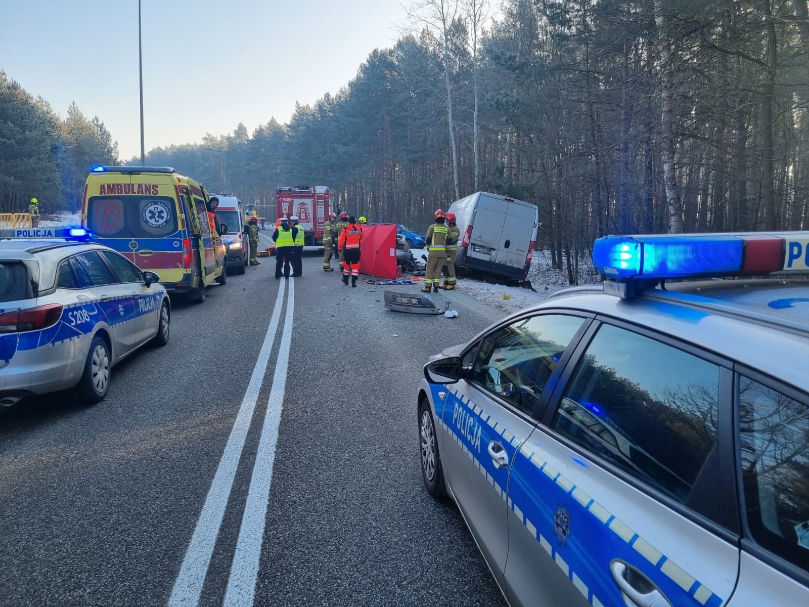 Po dojeździe na miejsce zdarzenia pierwszych zastępów straży pożarnej stwierdzono uszkodzone dwa pojazdy (samochód osobowy oraz dostawczy). Działania jednostek ochrony przeciwpożarowej polegały na zabezpieczeniu miejsca zdarzenia oraz udzieleniu kwalifikowanej pierwszej pomocy kierującemu samochodem dostawczym. Niestety, w wyniku zdarzenia kierujący pojazdem osobowym poniósł śmierć na miejscu. Dalsze działania straży polegały na rozłożeniu parawanu ochronnego, osłaniając drastyczne widoki przed osobami postronnymi oraz dokonaniu sorpcji płynów eksploatacyjnych, które wyciekły z uszkodzonych pojazdów.