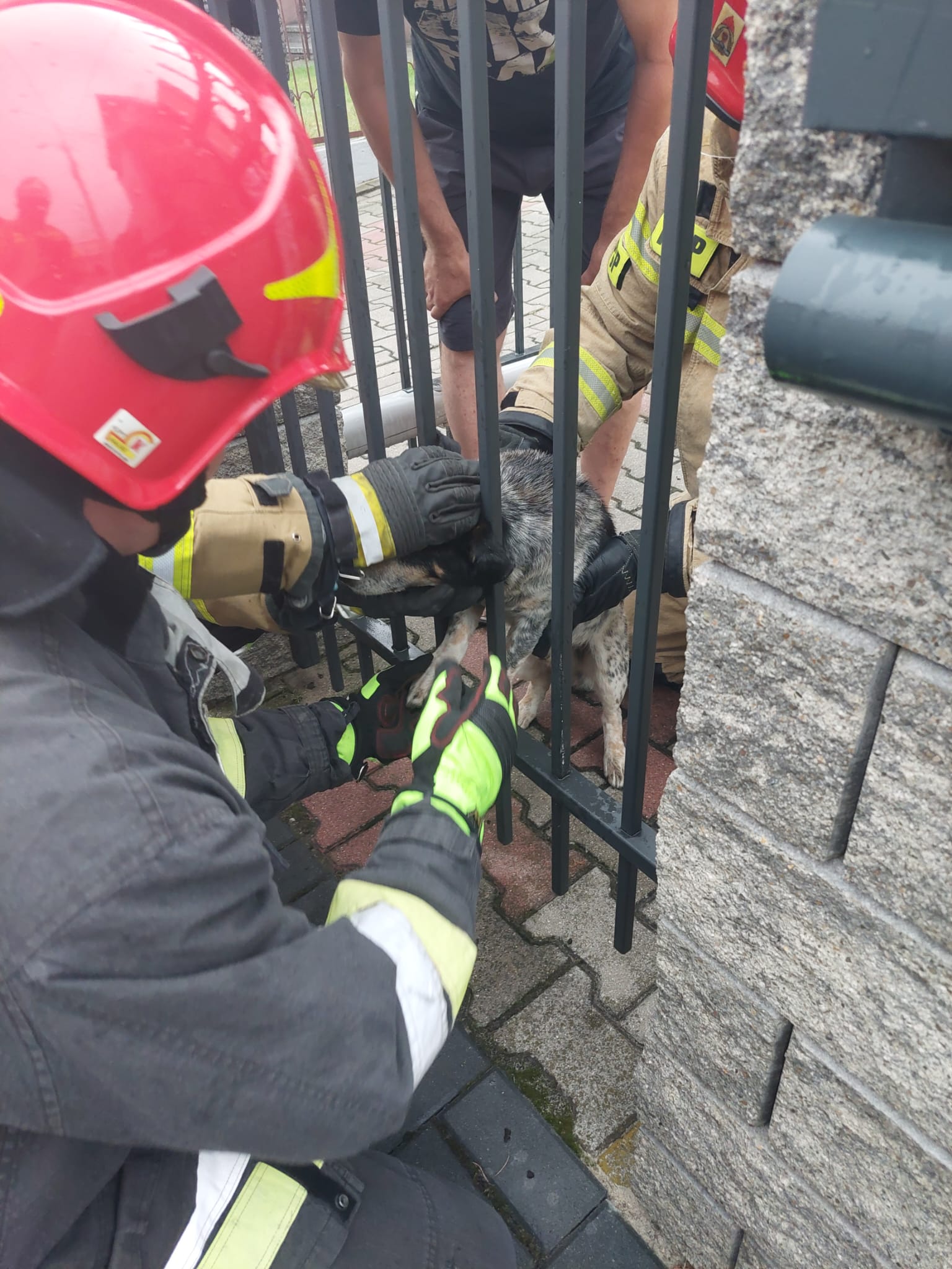 28 sierpnia 2022r. po godzinie 17:00 do Stanowiska Kierowania Komendanta Powiatowego Państwowej Straży Pożarnej w Jędrzejowie wpłynęło zgłoszenie o uwięzionym zwierzęciu w ogrodzeniu w miejscowości Jędrzejów. Po dojeździe zastępu straży z jednostki ratowniczo-gaśniczej stwierdzono zaklinowanego psa między metalowymi słupkami ogrodzenia domowego. Zwierzę zachowywało się w sposób naturalny, nie było ranne.