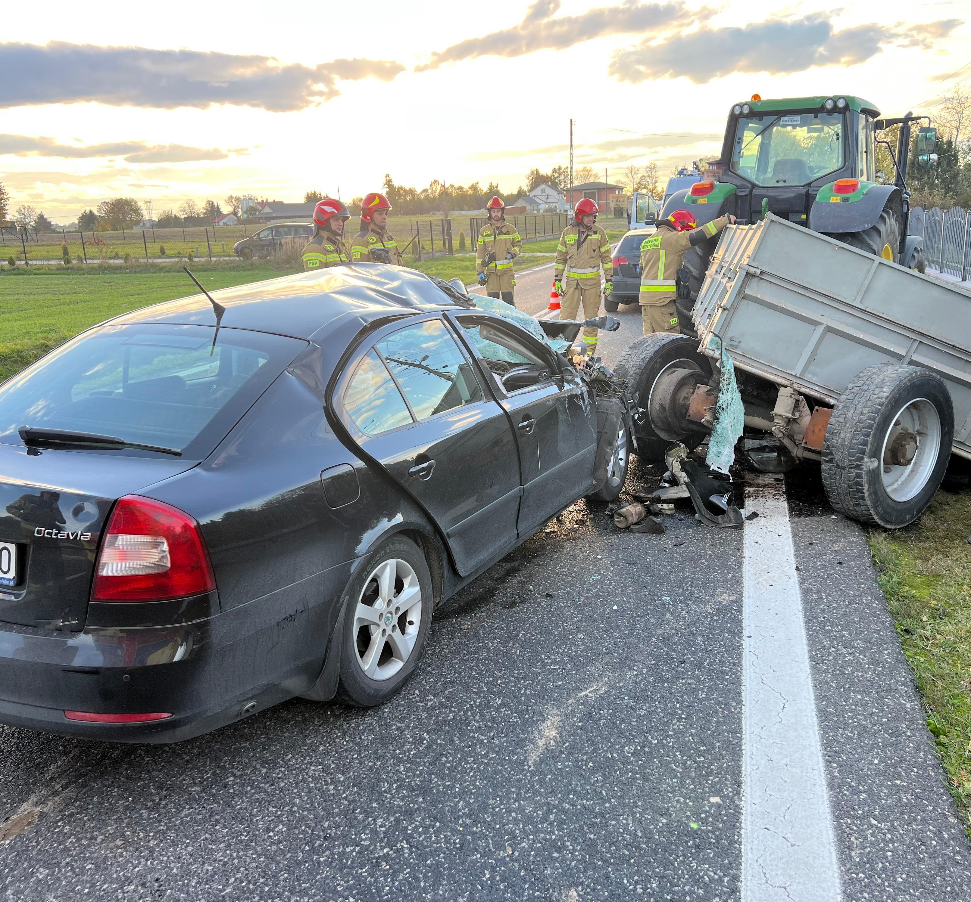 23 października 2025 r. po godzinie 16:00 do Stanowiska Kierowania Komendanta Powiatowego Państwowej Straży Pożarnej w Jędrzejowie wpłynęło zgłoszenie o zderzeniu samochodu osobowego z ciągnikiem rolniczym w miejscowości Jasionna, gmina Jędrzejów. Po dojeździe pierwszych zastępów straży stwierdzono dwa uszkodzone pojazdy, którymi podróżowali tylko kierowcy.