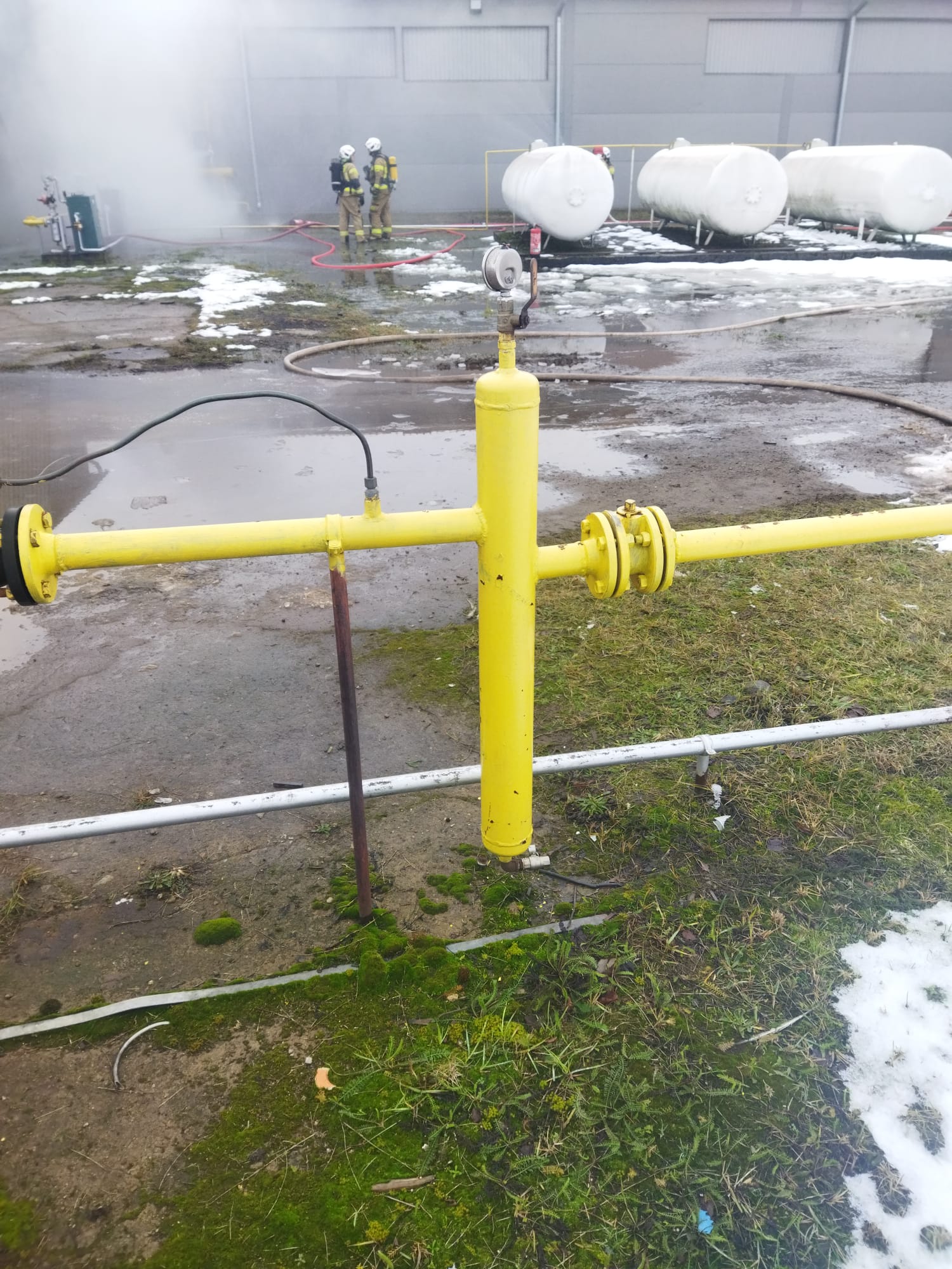 Po dotarciu na miejsce zdarzenia, Kierujący Działaniami Ratowniczymi potwierdził sytuację, poinformował dyżurnego ,że pracownicy zakładu ewakuowali się w bezpieczne miejsce, a linia produkcyjna została wyłączona ze względu na bezpieczeństwo i możliwość dojścia do zapłonu ulatniającego się gazu. Ratownicy ustalili, że jest to gaz LPG, który wydostaje się z trzech uszkodzonych reduktorów pod wysokim ciśnieniem stwarzając zagrożenie. Działania zastępów polegały na zabezpieczeniu miejsca zdarzenia, zbudowaniu 5 lini wodnych wraz z kurtynami wodnymi w celu zminimalizowania zagrożenia wybuchem. Zakręcono zawory główne na zbiornikach z płynnym gazem(12 zbiorników) oraz wygaszono tzw. świeczki w parownikach ,które przetwarzają gaz z fazy płynnej w lotny. Po zredukowaniu ciśnienia dotarto do uszkodzonych reduktorów ,tym samym odcinając dopływ gazu na linię technologiczną( piece technologiczne zasilane gazem LPG). Ma miejsce zdarzenia skierowana została grupa specjalistyczna chemiczna strażaków z PSP Szczecin, którzy po dotarciu na miejsce podjęli próbę obniżenia ciśnienia na uszkodzonej instalacji do bezpiecznego. Na potrzeby ciągłego zapewnienia wody do działań zbudowano punkt czerpania wody ze zbiornika p. poż., który znajdował się na terenie zakładu objętego działaniami.