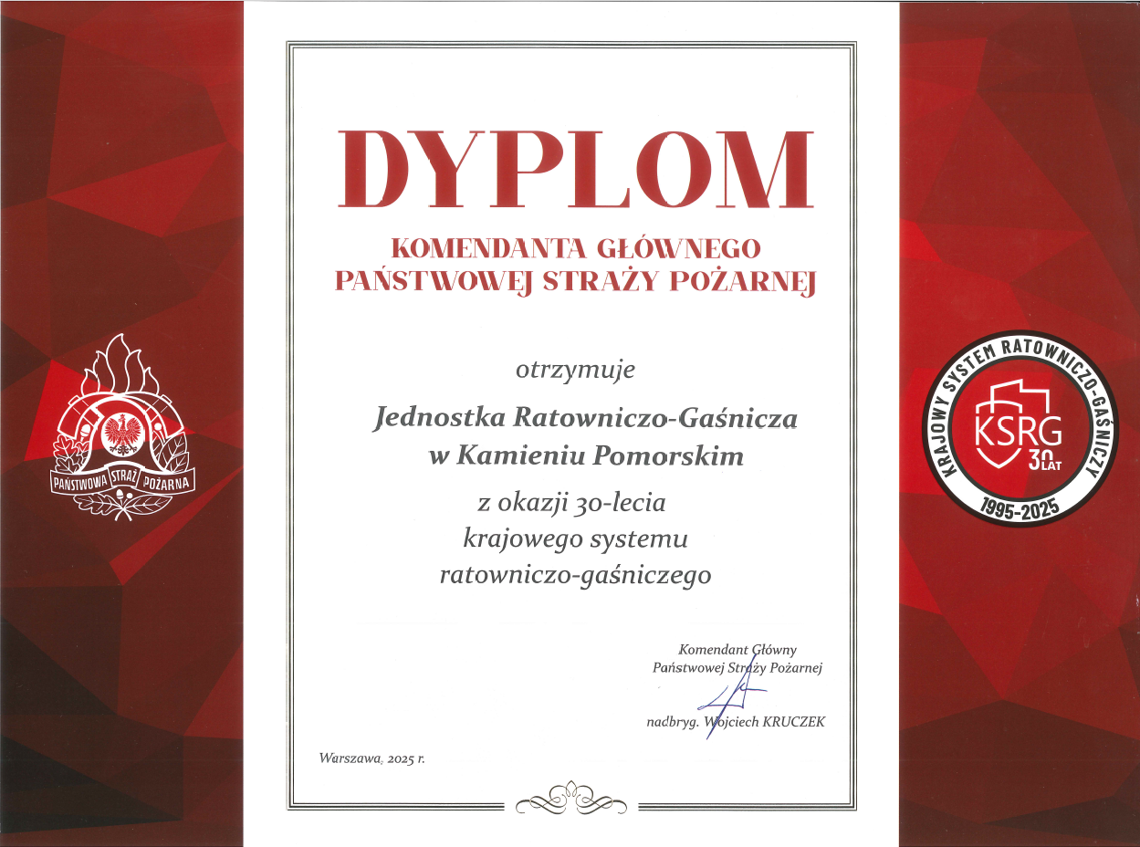Podczas uroczystości wręczono także dyplomy z okazji 30-lecia Krajowego Systemu Ratowniczo-Gaśniczego dla Komendy Powiatowej Państwowej Straży Pożarnej w Kamieniu Pomorskim, Jednostki Ratowniczo-Gaśniczej Państwowej Straży Pożarnej w Kamieniu Pomorskim oraz 13 jednostkom Ochotniczej Straży Pożarnej z terenu powiatu kamieńskiego, które obecnie są w jego strukturach.