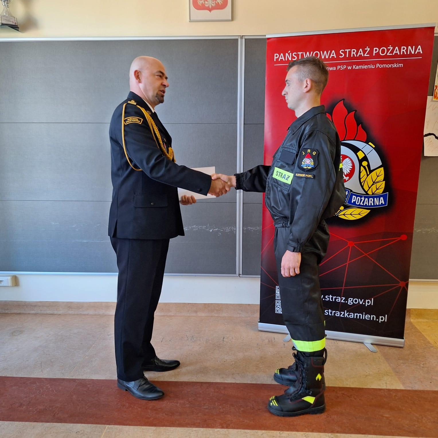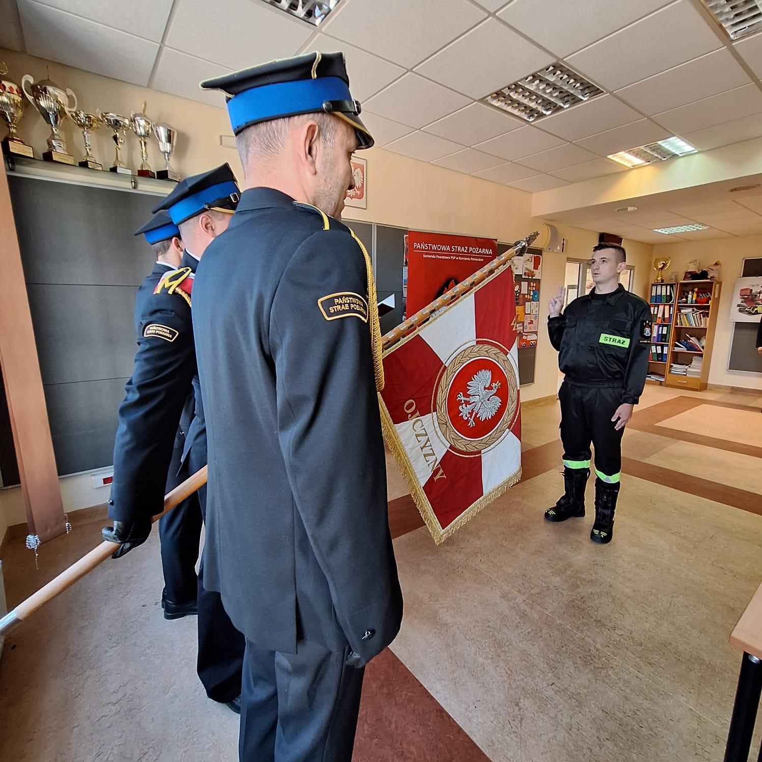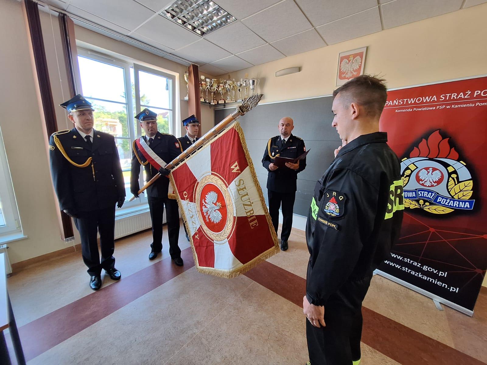 07.07.2024 roku tuż po godzinie 8:00 na świetlicy Komendy Powiatowej Państwowej Straży Pożarnej w Kamieniu Pomorskim odbyła się uroczysta zbiórka z okazji ślubowania nowo przyjętego funkcjonariusza do służby przygotowawczej w Państwowej Straży Pożarnej. Ślubowanie odbyło się na sztandar Komendy Powiatowej PSP w Kamieniu Pomorskim, które przyjął Komendant Powiatowy PSP st. bryg. Roman Pikulski.