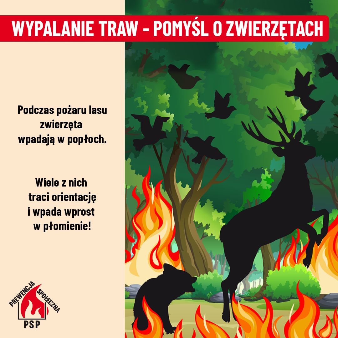 • Giną zwierzęta domowe, które przypadkowo znajdą się w zasięgu pożaru (tracą orientację w dymie, ulegają zaczadzeniu). Dotyczy to również dużych zwierząt leśnych, takich jak sarny, jelenie czy dziki.