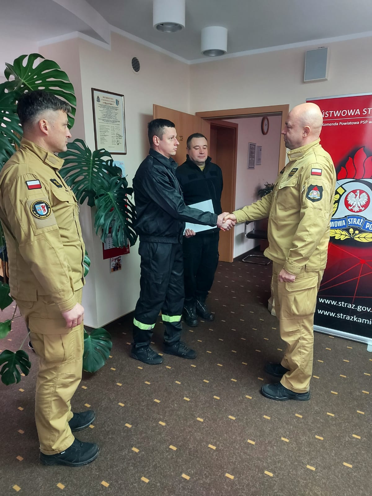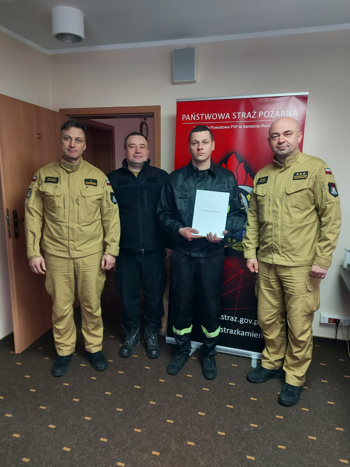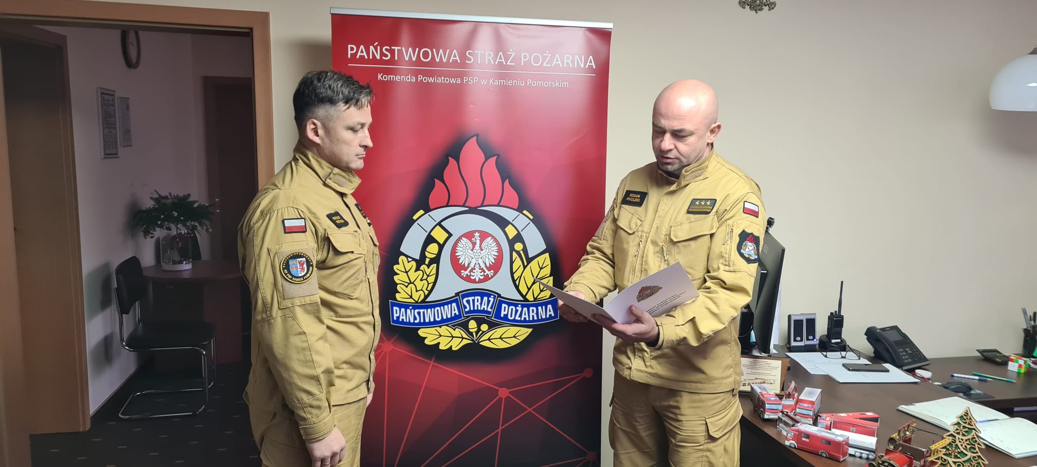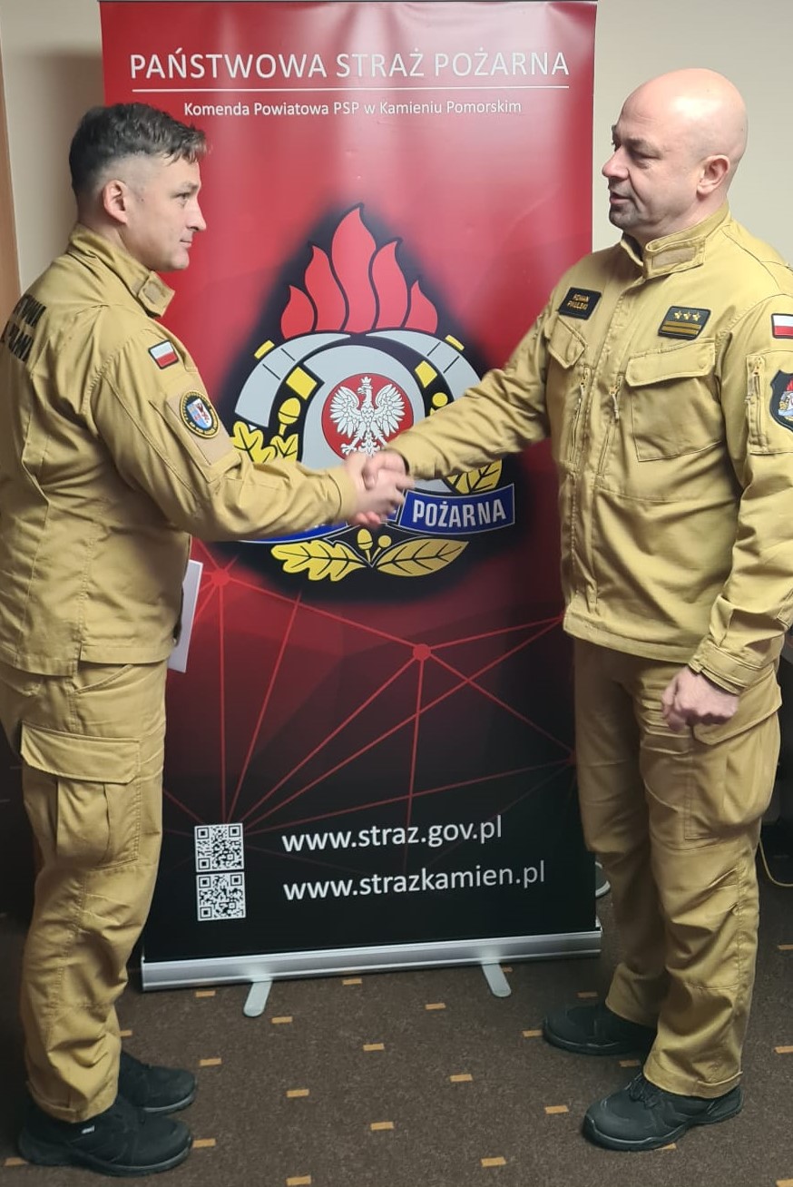 W dniu 10 stycznia 2024 roku Komendant Powiatowy Państwowej Straży Pożarnej w Kamieniu Pomorskim st.bryg. Roman Pikulski w obecności dowództwa JRG, wręczył akt nadania wyższego stopinia służbowego st.str. Mateuszowi Smerdel na stopień sekcyjnego oraz wręczył nagrodę jubileuszową za 30 lat pracy i służby mł. bryg. Krzysztofowi Przydrydze. Awansowanemu i nagrodzonemu funkcjonariuszowi serdecznie gratulujemy i życzymy dalszych sukcesów, spełnienia marzeń oraz kolejnych lat w szeregach PSP. opracowanie: st.kpt. Michał Wiaderski zdjęcia: mł.kpt. Marek Kruczek