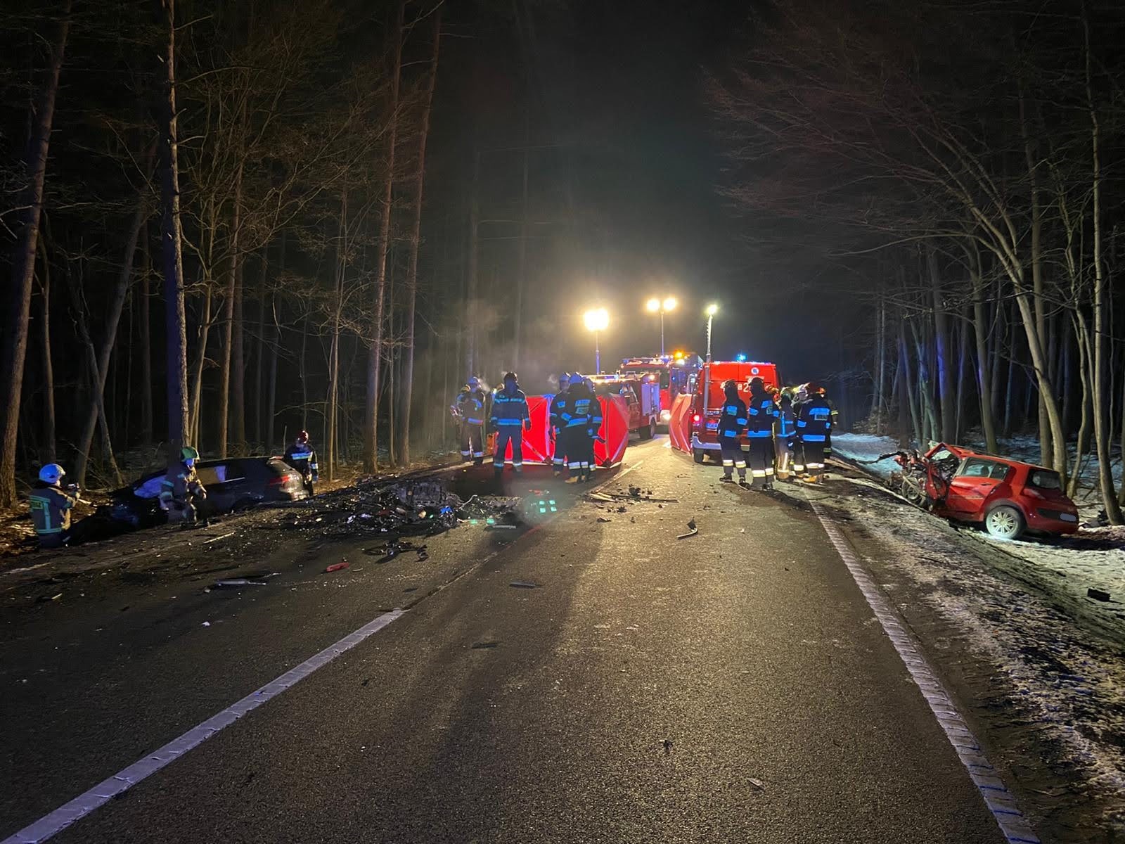 Działania straży polegały na zabezpieczeniu miejsca zdarzenia, wykonaniu dostępu do uwięzionych mężczyzn w pojazdach. Po wydobyciu poszkodowanych niezwłocznie przystąpiono do resuscytacji krążeniowo-oddechowej. Niestety pomimo podjętych działań nie udało się przywrócić czynności życiowych i przybyły na miejsce ratownik medyczny rozpoznał zgon u obu mężczyzn.