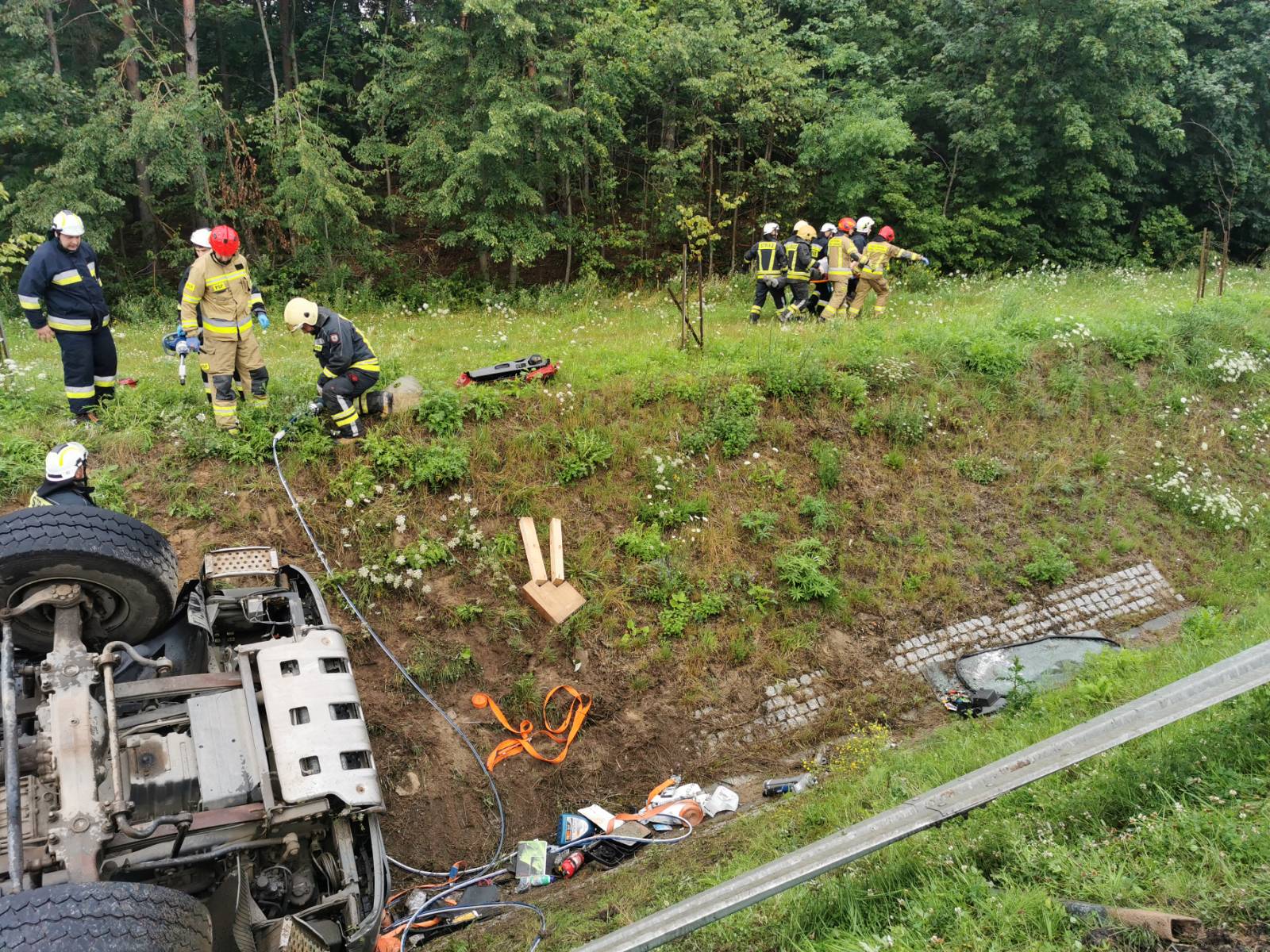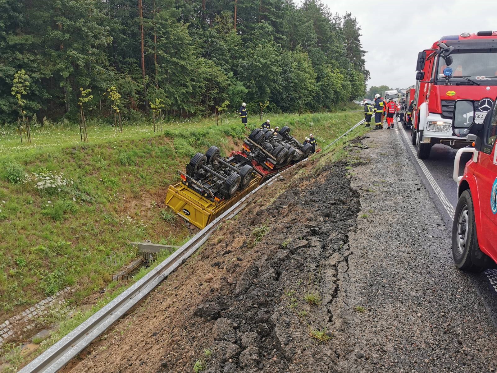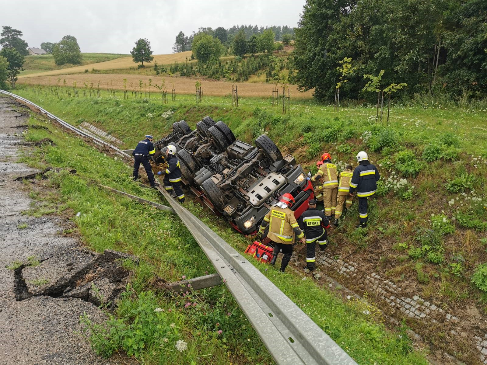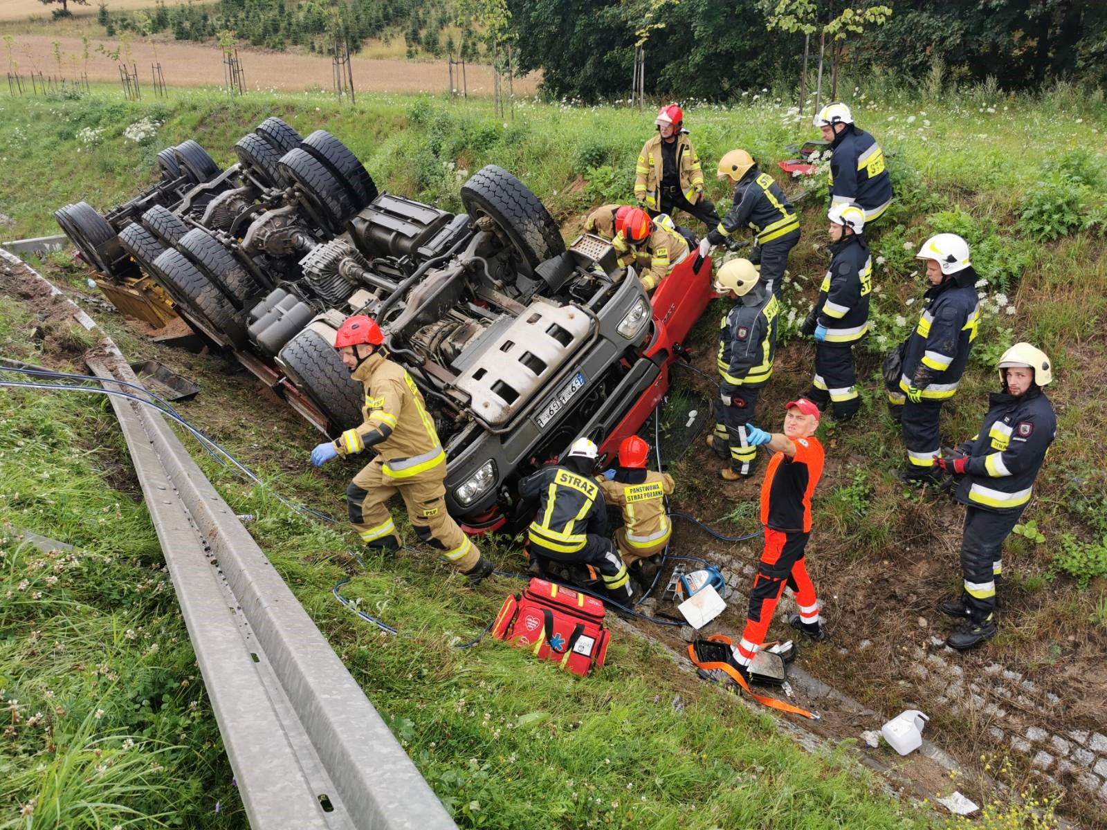 Po przybyciu na miejsce pierwszych zastępów stwierdzono, że w przydrożnym rowie znajduje się przewrócony na dach ciągnik siodłowy wraz z naczepą. Kierujący pojazdem mężczyzna został uwieziony w kabinie, przytomny z powierzchownymi obrażeniami ciała.
