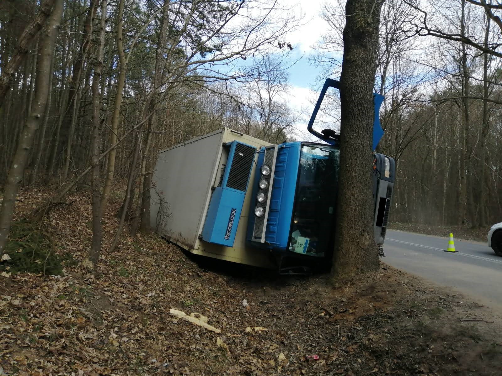 Po przybyciu na miejsce pierwszych zastępów stwierdzono, że samochód ciężarowy przewożący artykuły spożywcze przewrócił się do przydrożnego rowu i uderzył czołowo w drzewo. Kierowca samodzielnie opuścił pojazd, bez widocznych obrażeń, pod wpływem zdarzenia.