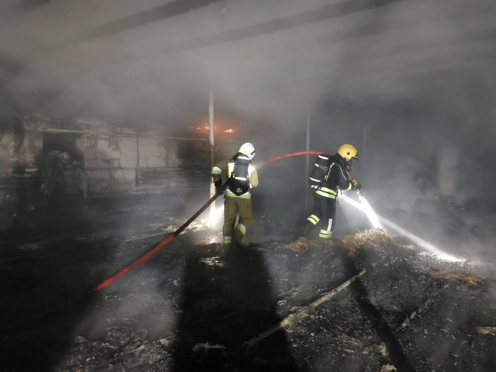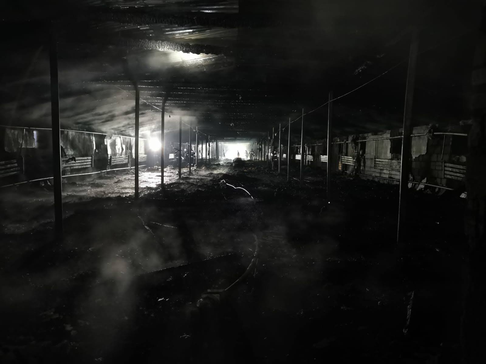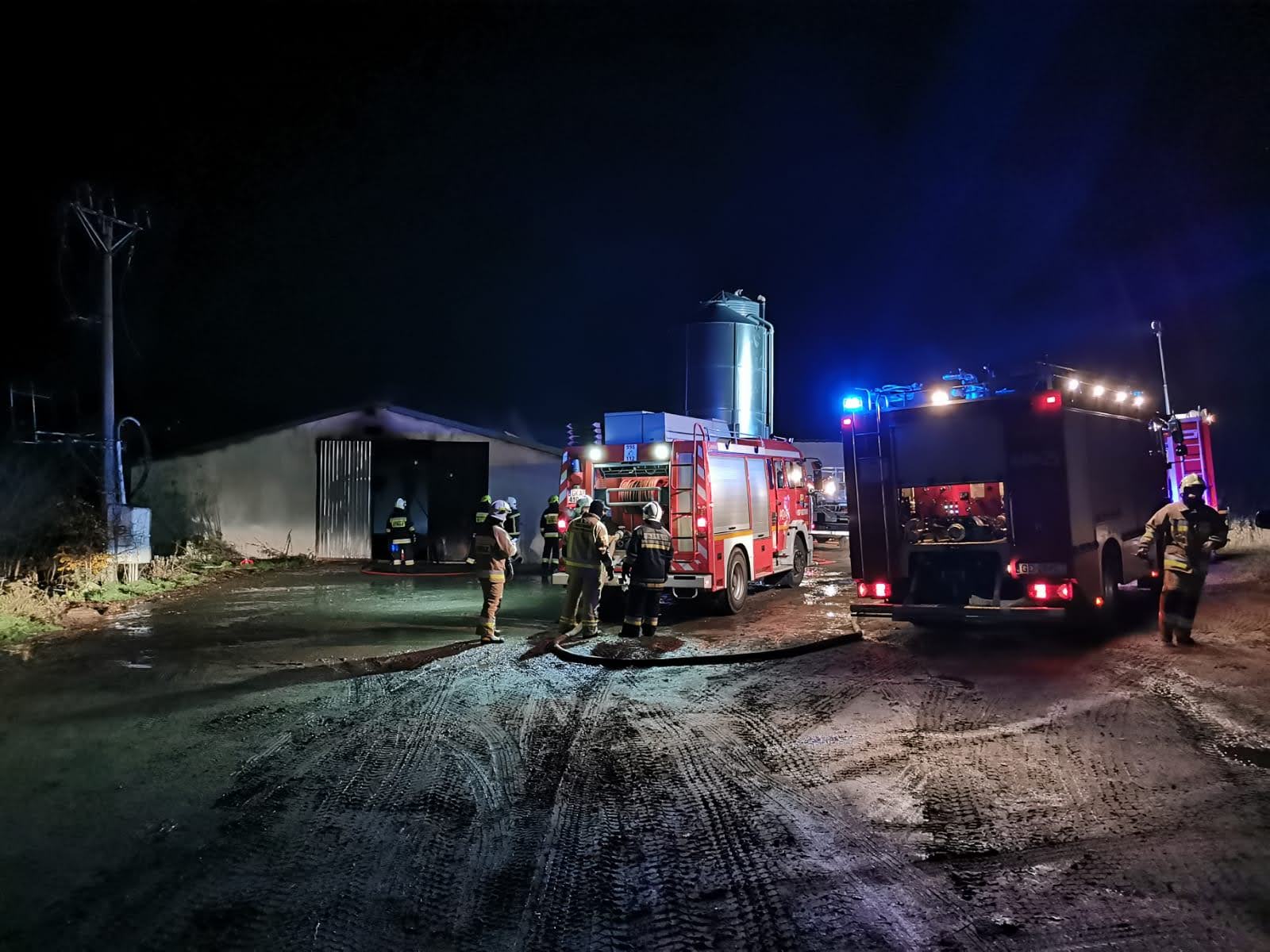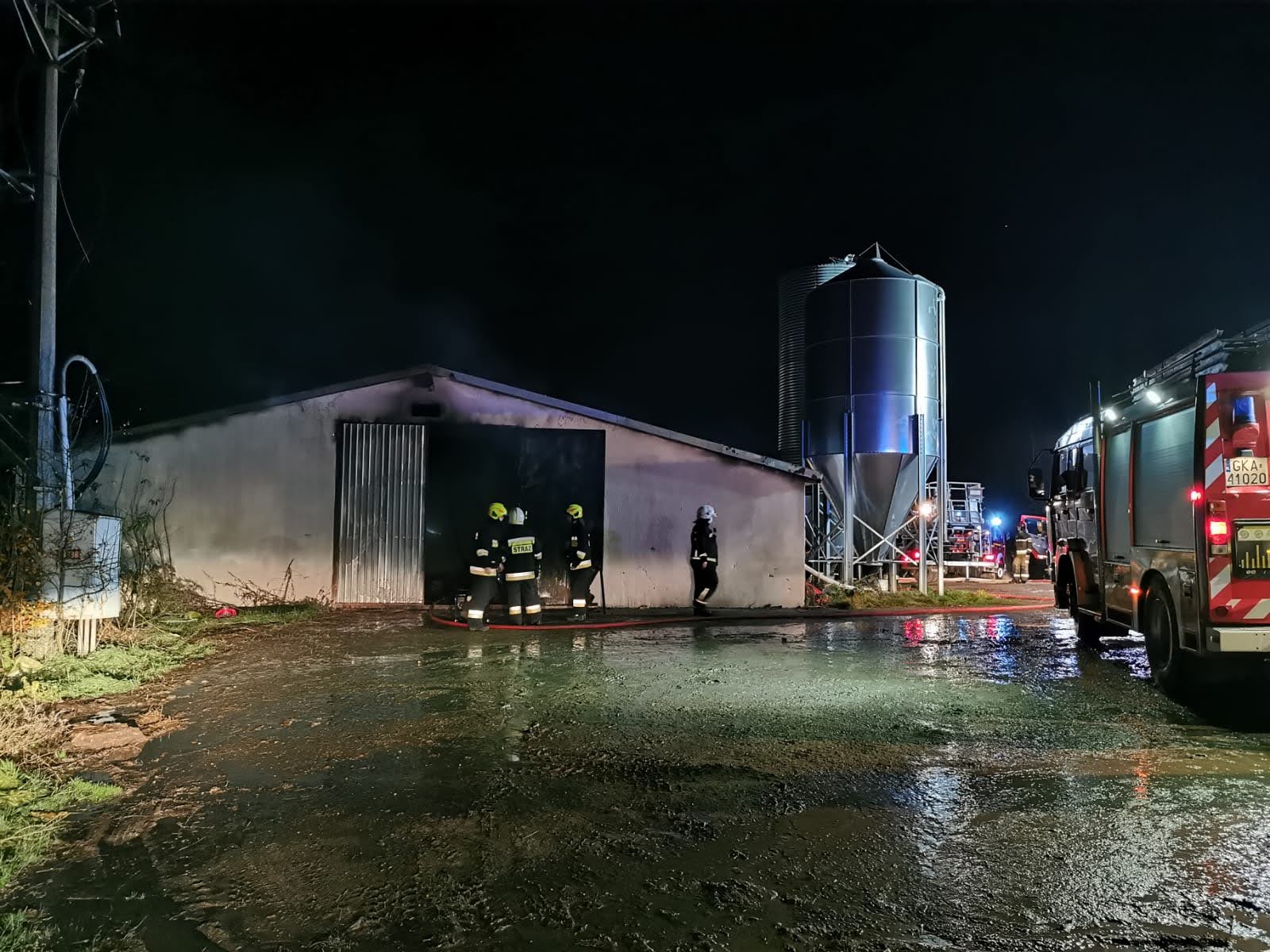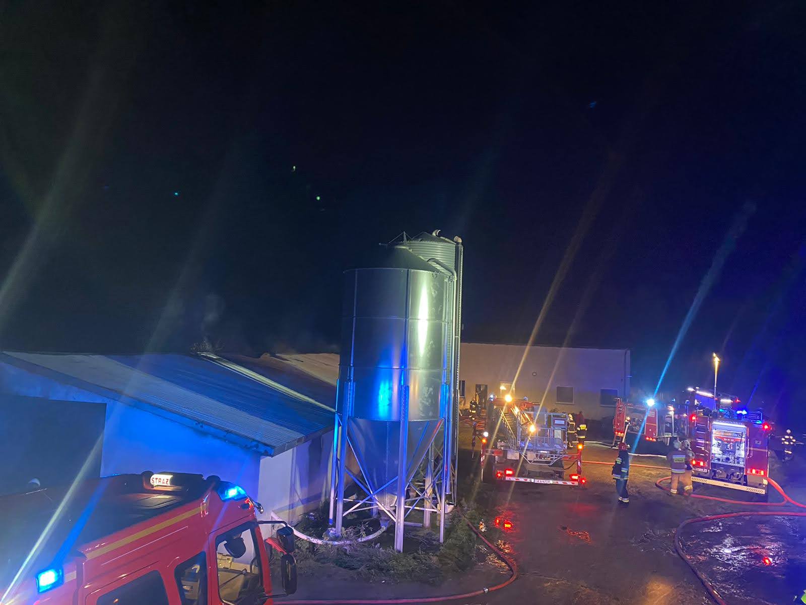 Zadysponowano łącznie 13 zastępów straży pożarnej. Po przybyciu na miejsce zdarzenia kierujący działaniem ratowniczym stwierdził, że całe wnętrze obiektu objęte jest pożarem. Budynek o wymiarach 100 m dł., 13 m szer. i 4 m wys., przygotowany do zasiedlenia kurcząt. Do obiektu bezpośrednio przylegał budynek gospodarczy nie objęty pożarem.