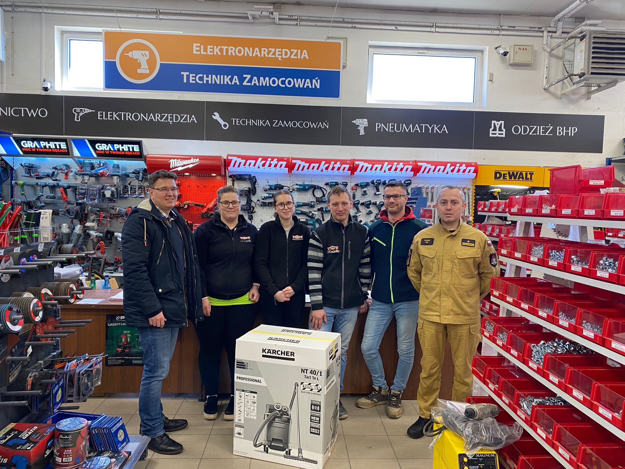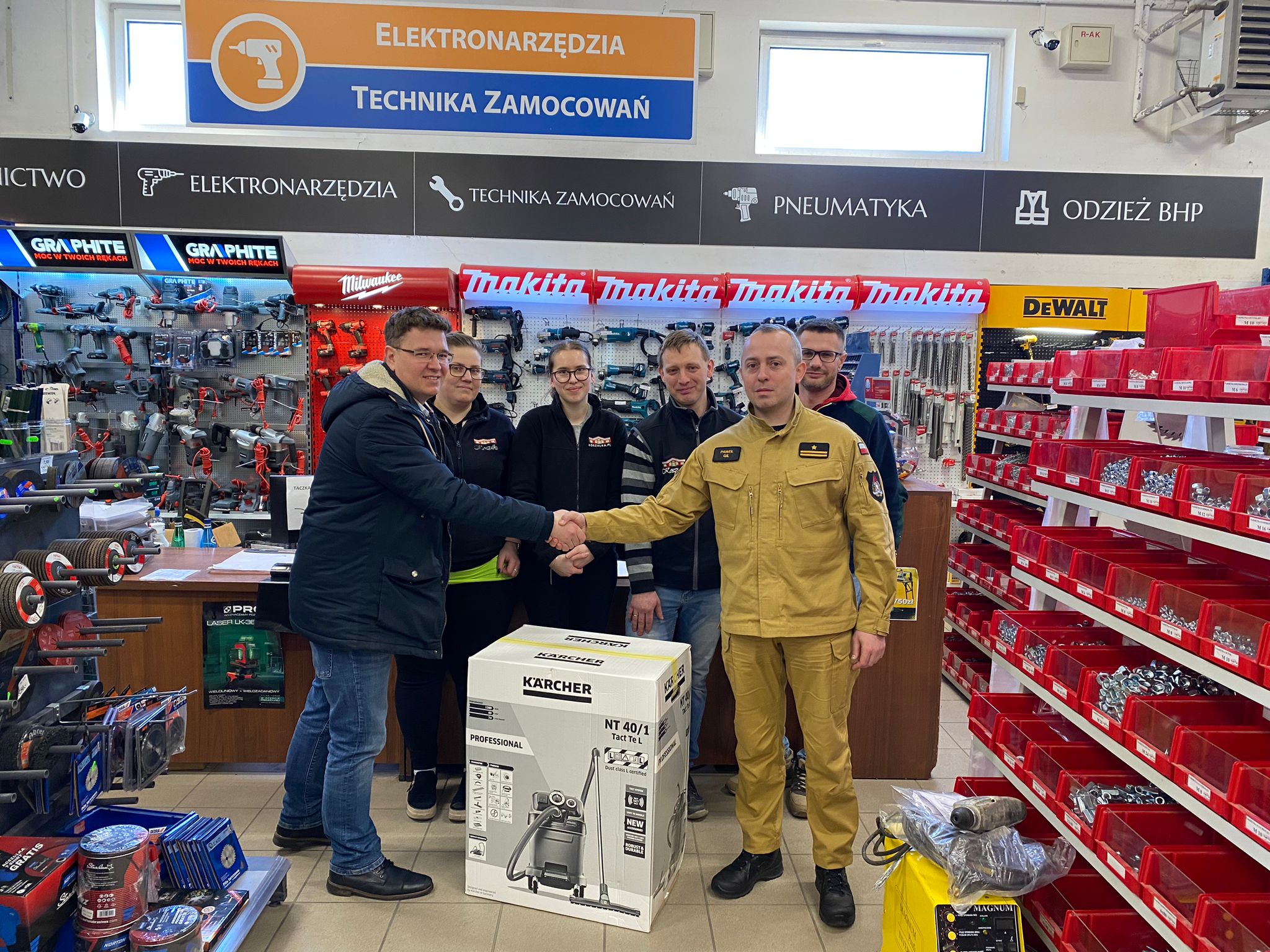 29 marca 2023 r. w siedzibie kartuskiego oddziału składu hurtowego PHU Koszałka Sp. z o.o. Komendant Powiatowy PSP w Kartuzach mł. bryg. Paweł Gil odebrał z rąk Piotra Koszałki przedstawiciela zarządu spółki odkurzacz przemysłowy.