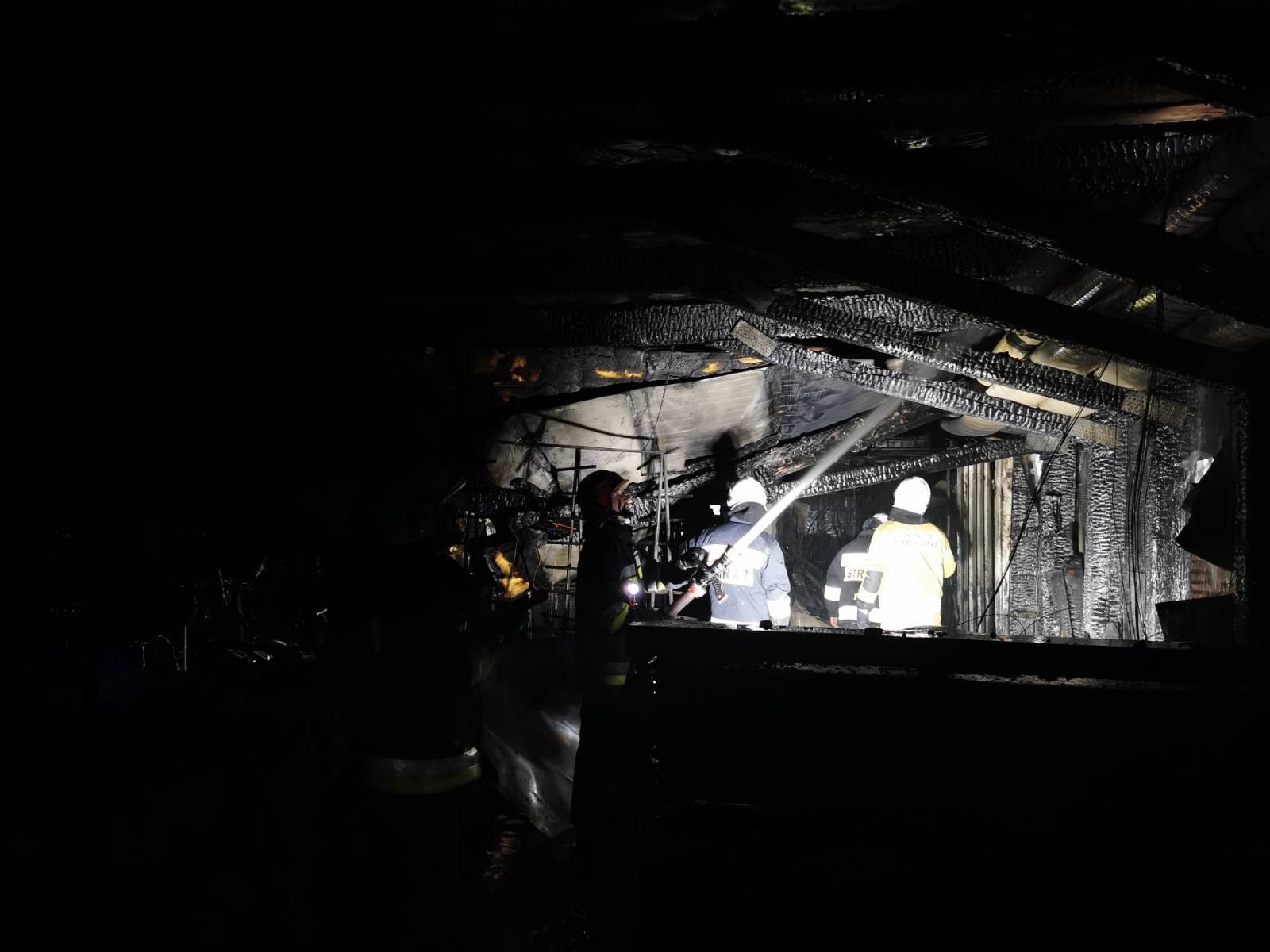 Działania zastępów polegały na zabezpieczeniu miejsca zdarzenia, podaniu 4 prądów wody w natarciu na budynki objęte pożarem oraz 1 prądu wody w obronie na budynek mieszkalny. W celu dotarcia do źródła pożaru w poszyciu dachowym i ścianach zewnętrznych wykonano otwory, które w późniejszym etapie umożliwiły również oddymienie obiektu. Zaopatrzenie wodne zorganizowano w oparciu o punkt czerpania wody utworzony na pobliskiej rzece oraz dowożenie z hydrantu.