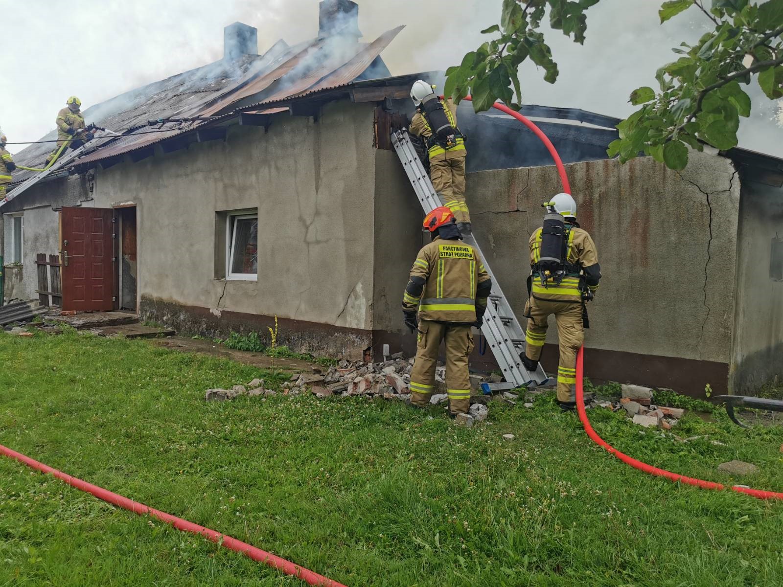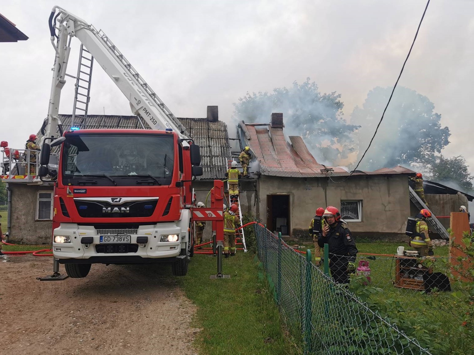 Po przybyciu na miejsce pierwszych zastępów stwierdzono, ze pali się dach na części budynku mieszkalnego typu bliźniak i dostawionej do niego przybudówki. Dwie osoby, które przebywały w budynku w momencie powstania pożaru, opuściły go przed przybyciem jednostek ochrony przeciwpożarowej, nie odnosząc żadnych obrażeń.