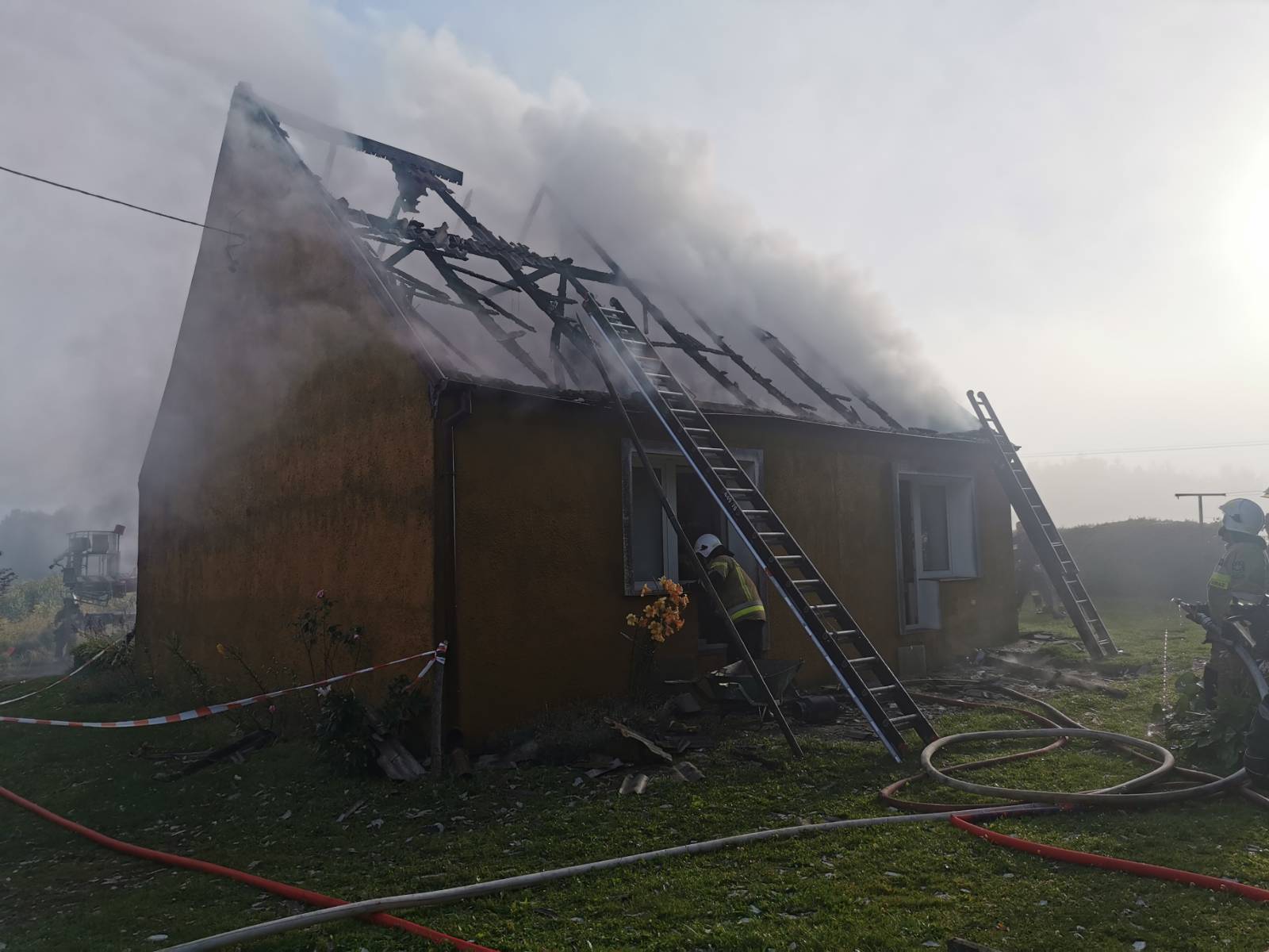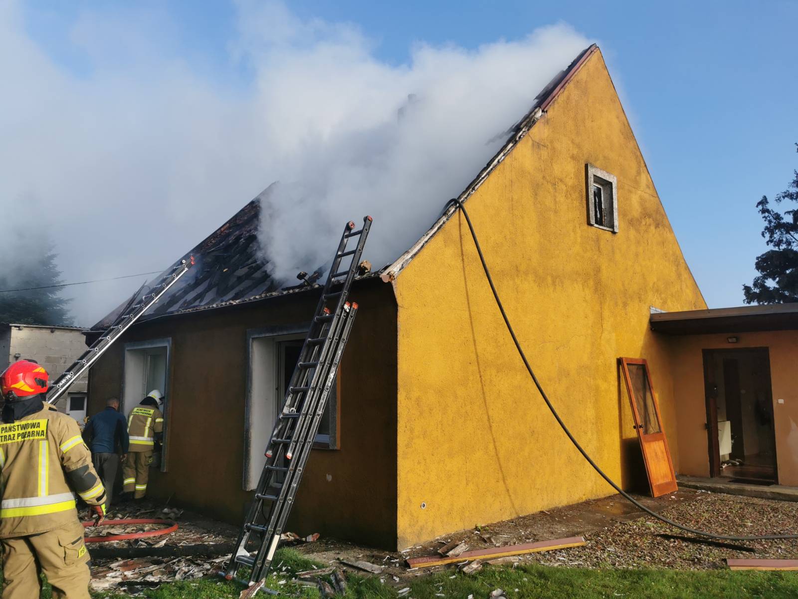 Po przybyciu na miejsce pierwszych zastępów stwierdzono, że pali się dach budynku mieszkalnego. Dwie osoby, które przebywały w budynku w momencie powstania pożaru, opuściły go przed przybyciem jednostek ochrony przeciwpożarowej, nie odnosząc żadnych obrażeń.