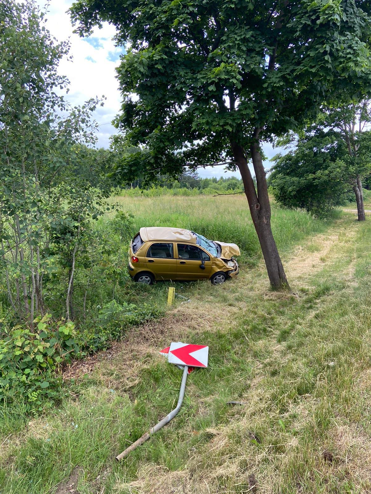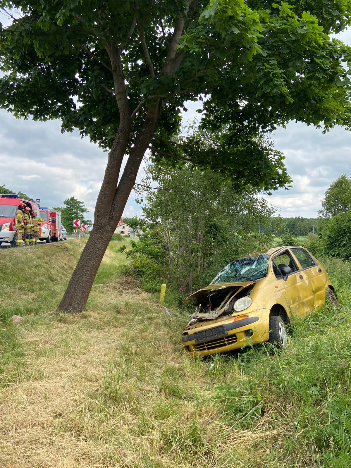 Pierwsze zdarzenie miało miejsce o godzinie 12:01. Samochód osobowy, którym podróżowała jedna osoba, wypadł z jezdni, dachował i zatrzymał się na kołach w przydrożnym rowie. Wewnątrz znajdowała się poszkodowana kobieta kierująca pojazdem. Przytomna z widocznymi obrażeniami kończyn górnych.