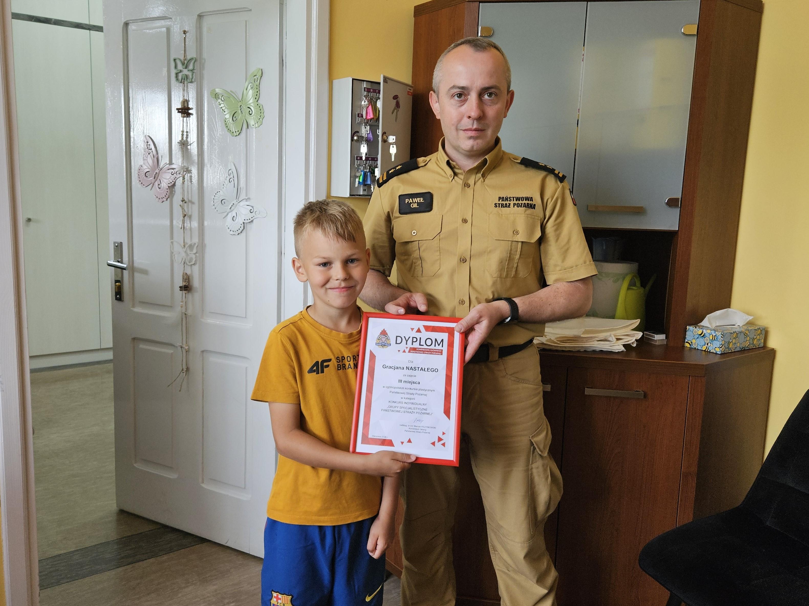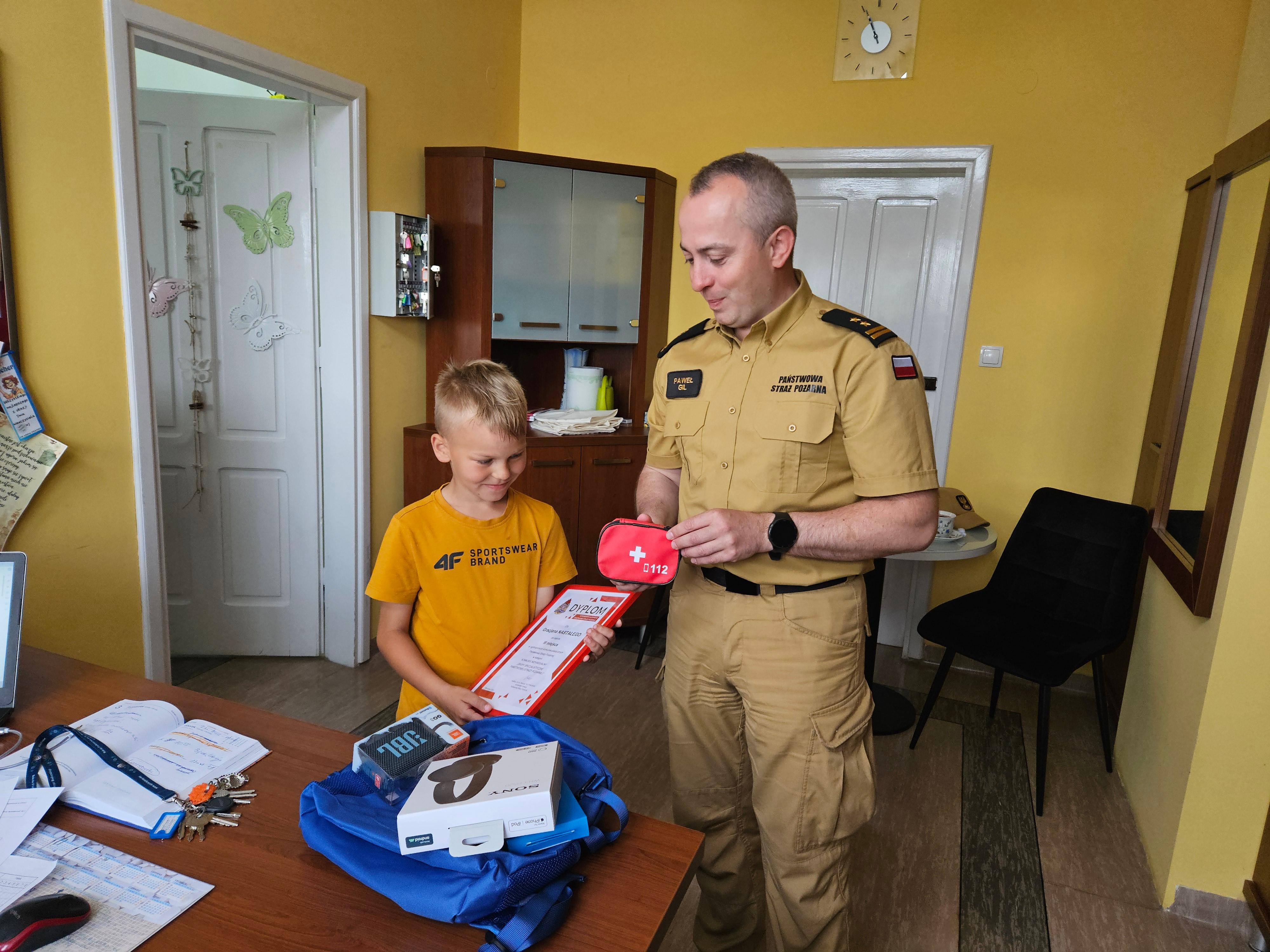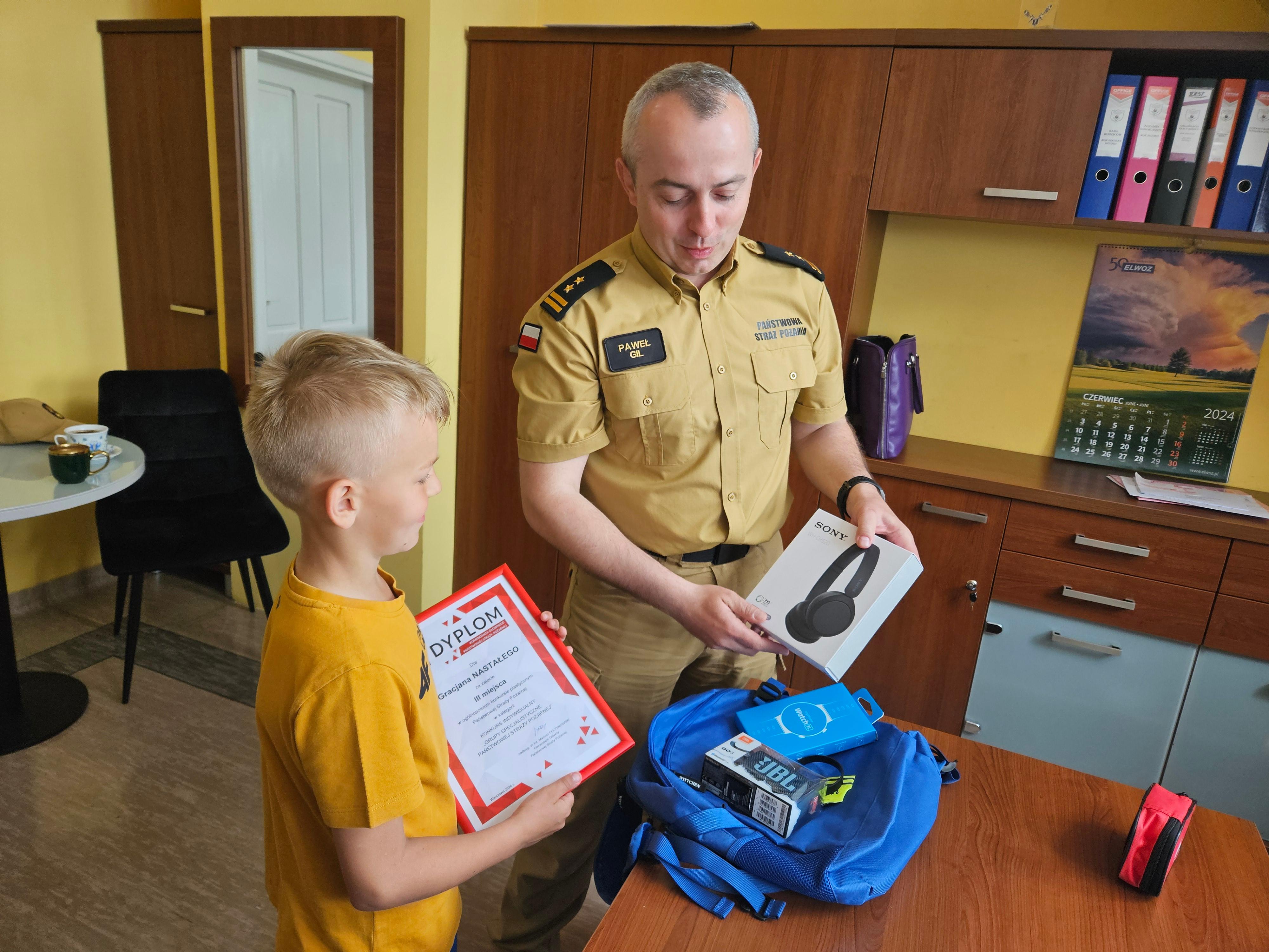 Dyplom i nagrody rzeczowe w imieniu nadbryg. Mariusza Feltynowskiego, Komendanta Głównego PSP w dniu 3 czerwca 2024 r. wręczył bryg. Paweł Gil, Komendant Powiatowy PSP w Kartuzach w obecności Pani Emilii Maszke, Dyrektora Szkoły Podstawowej im. ks. A. Sadowskiego w Lisich Jamach.