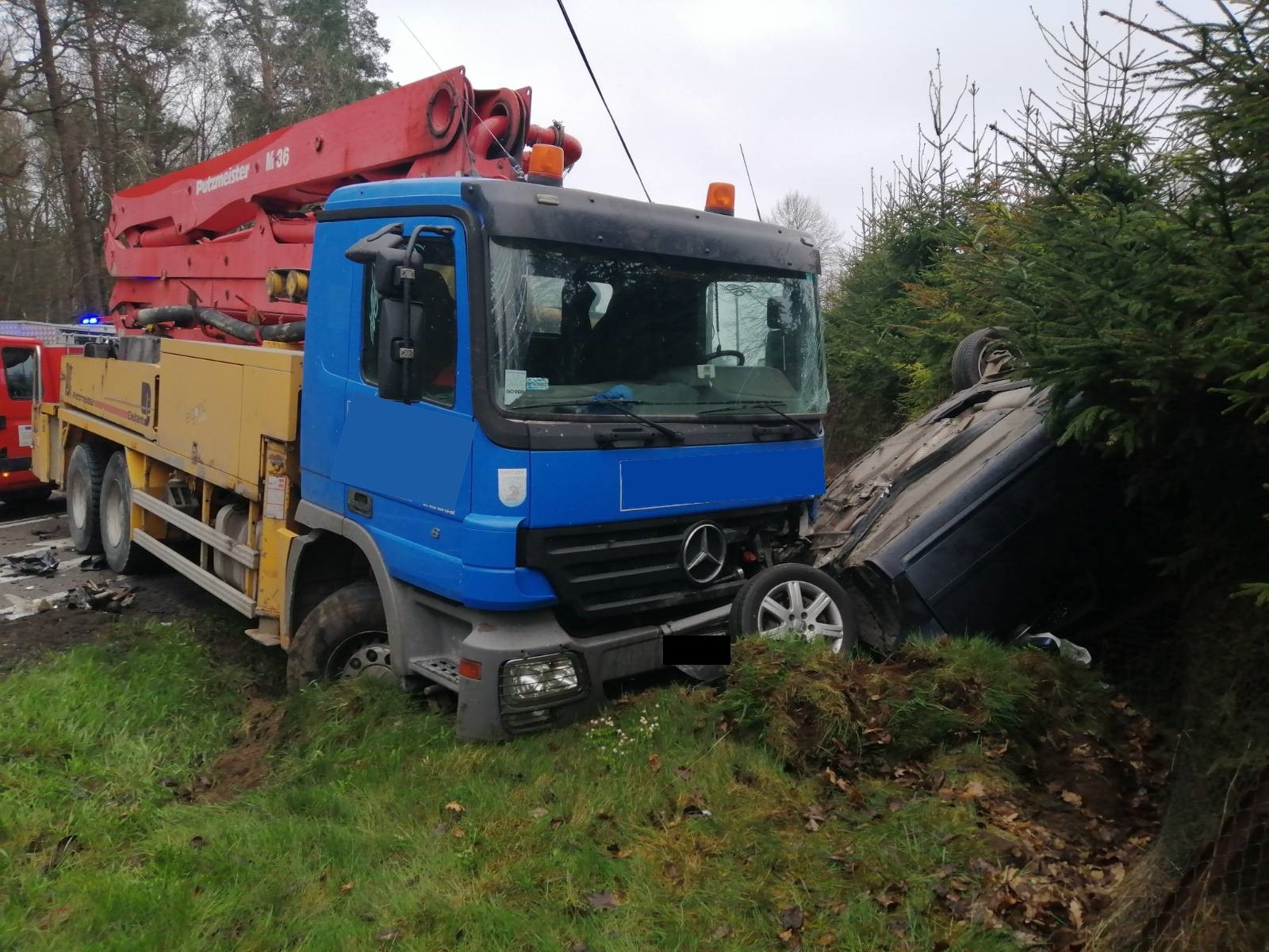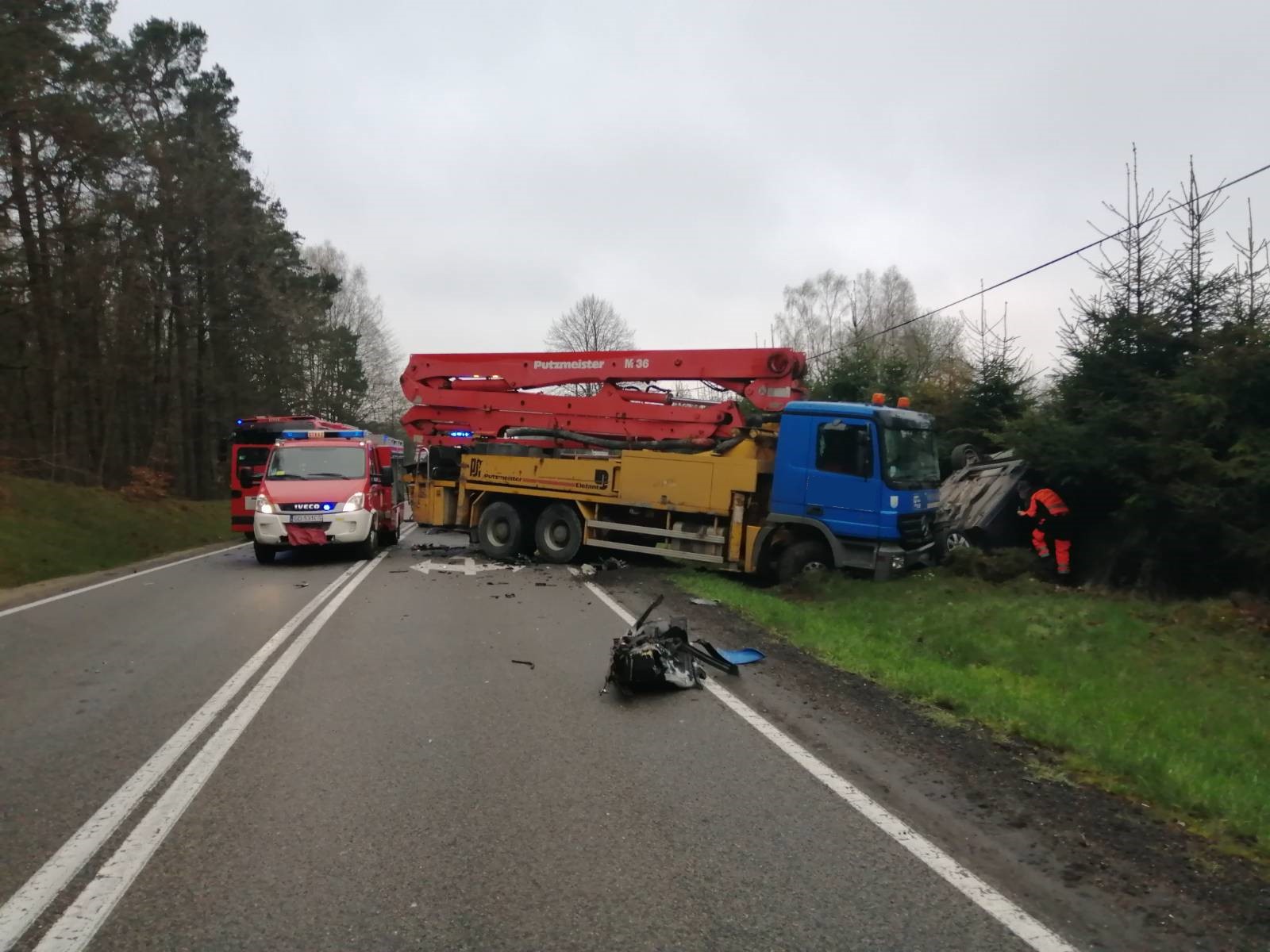 Po przybyciu na miejsce pierwszych zastępów stwierdzono, że doszło do zderzenia samochodu ciężarowego z samochodem osobowym. Samochód ciężarowy znajdował się na skraju jezdni opierając się o przewrócony samochód osobowy znajdujący się poza jezdnią. Wewnątrz samochodu osobowego znajdował się uwięziony kierowca, nieprzytomny bez czynności życiowych.