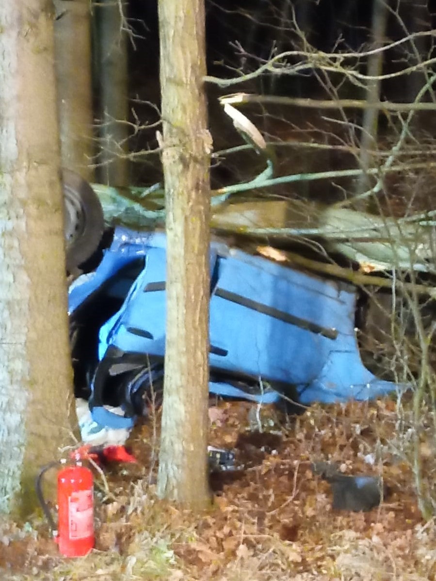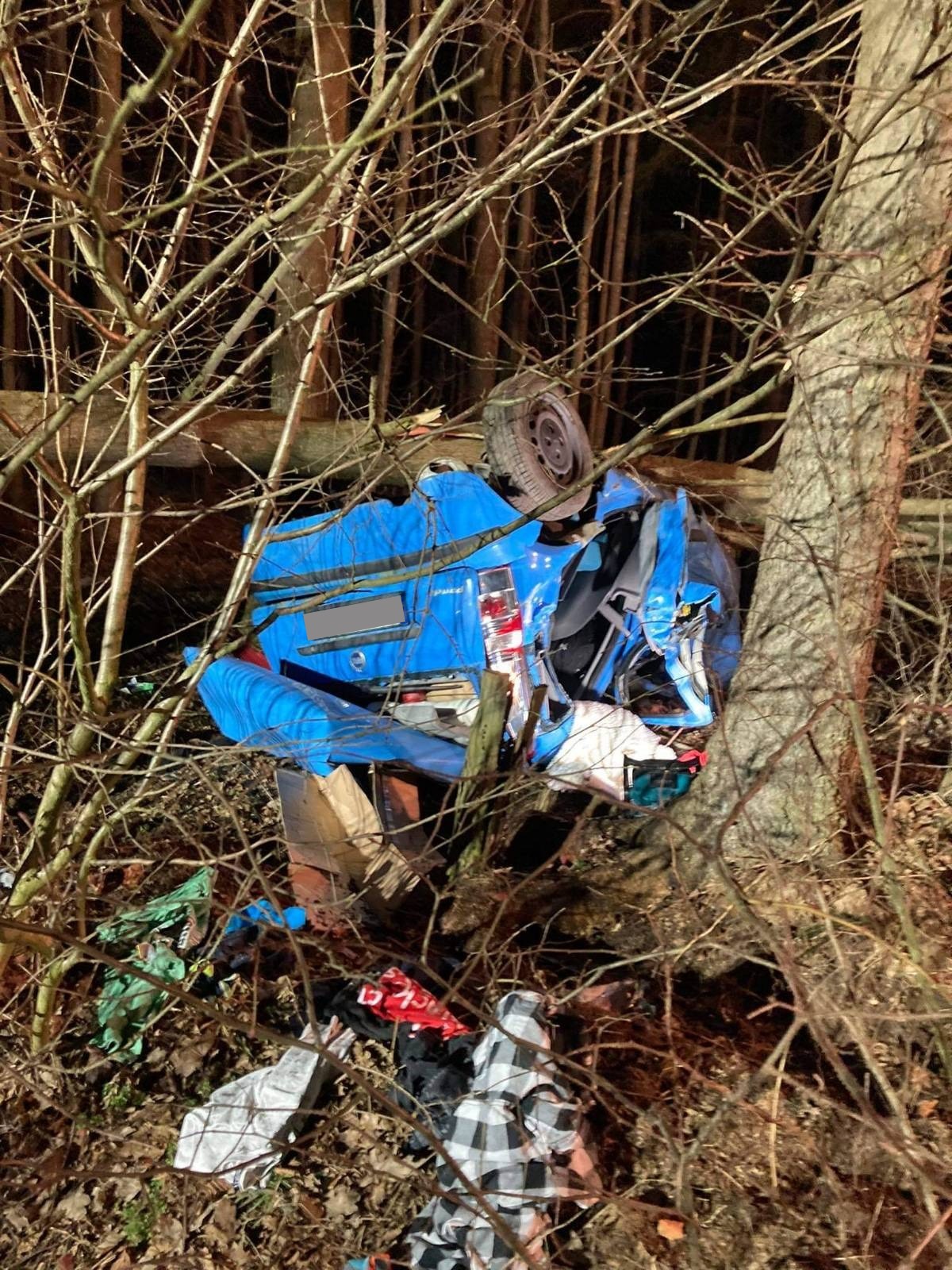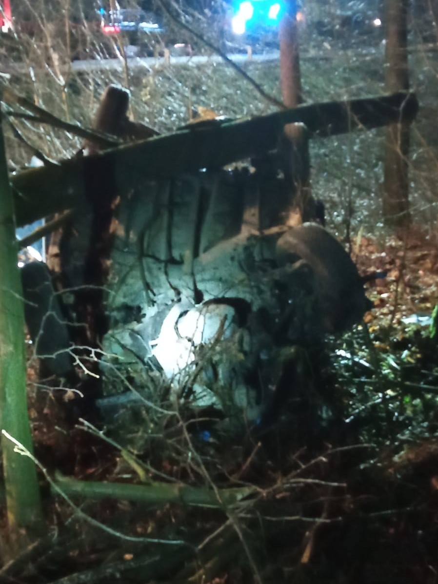 Po przybyciu na miejsce pierwszych zastępów stwierdzono, że poza jezdnią znajduje się leżący na dachu samochód osobowy, na którym leży złamany pień drzewa. Wewnątrz pojazdu znajdował się nieprzytomny kierowca. Przybyły na miejsce zdarzenia ratownik z Zespołu Ratownictwa Medycznego rozpoznał zgon mężczyzny.
