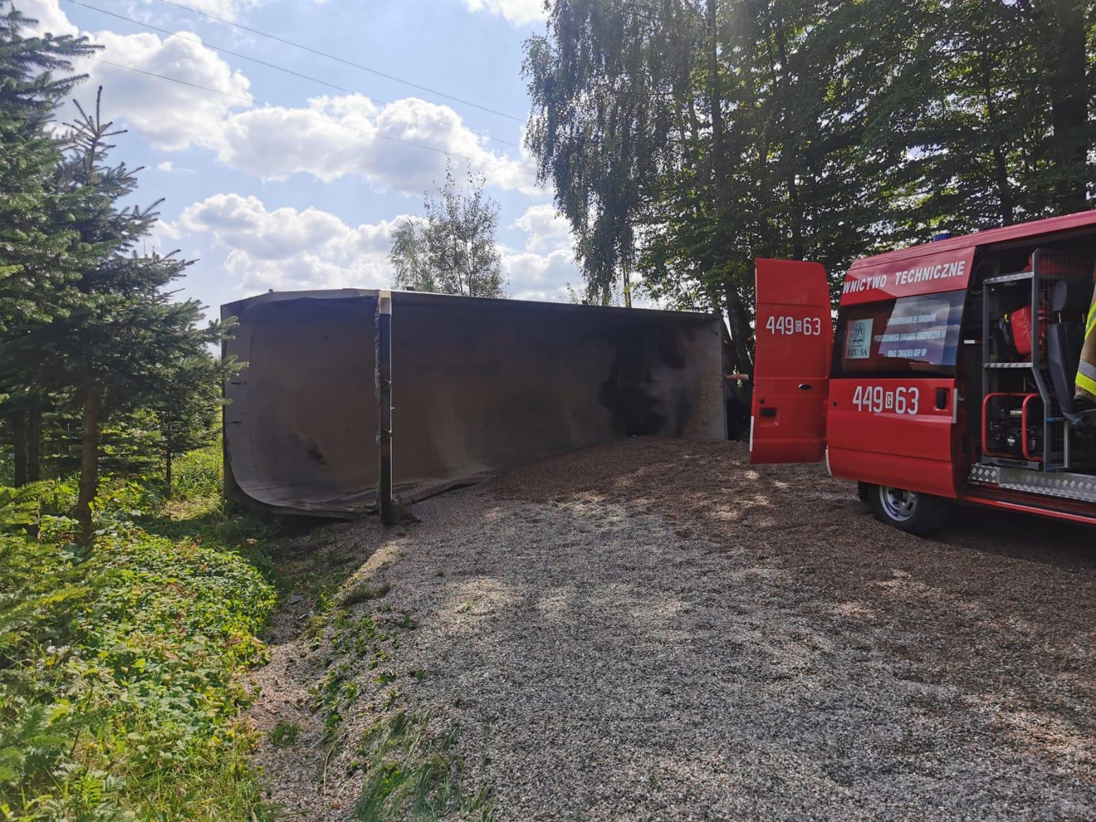 Po przybyciu na miejsce pierwszych zastępów zastano przewrócony pojazd ciężarowy wraz z naczepą. Pojazdem podróżowały dwie osoby. Na poboczu pod opieką osób postronnych znajdował się chłopiec, kierujący pojazdem mężczyzna był uwięziony w pojeździe.