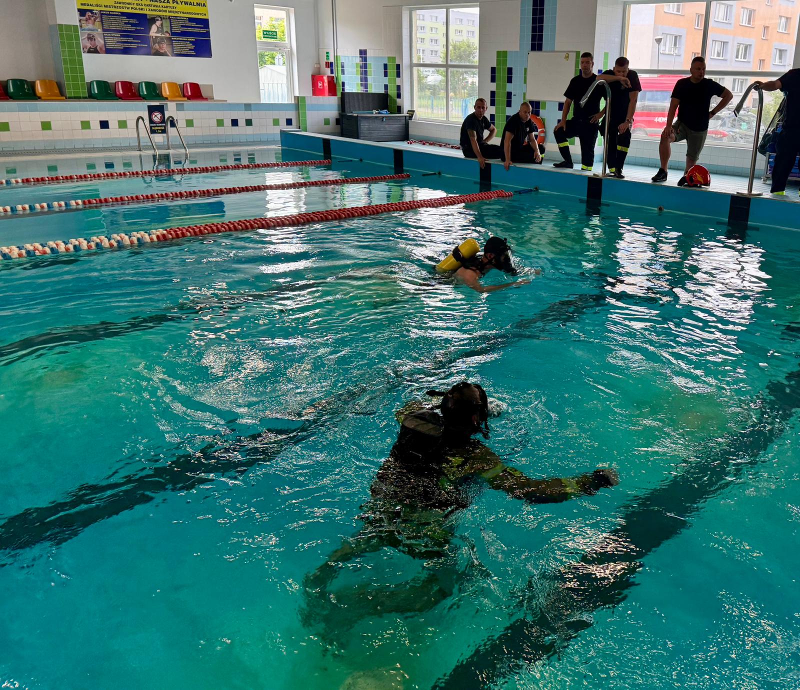 Komenda Powiatowa PSP w Kartuzach składa serdeczne podziękowania za pomoc w organizacji przedsięwzięcia Burmistrzowi Kartuz, Panu Mieczysławowi Grzegorzowi Gołuńskiemu, Prezesowi Kartuskiego Przedsiębiorstwa Wodociągów i Kanalizacji (KPWiK), Panu Tadeuszowi Ostankowi, a w szczególności instruktorom i ratownikom wodnym, którzy czuwali nad bezpieczeństwem strażaków podczas ćwiczeń.