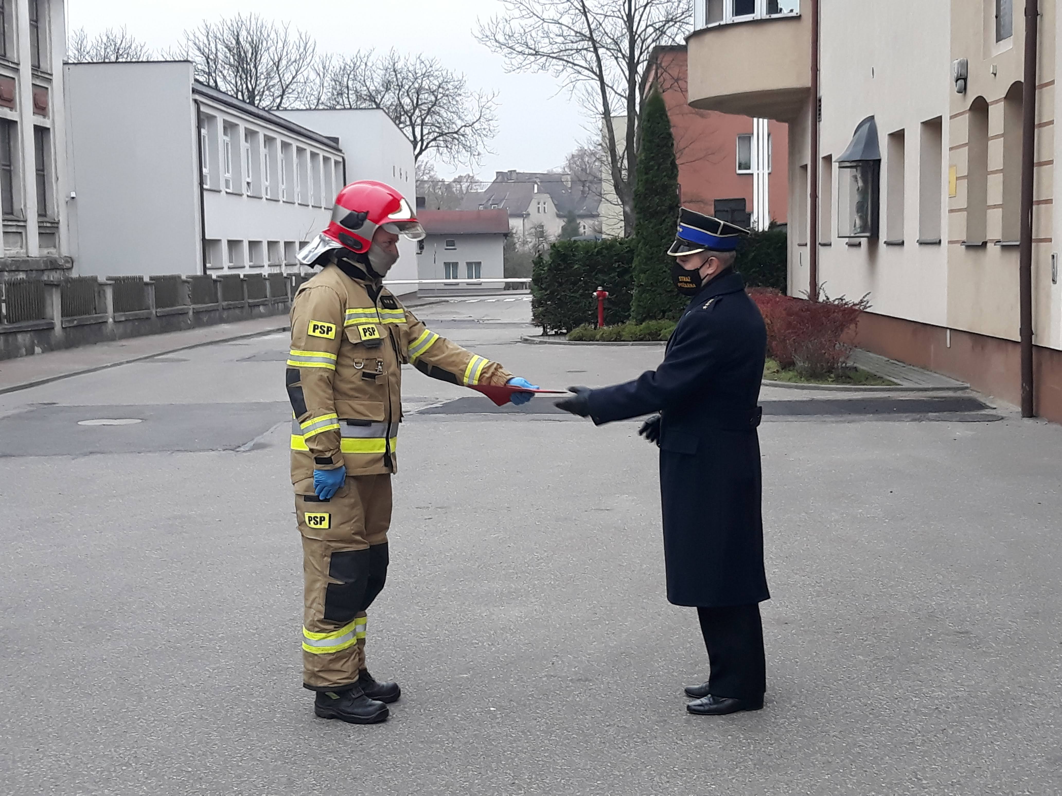 Z rąk p.o. Komendanta Powiatowego PSP w Kartuzach - st. kpt. Pawła Gila, akt nadania wyższego stopnia służbowego odebrał st. asp. Zdzisław Kwidziński, któremu Komendant Główny Państwowej Straży Pożarnej rozkazem personalnym nr 11/2020 z dnia 30.10.2020 r. nadał stopień aspiranta sztabowego.