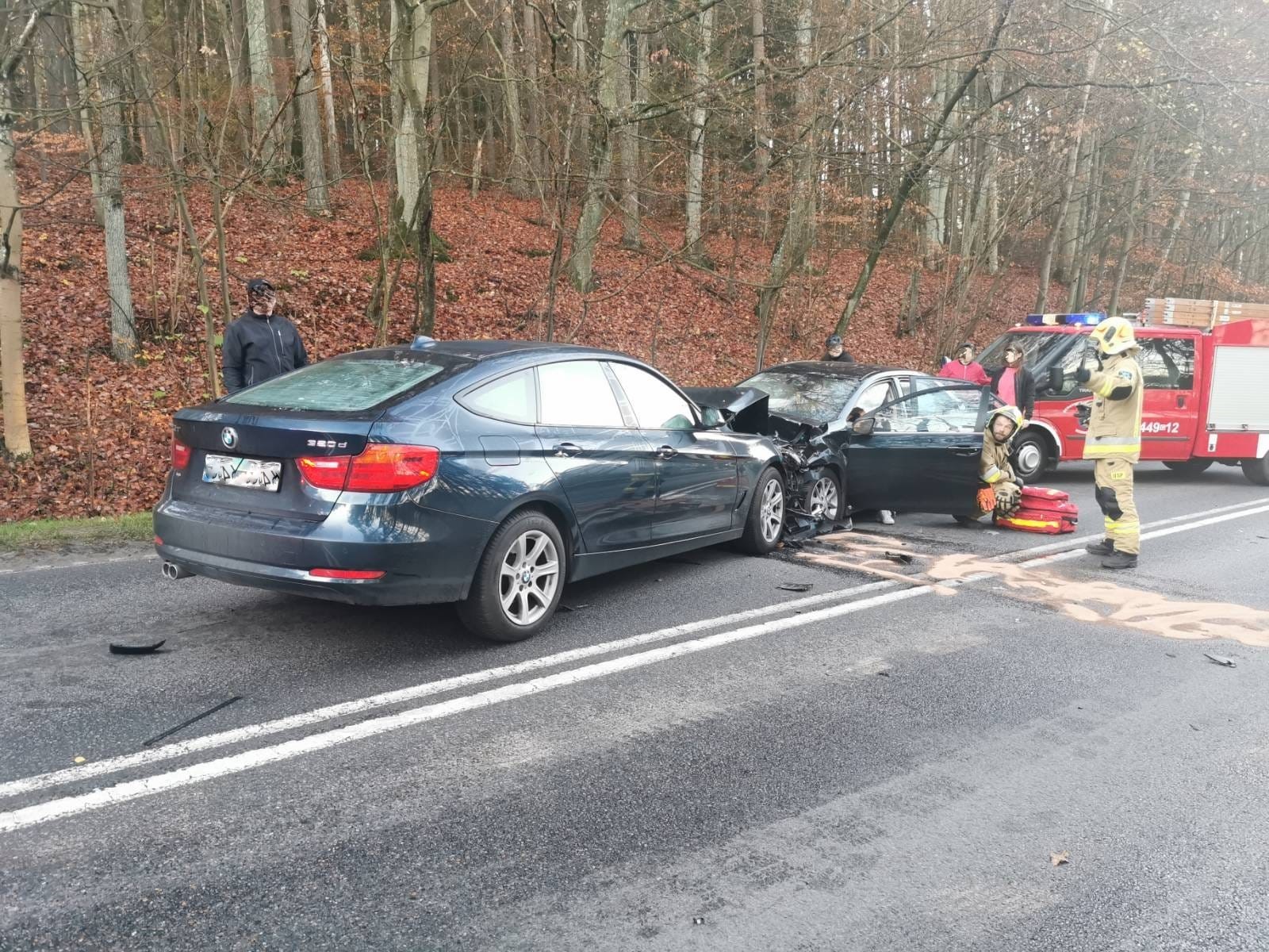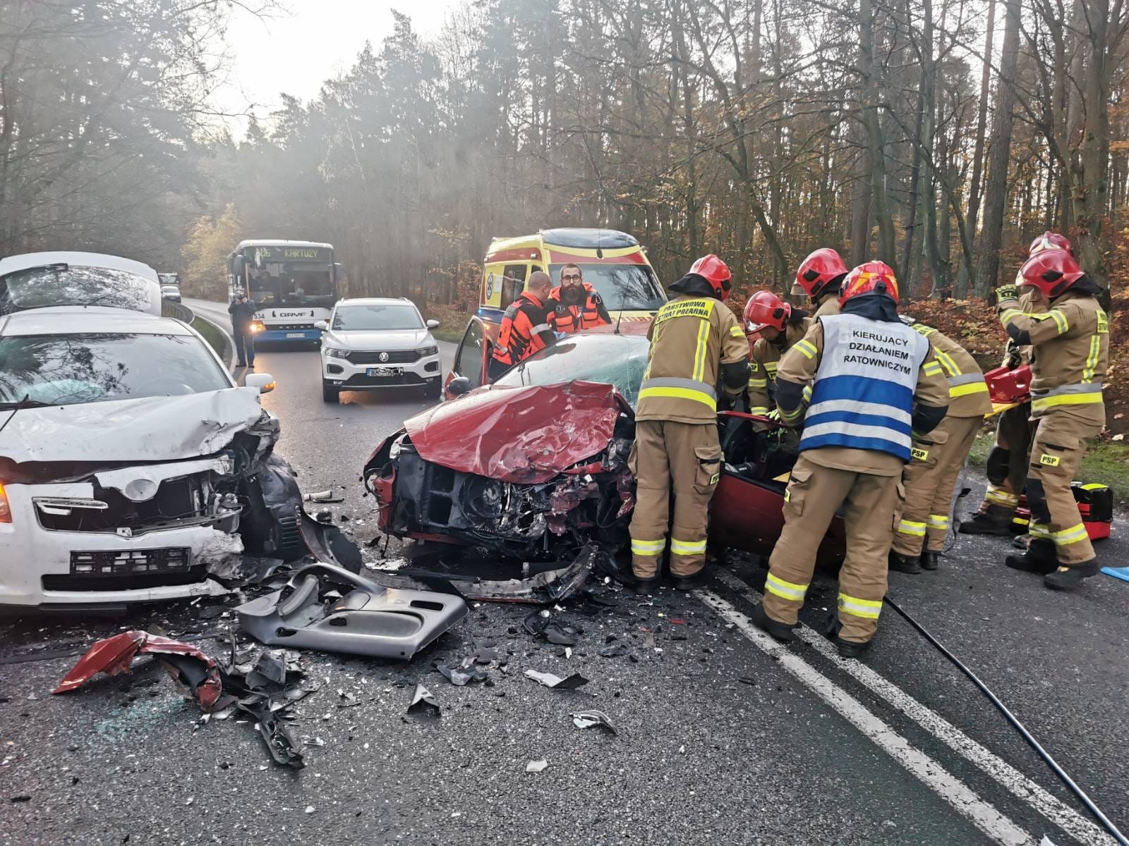 Po przybyciu na miejsce pierwszych zastępów stwierdzono, że doszło do zderzenia z udziałem czterech samochodów osobowych. W jednym z samochodów znajdował się uwięziony kierowca, przytomny z obrażeniami lewej nogi. Druga osoba poszkodowana, uskarżająca się na ból pleców znajdowała się w kolejnym pojeździe. Pozostałe osoby biorące udział w zdarzeniu znajdowały się poza pojazdami bez widocznych obrażeń.