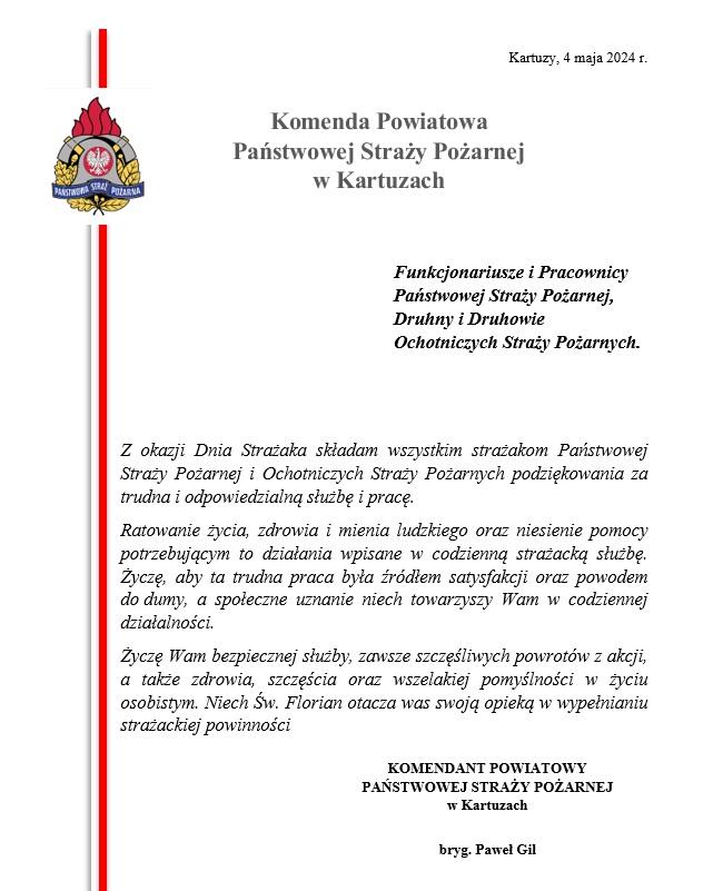 Życzenia Komendanta Powiatowego Państwowej Straży Pożarnej w Kartuzach z okazji Dnia Strażaka