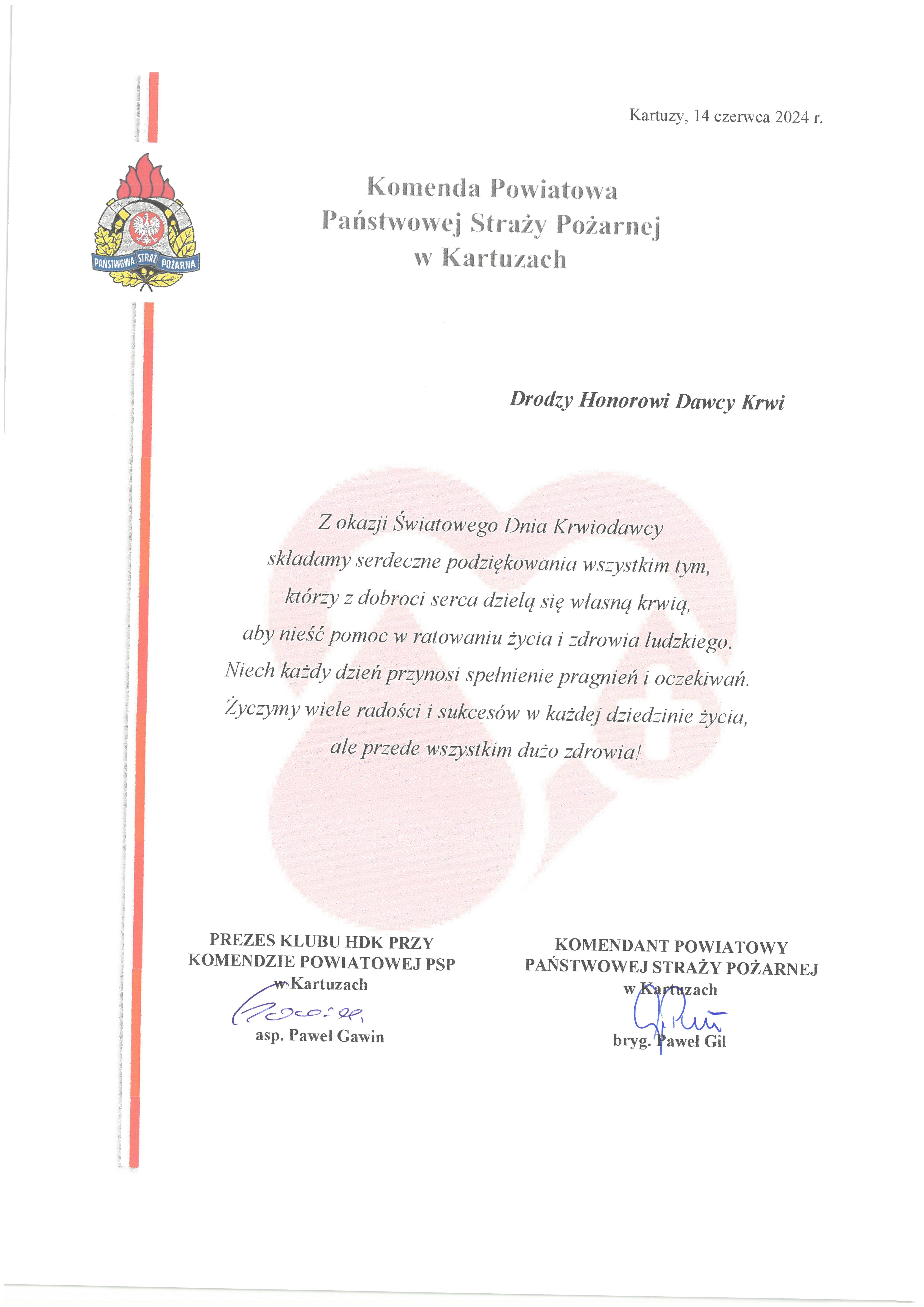 Z okazji Światowego Dnia Krwiodawcy, obchodzonego w dniu 14 czerwca, Komendant Powiatowy PSP w Kartuzach wraz z Prezesem Klubu HDK przy KP PSP w Kartuzach składają serdeczne podziękowania i życzenia wszystkim Honorowym Dawcom Krwi.