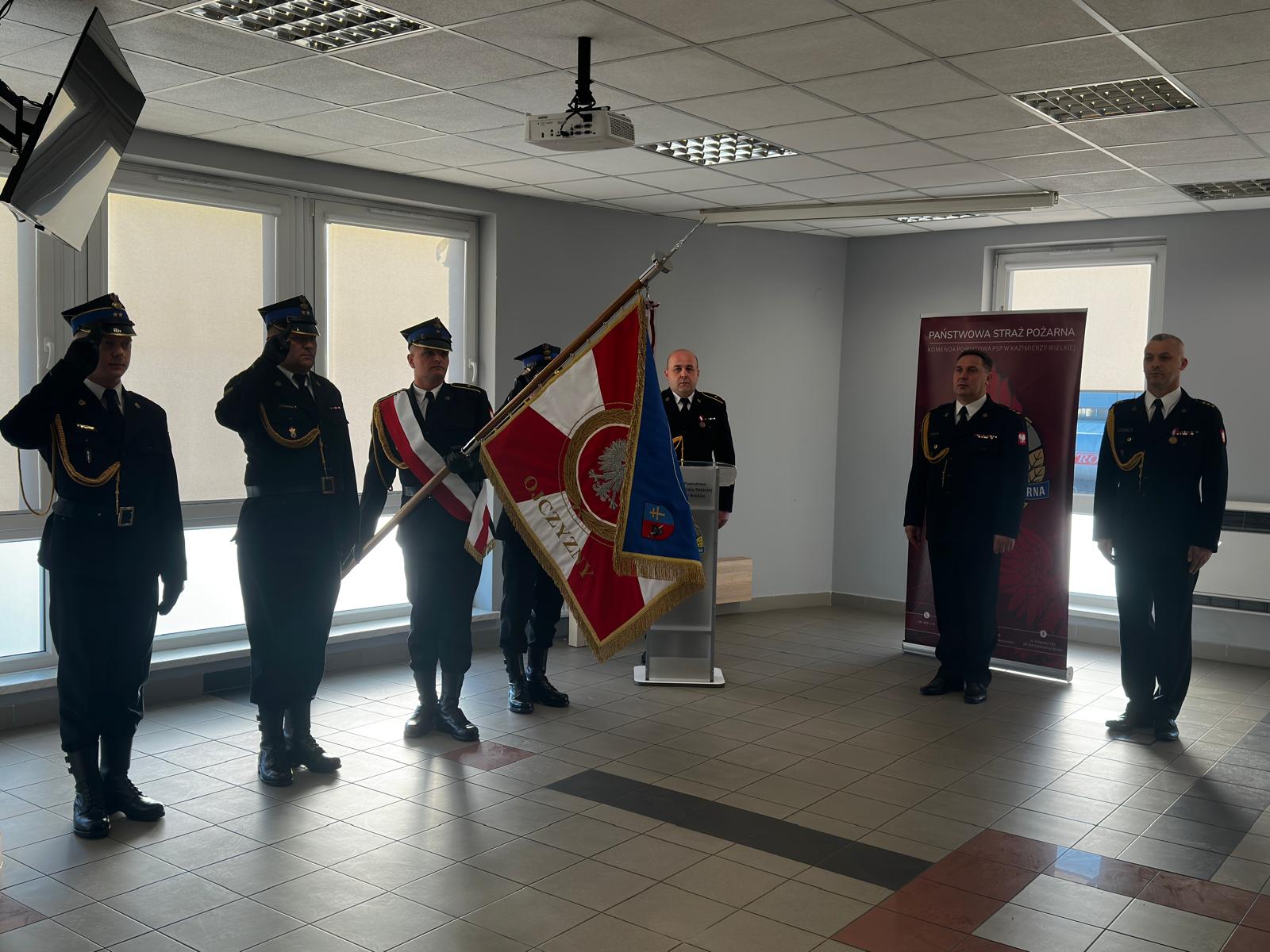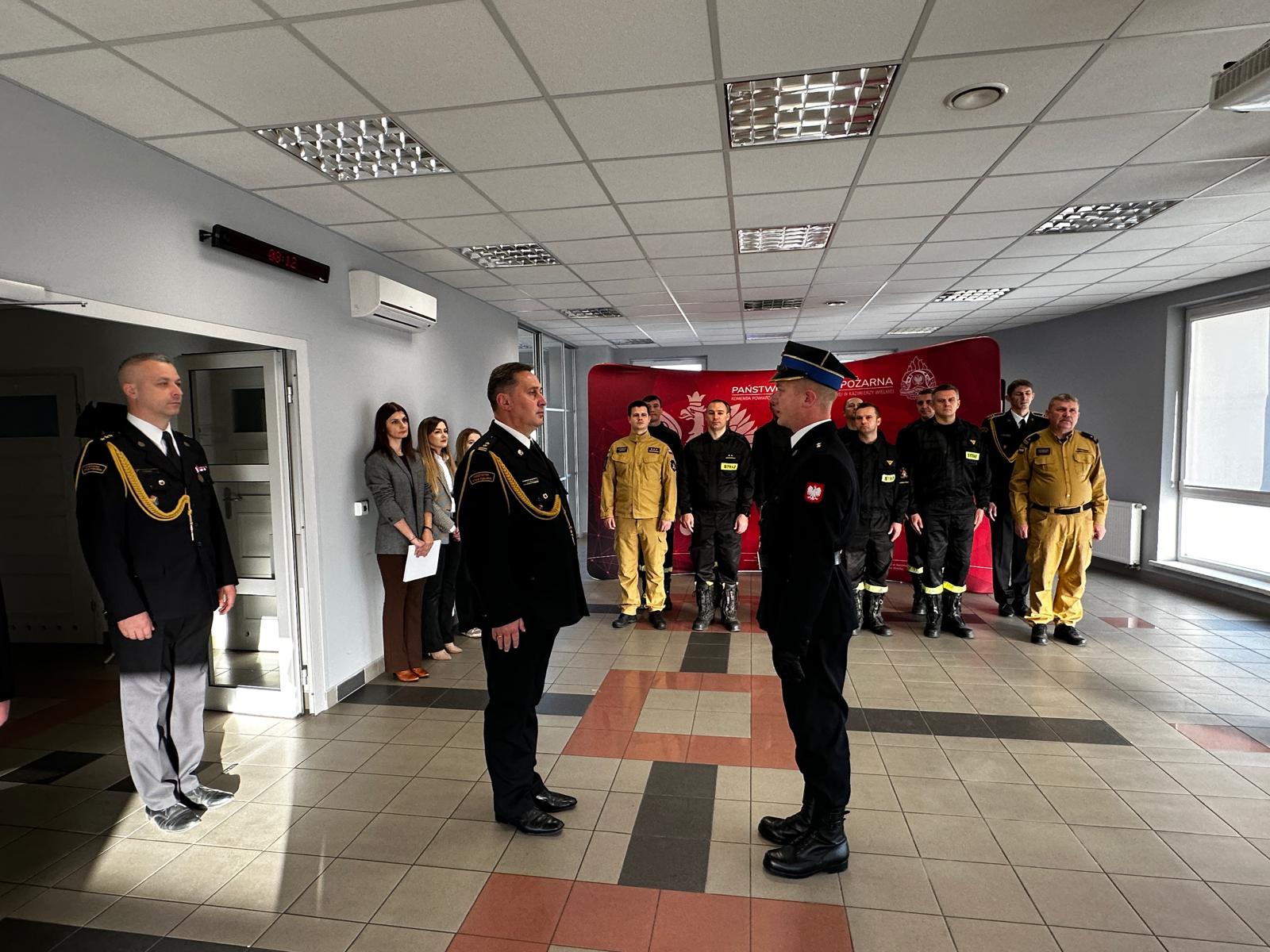 W dniu 18.11.2025 roku w sali konferencyjnej Komendy Powiatowej Państwowej Straży Pożarnej w Kazimierzy Wielkiej odbył się uroczysty apel z okazji nadania wyższych stopni służbowych strażaków. Uroczystość rozpoczęto od złożenia meldunku komendantowi powiatowemu bryg. Krzysztofowi Jachowi przez mł. kpt. Marcina Nowaka.
