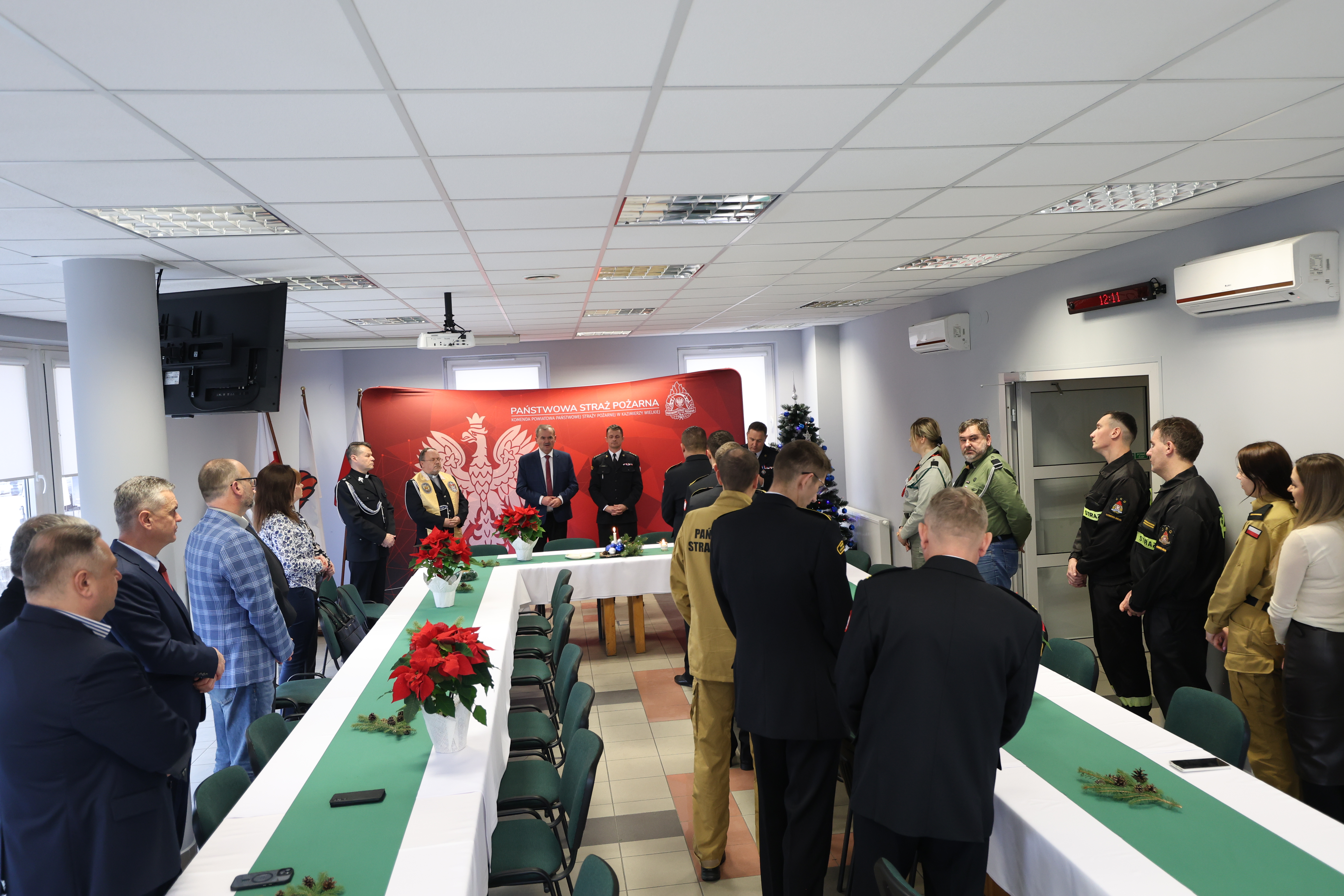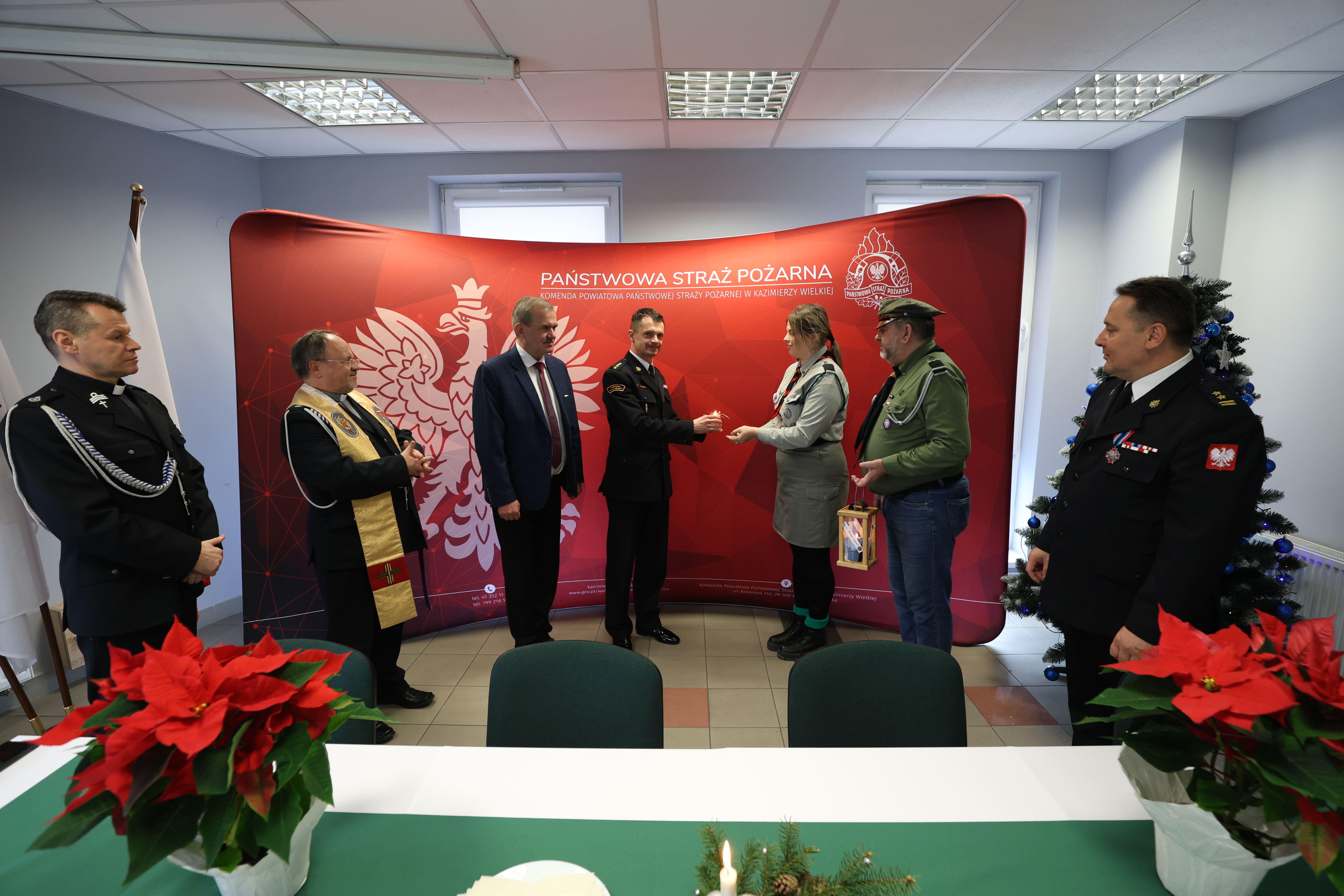 20 grudnia 2024 roku o godzinie 12:00, w sali konferencyjnej Komendy Powiatowej Państwowej Straży Pożarnej w Kazimierzy Wielkiej odbyło się spotkanie opłatkowe funkcjonariuszy i pracowników cywilnych. Uroczystość została zainaugurowana odwiedzinami harcerzy z 28. Buskiej Drużyny Wielopoziomowej „Żywioły” działającej przy Kazimierskim Ośrodku Kultury, na czele z drużynowym phm Ireneuszem Górskim. Na ręce Komendanta Powiatowego st. kpt. Marcina Oziębło goście przekazali Płomień Betlejemskiego Światła Pokoju. Złożono również życzenia świąteczno – noworoczne. Stało się już tradycją, że przed każdymi świętami kazimierscy strażacy spotykają się, by złożyć sobie wzajemnie życzenia. Komendant Powiatowy PSP w Kazimierzy Wielkiej st. kpt. Marcin Oziębło, który w imieniu własnym oraz swojego Zastępcy bryg. Krzysztofa Jacha przywitał wszystkich strażaków, pracowników cywilnych i zaproszonych gości składając im i ich rodzinom życzenia zdrowych, spokojnych, radosnych i rodzinnych Świąt Bożego Narodzenia, a także dziękując za codzienny trud w służbie i w pracy. Uroczystość swoją obecnością zaszczycili znamienici goście w osobach m.in.: Starosty Powiatu Kazimierskiego – Jana Nowaka, jednocześnie Prezesa Zarządu Oddziału Powiatowego Związku Ochotniczych Straży Pożarnych RP w Kazimierzy Wielkiej, Pani Wójt, Wójtów i Burmistrzów z terenu powiatu kazimierskiego, jednocześnie Prezesów Zarządów Oddziałów Gminnych i Miejsko-Gminnych Związku Ochotniczych Straży Pożarnych RP, Honorowego Kapelana służb mundurowych powiatu kazimierskiego-ks. kan. Mariana Fatygi, kapelana strażaków powiatu kazimierskiego- ks. kan. Arkadiusza Borusińskiego, Prezesa Koła numer 11 Związku Żołnierzy Wojska Polskiego w Kazimierzy Wielkiej – dr Tadeusza Podkowy.