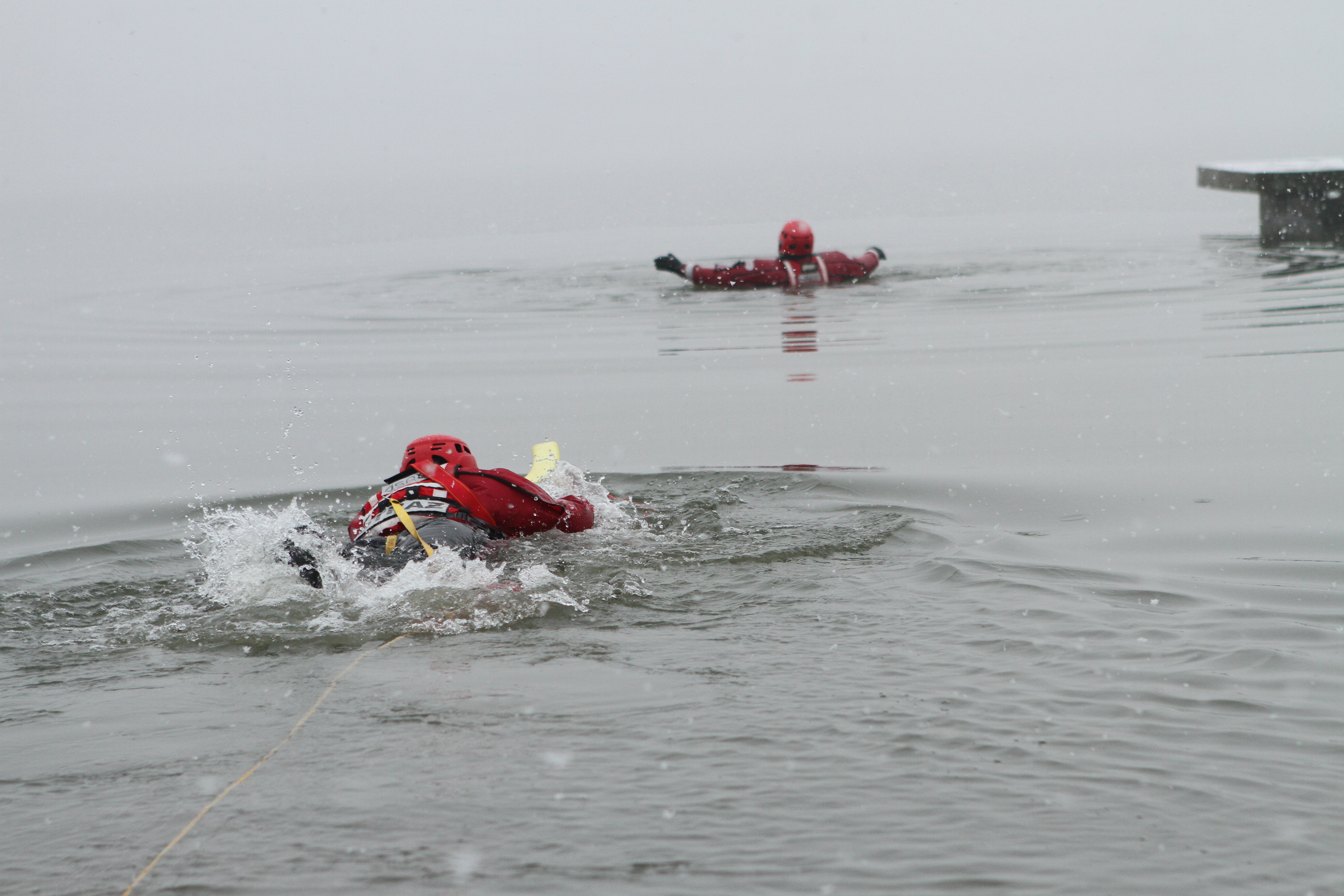 przygotowania strażaków do działań na otwartych akwenach w trudnych warunkach atmosferycznych (niska temperatura wody, opady śniegu, wiatr),