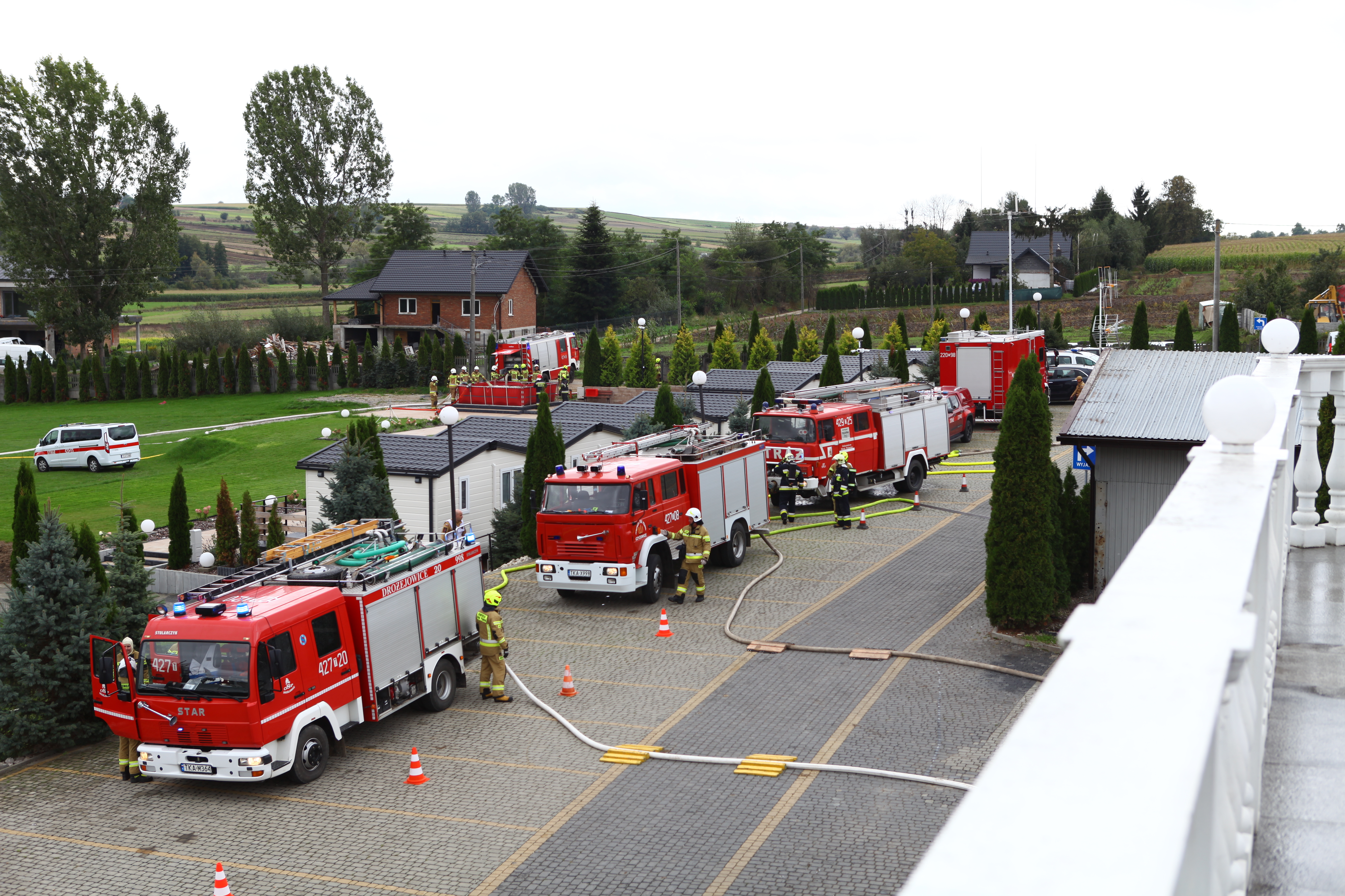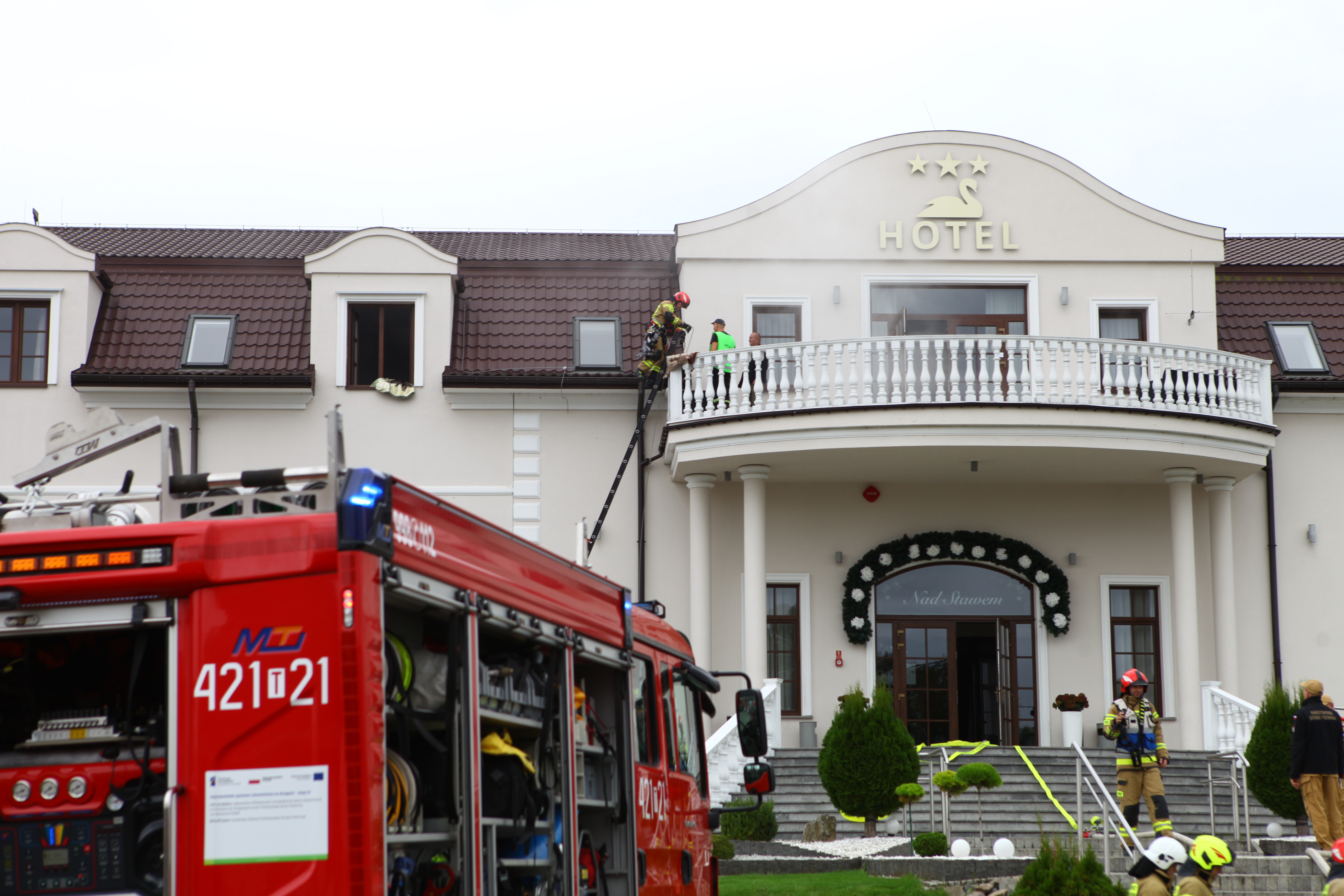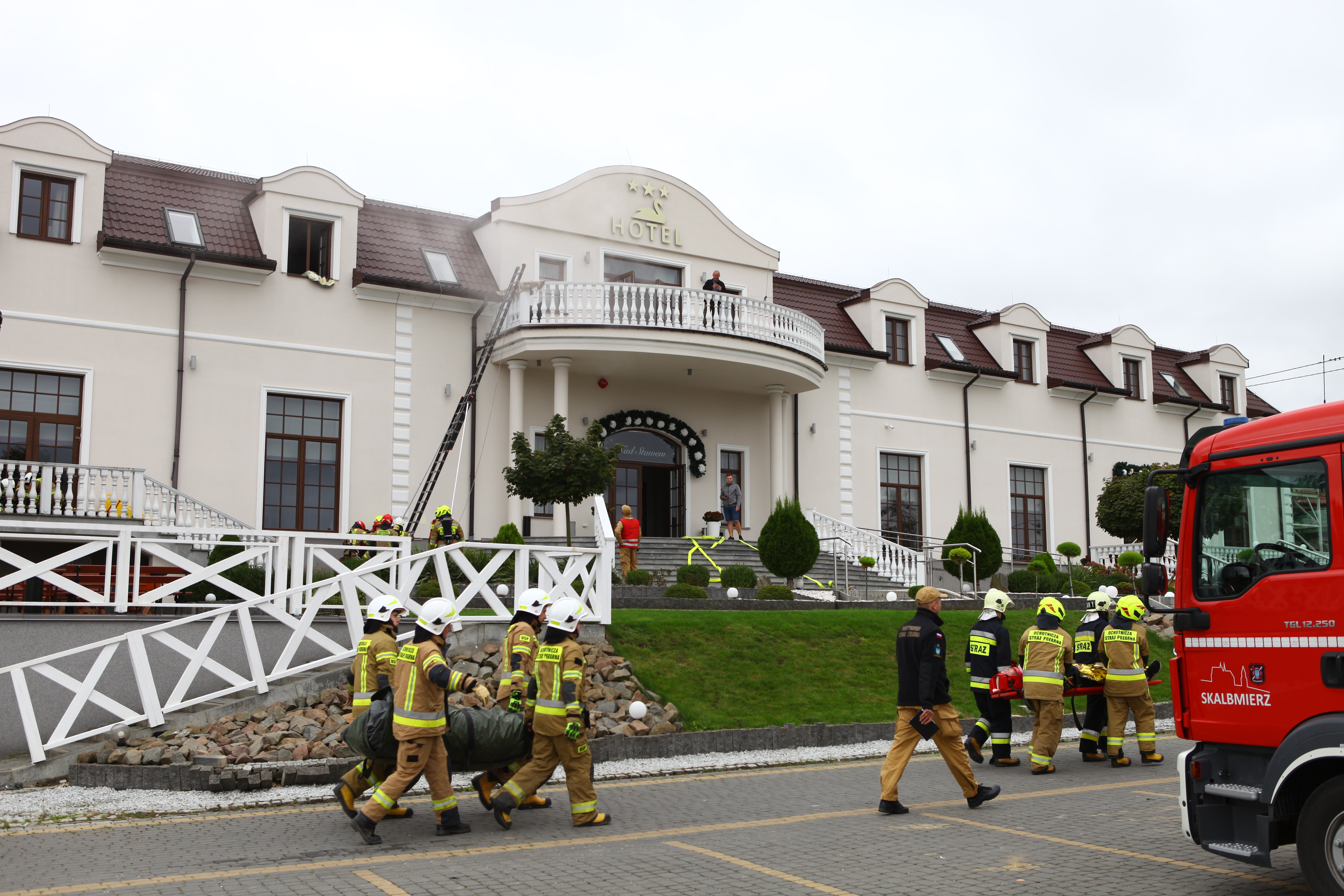 Dom Weselny „Nad Stawem” – pożar części hotelowej na pierwszym piętrze budynku, ewakuacja osób poszkodowanych przy pomocy drabin przystawnych oraz podnośnika SHD23.