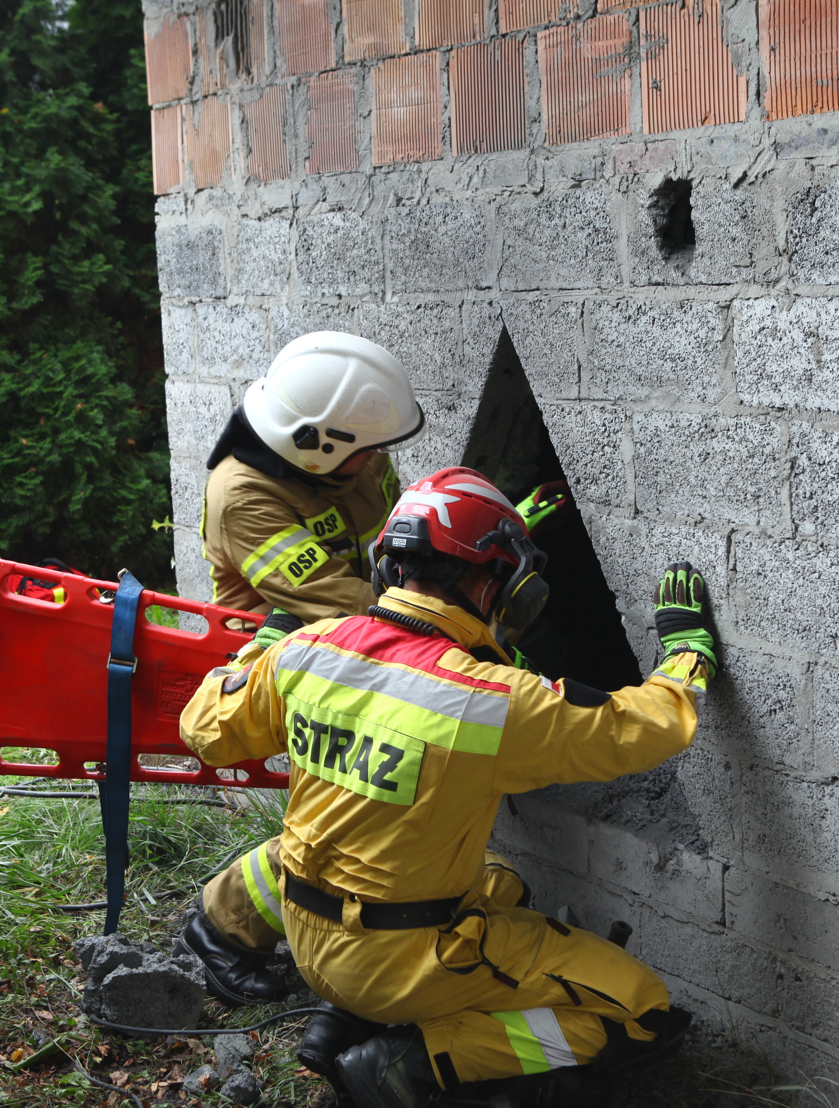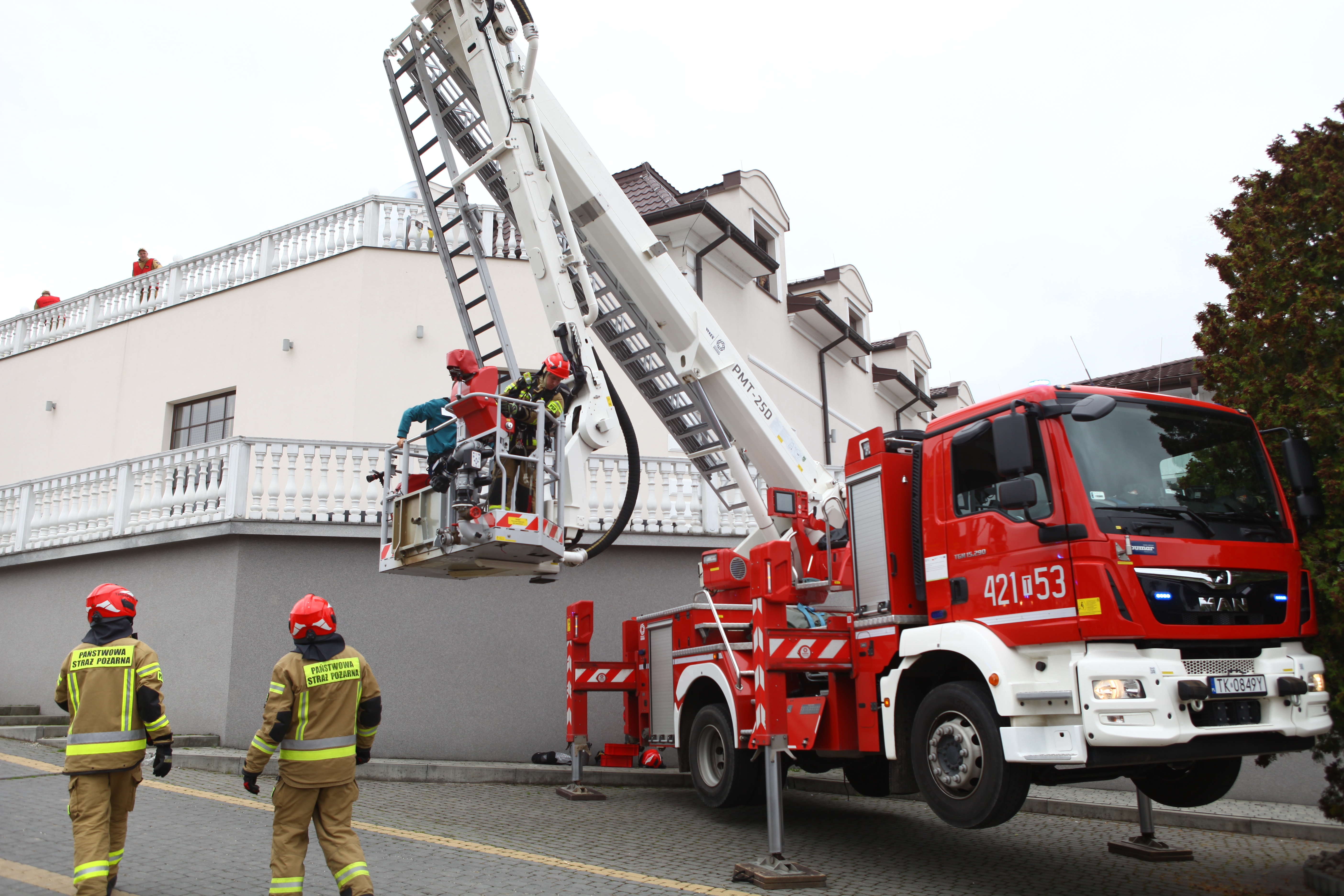 - praktyczne sprawdzenie możliwości prowadzenia ewakuacji osób przy pomocy drabin przystawnych i podnośnika hydraulicznego SHD23,