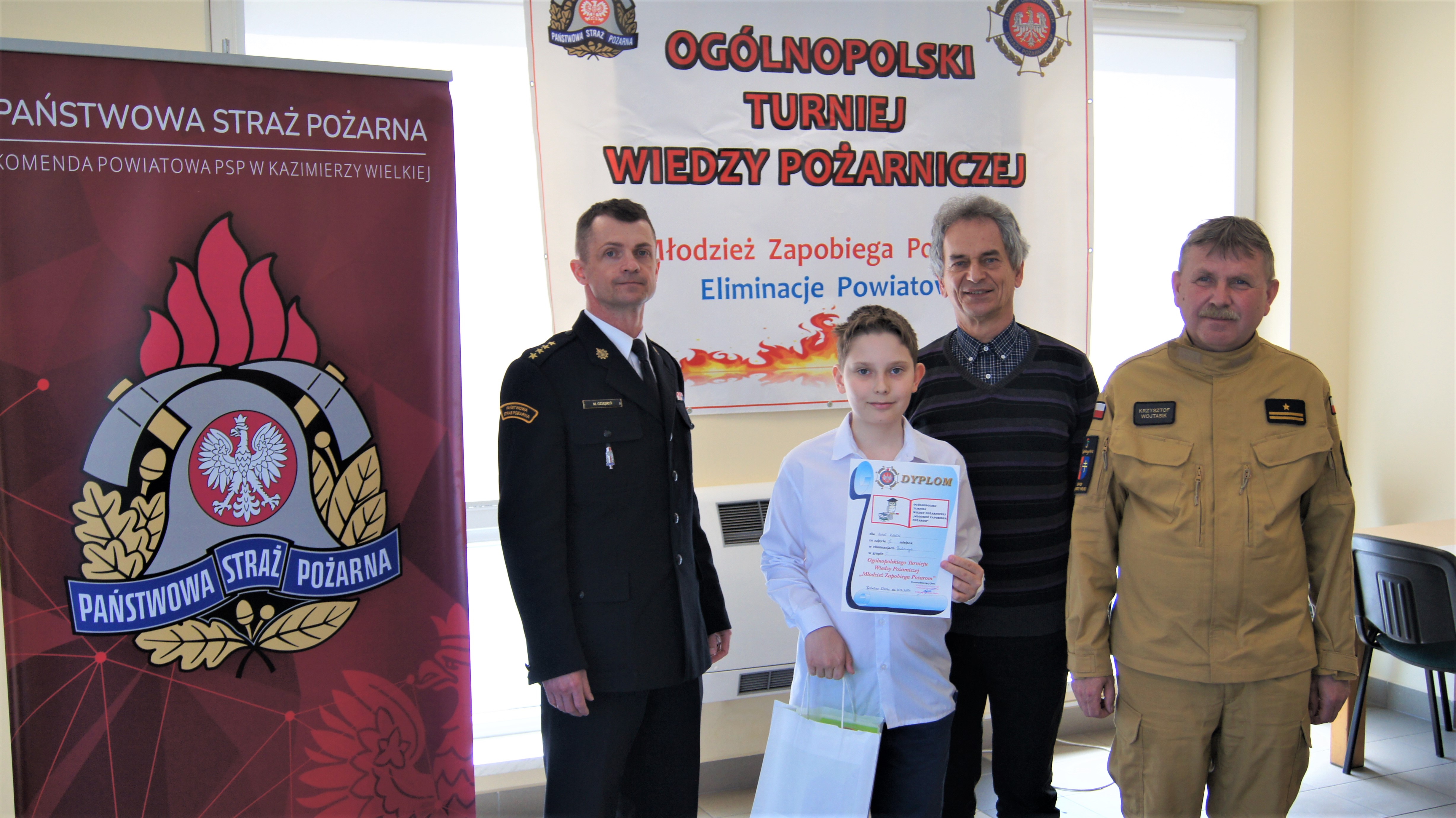Dyplomy oraz nagrody wręczyli Komendant Powiatowy PSP st. kpt. Marcin Oziębło, Sekretarz Powiatu Kazimierskiego Pan Marek Krupa. Komendant dziękując nauczycielom za przygotowanie i wspieranie uczniów do turnieju podkreślił, iż cieszy fakt, że nasza młodzież jest należycie przygotowana do konkursów oraz życzył zakwalifikowanym finalistom dalszych sukcesów w eliminacjach wojewódzkich.