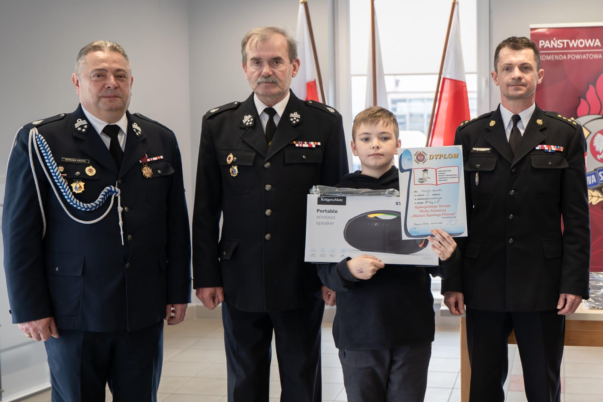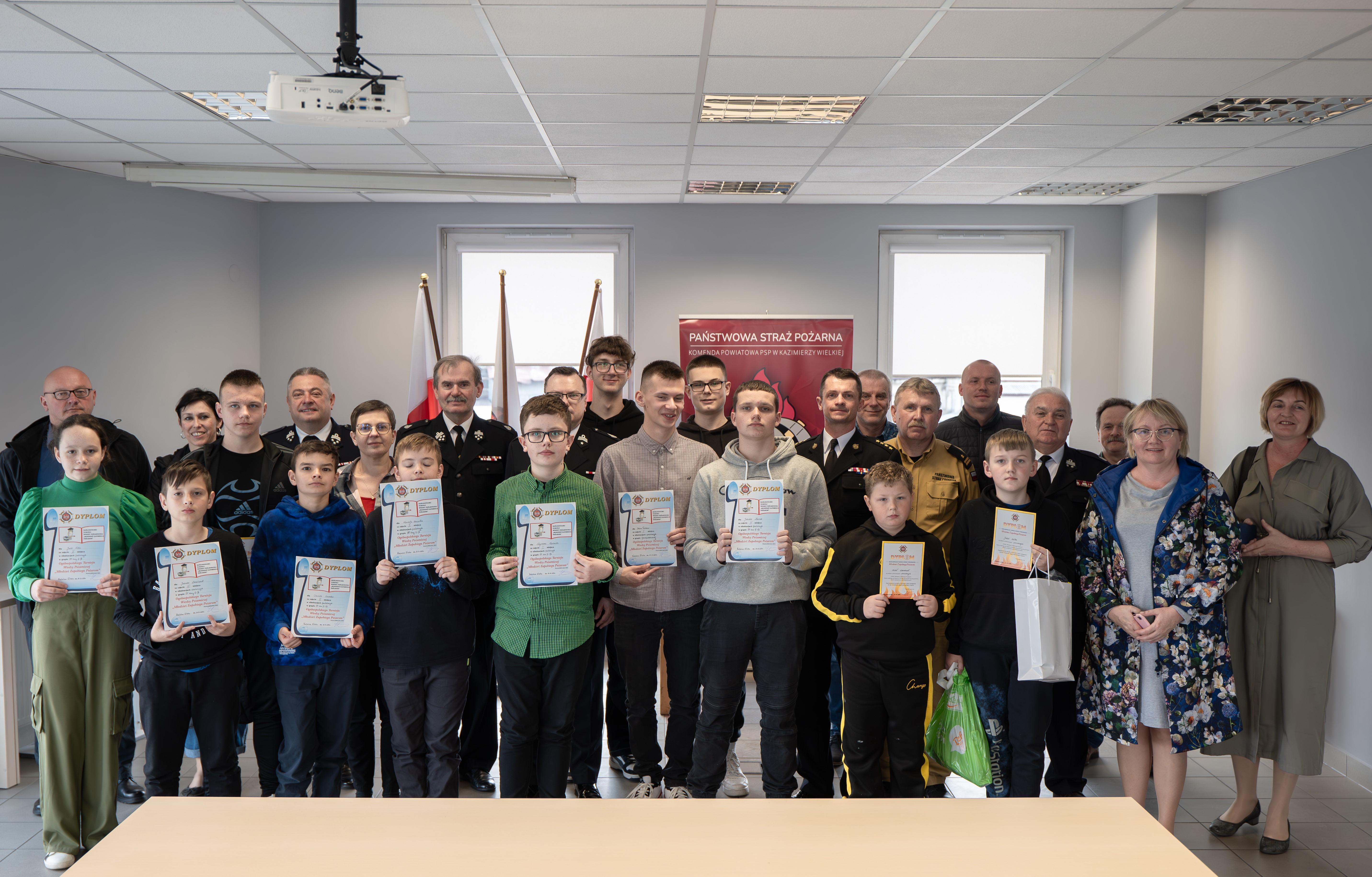 Dyplomy oraz nagrody wręczyli: Jan Nowak-Prezes Zarządu Oddziału Powiatowego Związku Ochotniczych Straży Pożarnych RP w Kazimierzy Wielkiej jednocześnie starosta kazimierski oraz Komendant Powiatowy PSP st. kpt. Marcin Oziębło jednocześnie V-ce Prezes Zarządu Oddziału Powiatowego Związku Ochotniczych Straży Pożarnych RP w Kazimierzy Wielkiej.