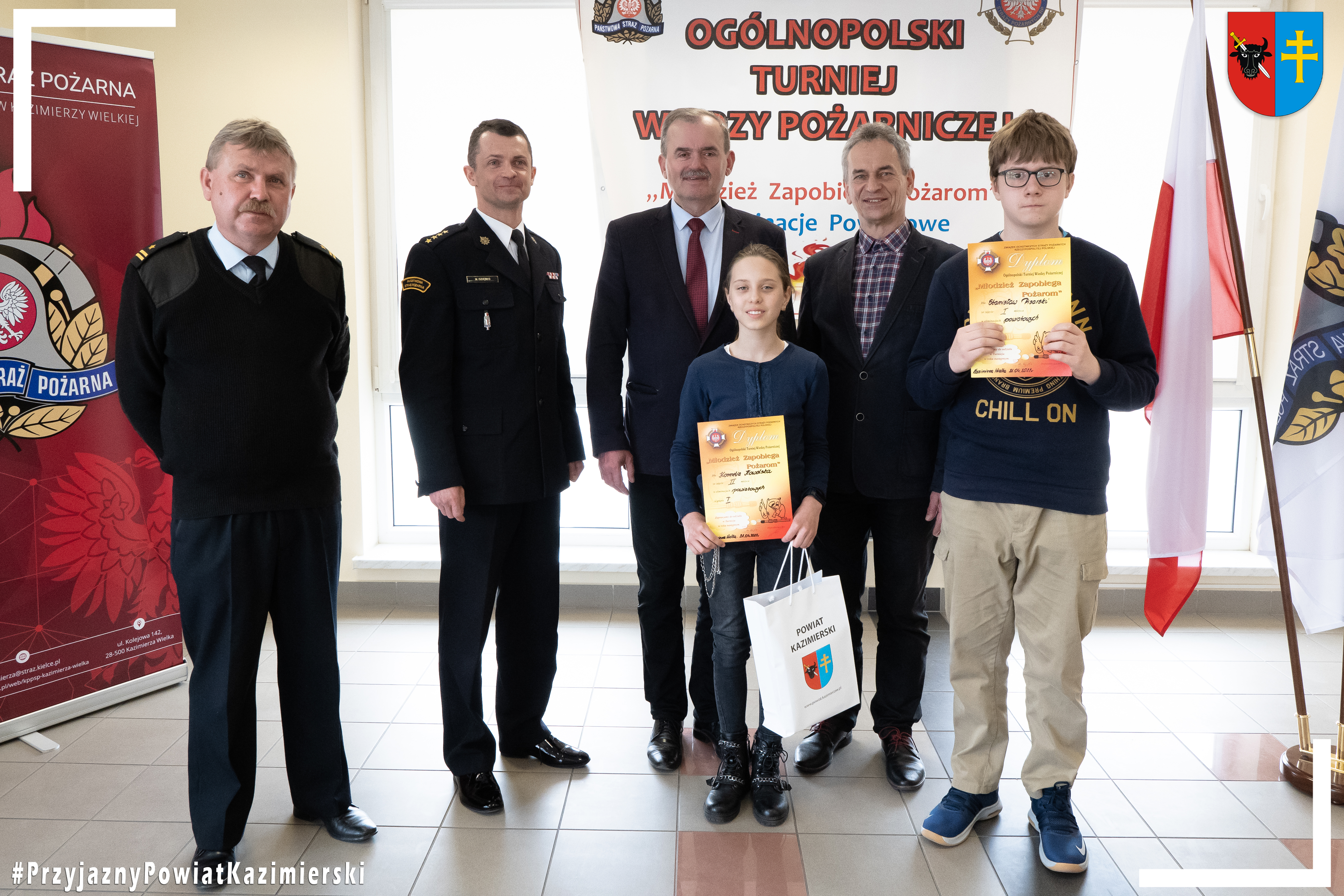 Dyplomy oraz nagrody wręczyli Komendant Powiatowy PSP st. kpt. Marcin Oziębło, Prezes Zarządu Oddziału Związku OSP RP, a zarazem Starosta Kazimierski dh Jan Nowak, mł. bryg. Krzysztof Wojtasik. Komendant dziękując nauczycielom za przygotowanie i wspieranie uczniów do turnieju podkreślił, iż cieszy fakt, że nasza młodzież jest należycie przygotowana do konkursów oraz życzył zakwalifikowanym finalistom dalszych sukcesów w eliminacjach wojewódzkich, które odbędą się w Kielcach.