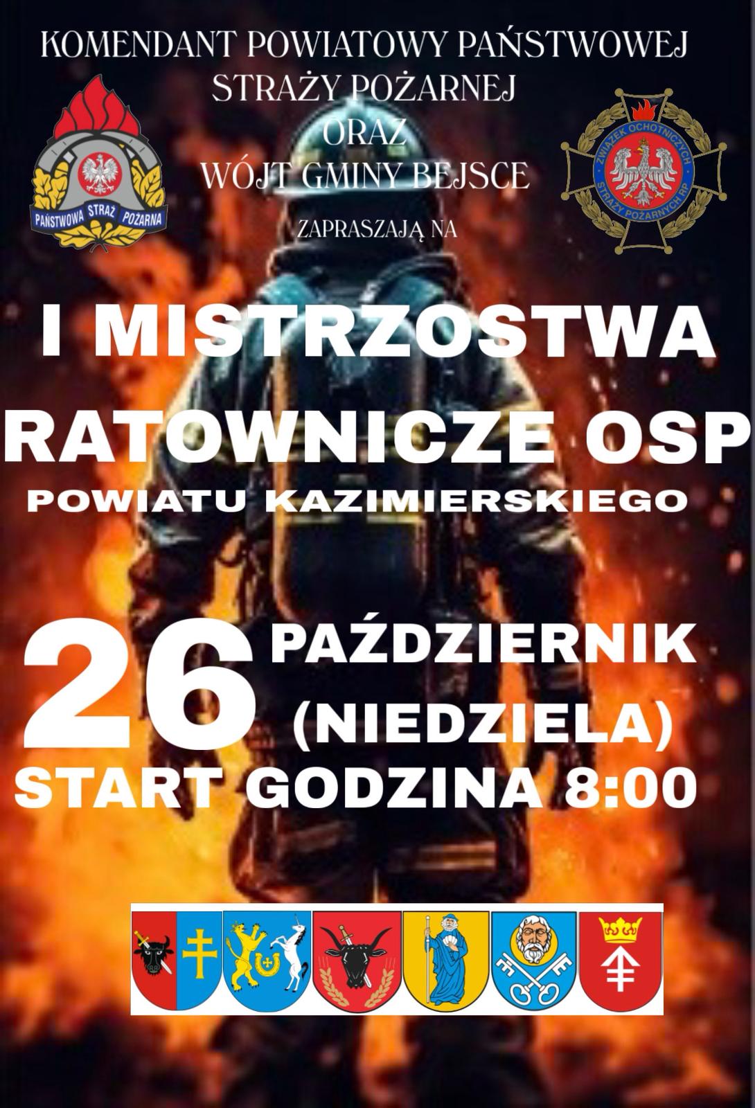 W dniu 26 października 2025 roku zostaną zorganizowane I Mistrzostwa w Ratownictwie dla jednostek Ochotniczych Straży Pożarnych z terenu powiatu kazimierskiego. Organizatorem mistrzostw jest komendant powiatowy PSP w Kazimierzy Wielkiej bryg. Krzysztof Jach oraz Wójt Gminy Bejsce Edward Krupa. Zmagania rozpoczną się o godzinie 8:00 na placu KP PSP Kazimierza Wielka. Kolejne zadania będą realizowane na terenie gminy Bejsce. Zapraszamy do udziału wszystkie jednostki OSP włączone do KSRG jak i te nie włączone. Regulamin mistrzostw oraz karty zgłoszeniowe zostaną wysłane do właściwych Urzędów Gmin, które prześlą je prezesom lub naczelnikom jednostek OSP.